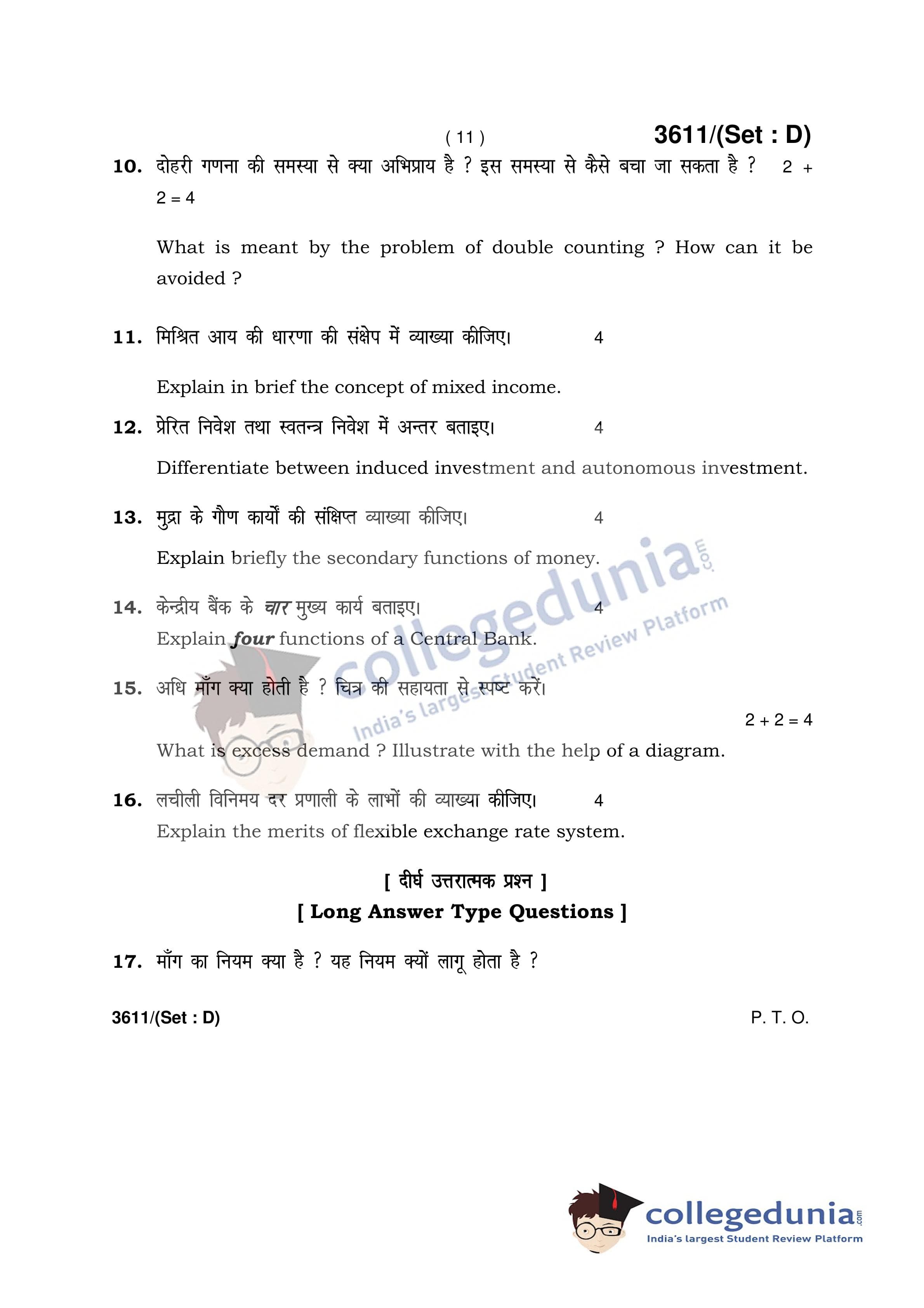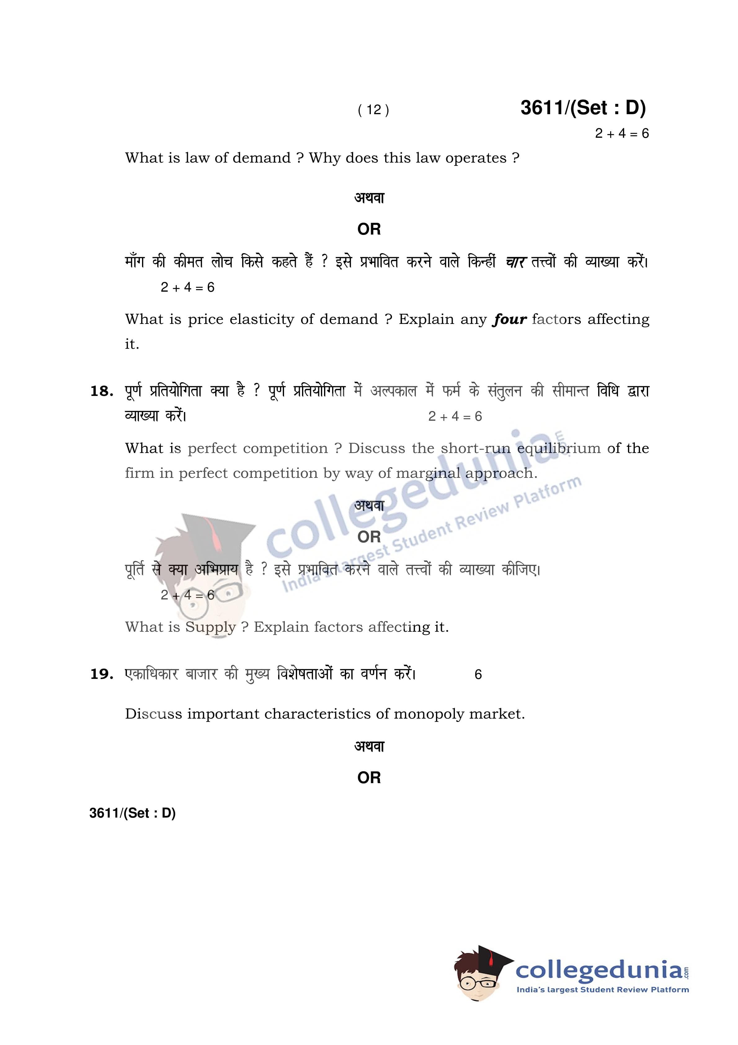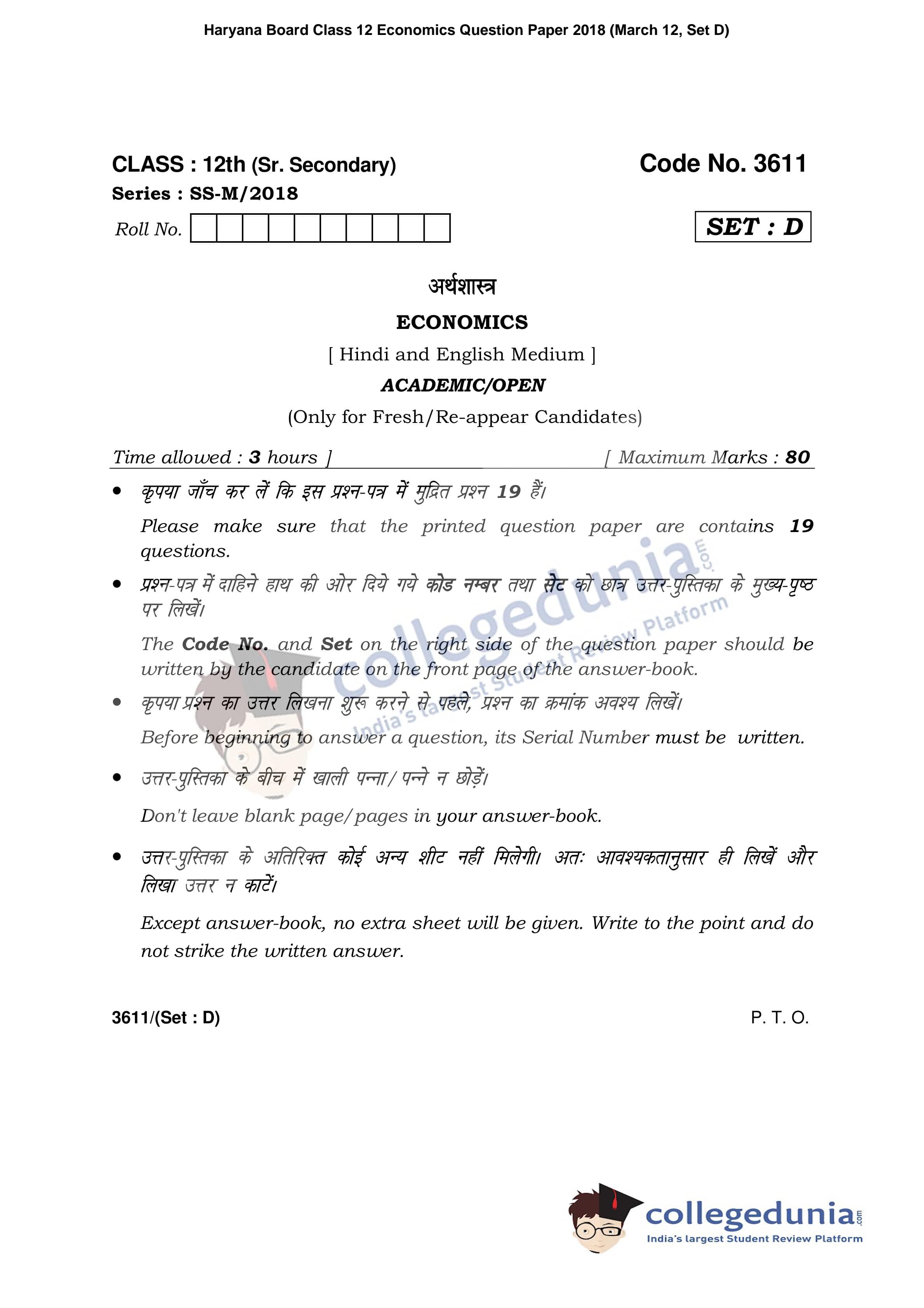 HBSE Class 12 Economics Set D Question Paper 2018 with Answer Key (March 12)