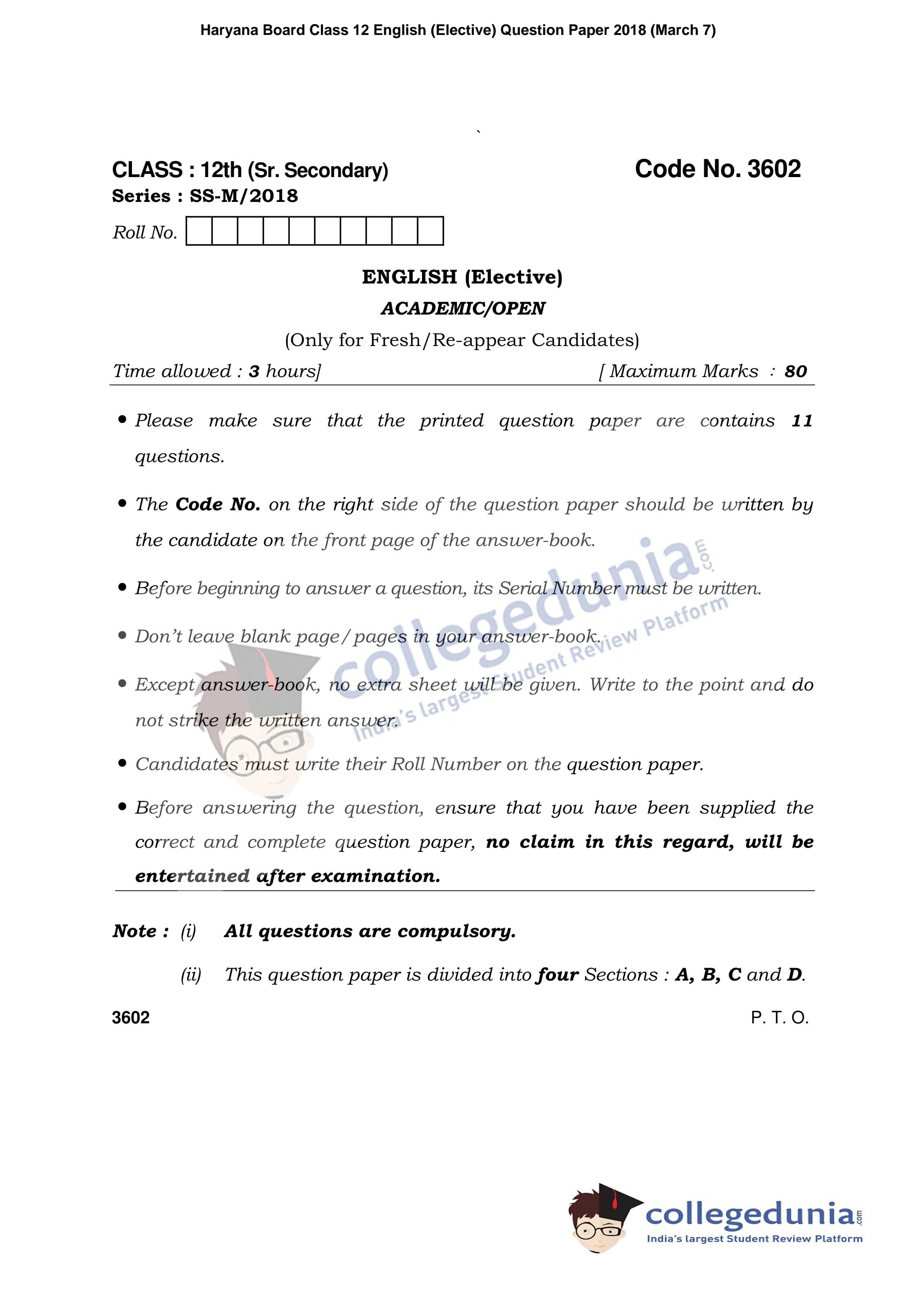 HBSE Class 12 English (Elective) Question Paper 2018 with Answer Key (March 7)