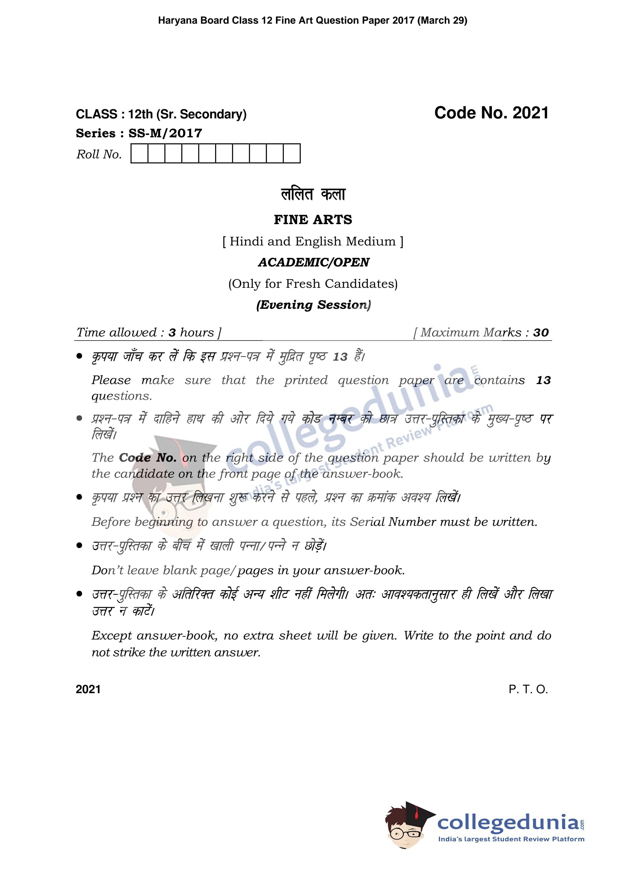 HBSE Class 12 Fine Art Question Paper 2017 with Answer Key is available for download. The exam was conducted by the Board of School Education Haryana on March 29, 2017 in the Afternoon Session 2 PM to 4:30 PM. The medium of paper was English and Hindi. The question paper comprised a total of 13 questions.