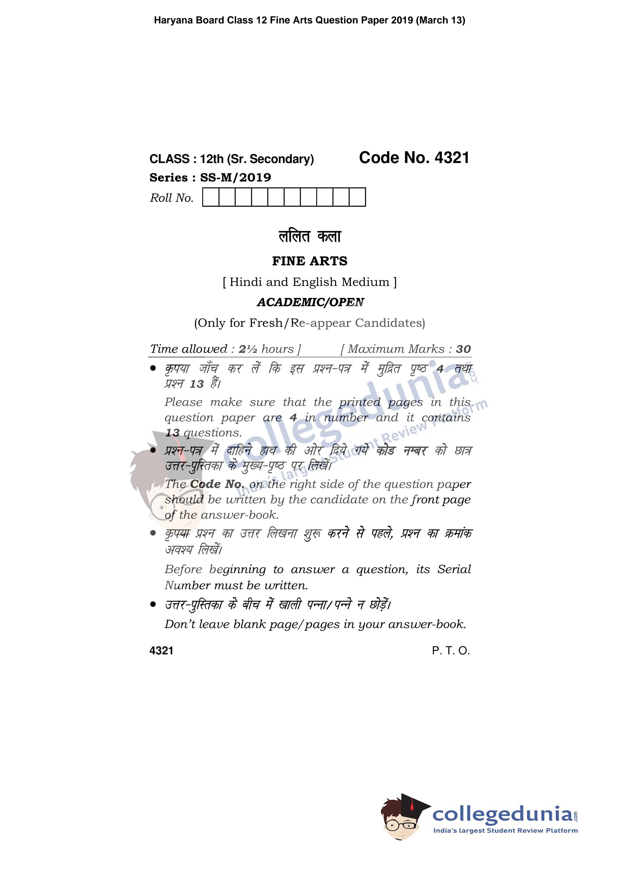 HBSE Class 12 Fine Arts Question Paper 2019 with Answer Key is available for download. The exam was conducted by the Board of School Education Haryana on March 13, 2019 in the Afternoon Session 12:30 PM to 3:30 PM. The medium of paper was English and Hindi. The question paper comprised a total of 13 questions.