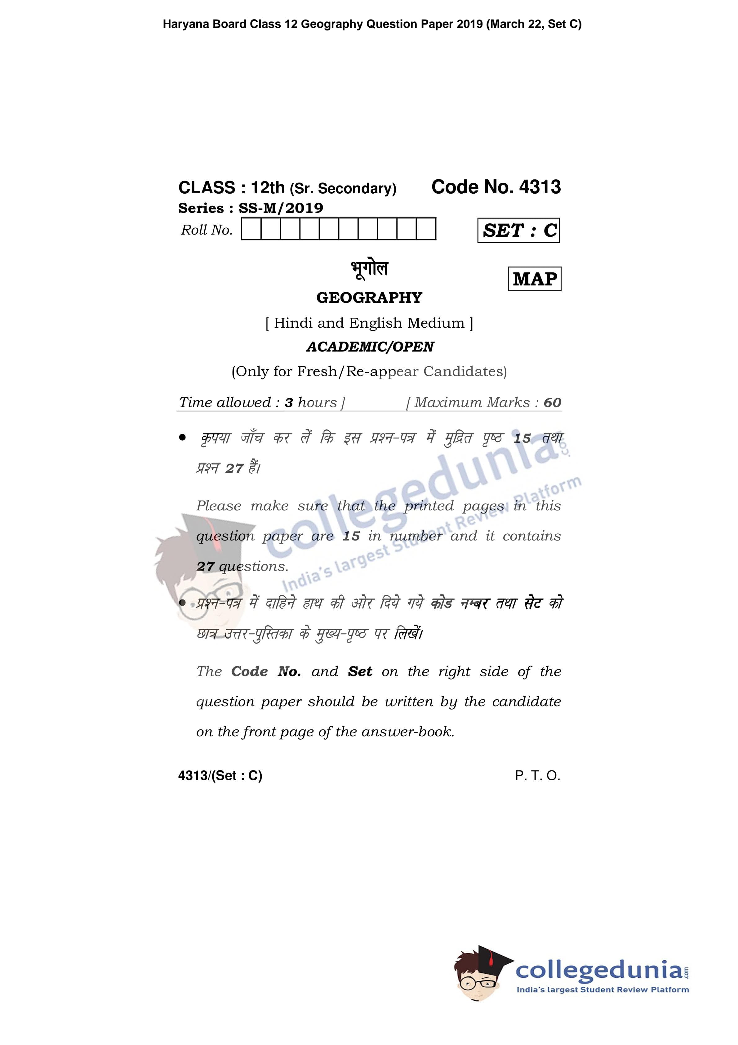 HBSE Class 12 Geography Question Paper 2019 with Answer Key Set C is available for download. The exam was conducted by the Board of School Education Haryana on March 22, 2019 in the Afternoon Session 12:30 PM to 3:30 PM. The medium of paper was English and Hindi. The question paper comprised a total of 27 questions.