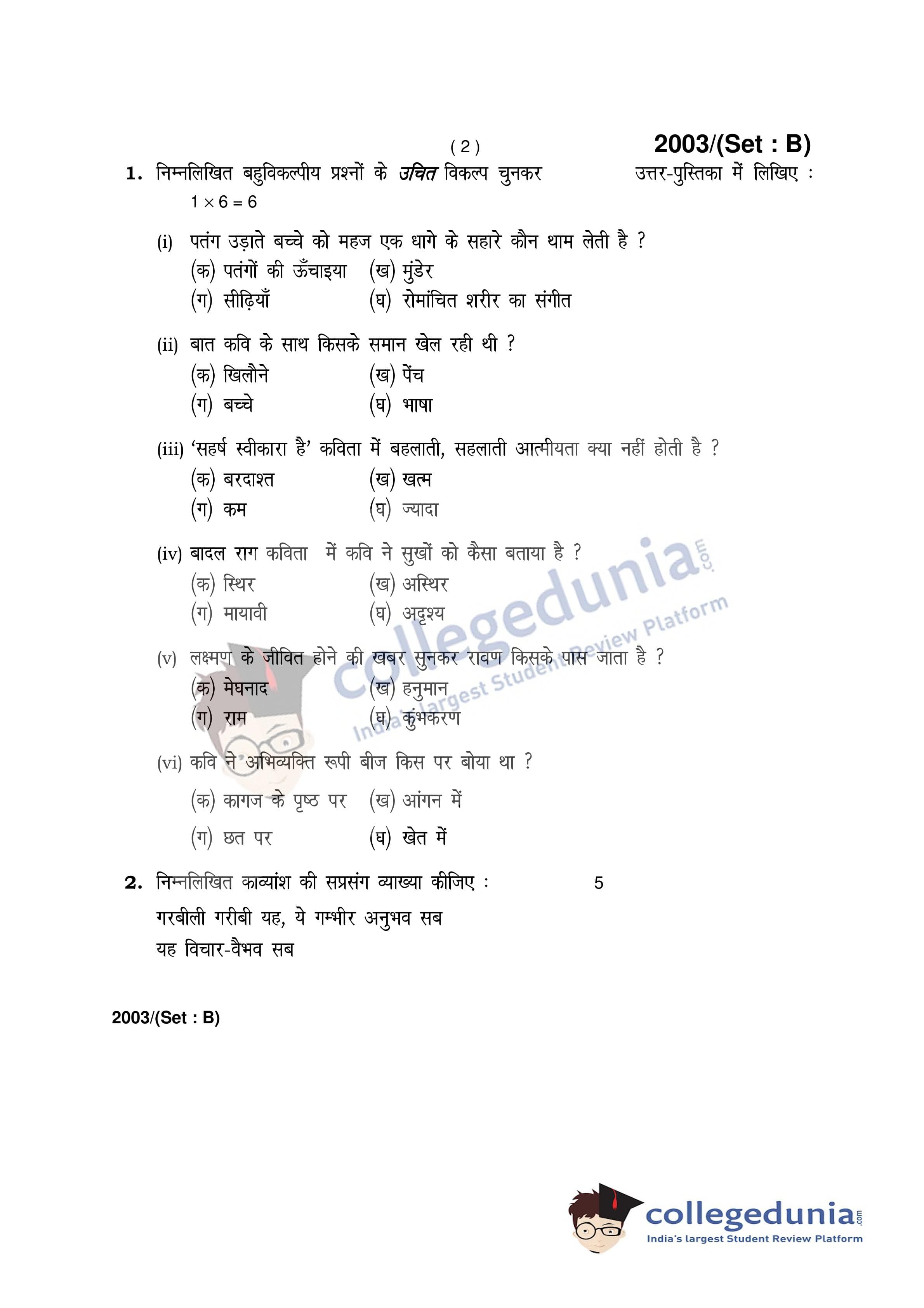 HBSE Class 12 Hindi (Core) Set B Question Paper 2017 with Answer Key (March 14)