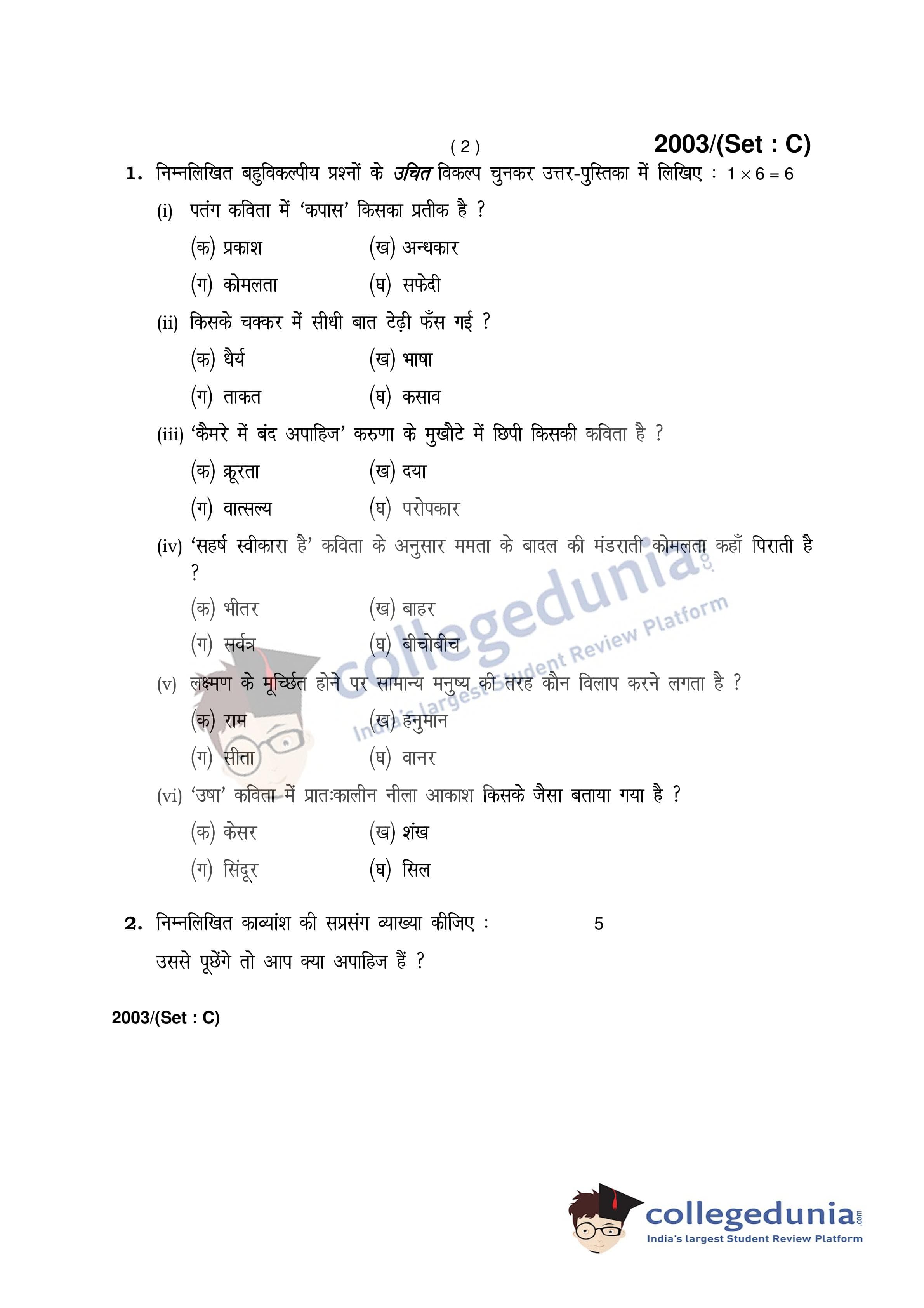 HBSE Class 12 Hindi (Core) Set C Question Paper 2017 with Answer Key (March 14)
