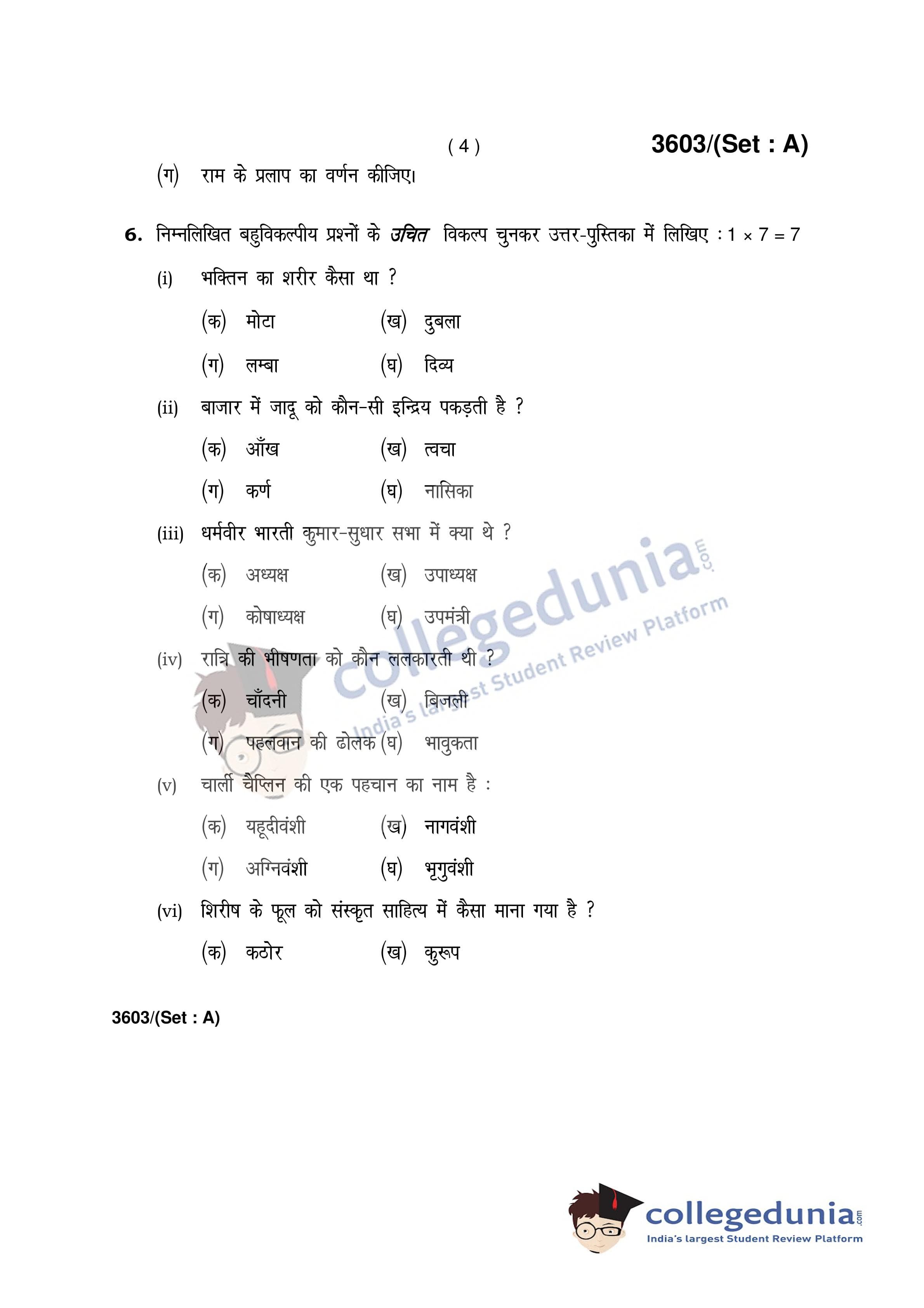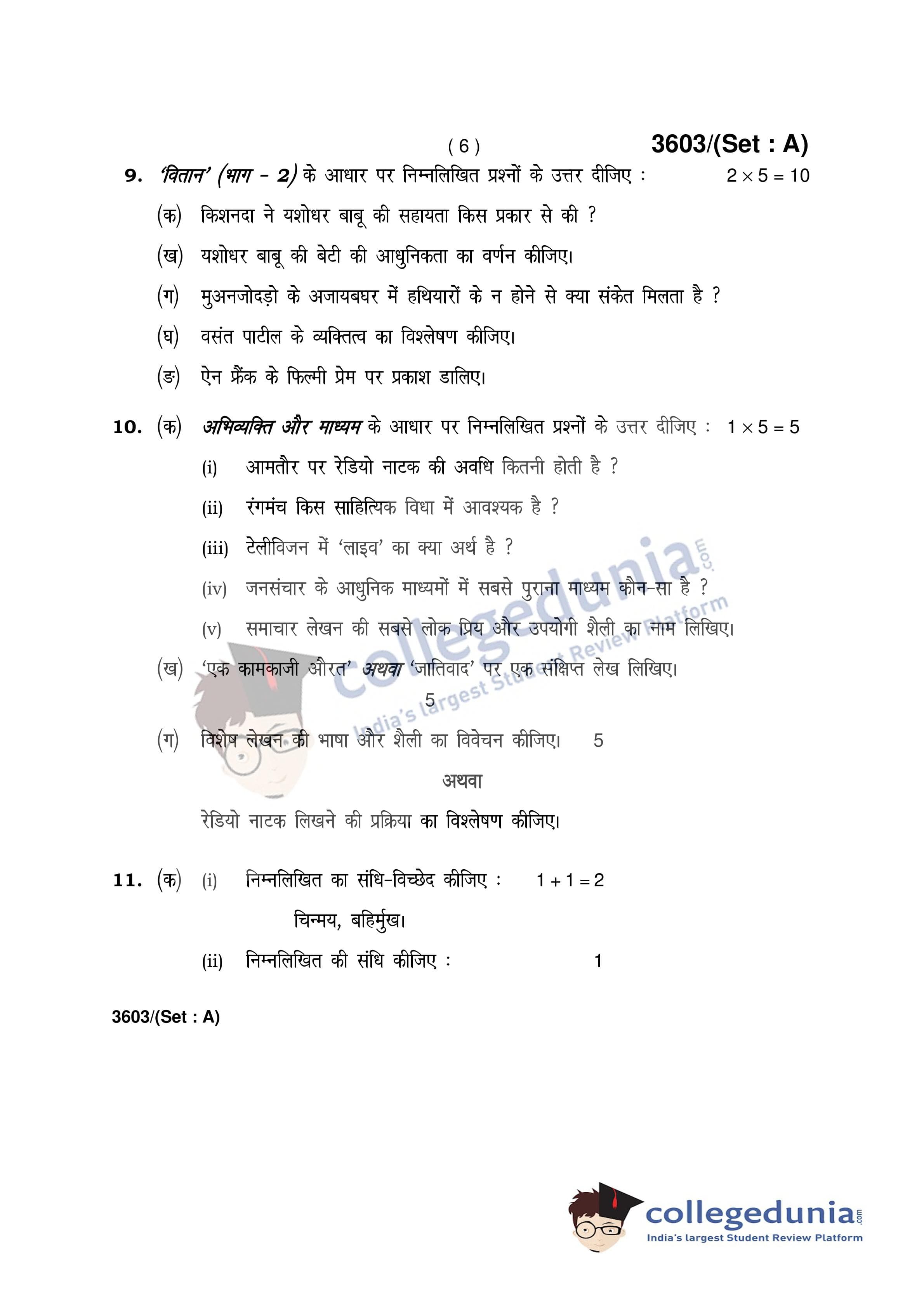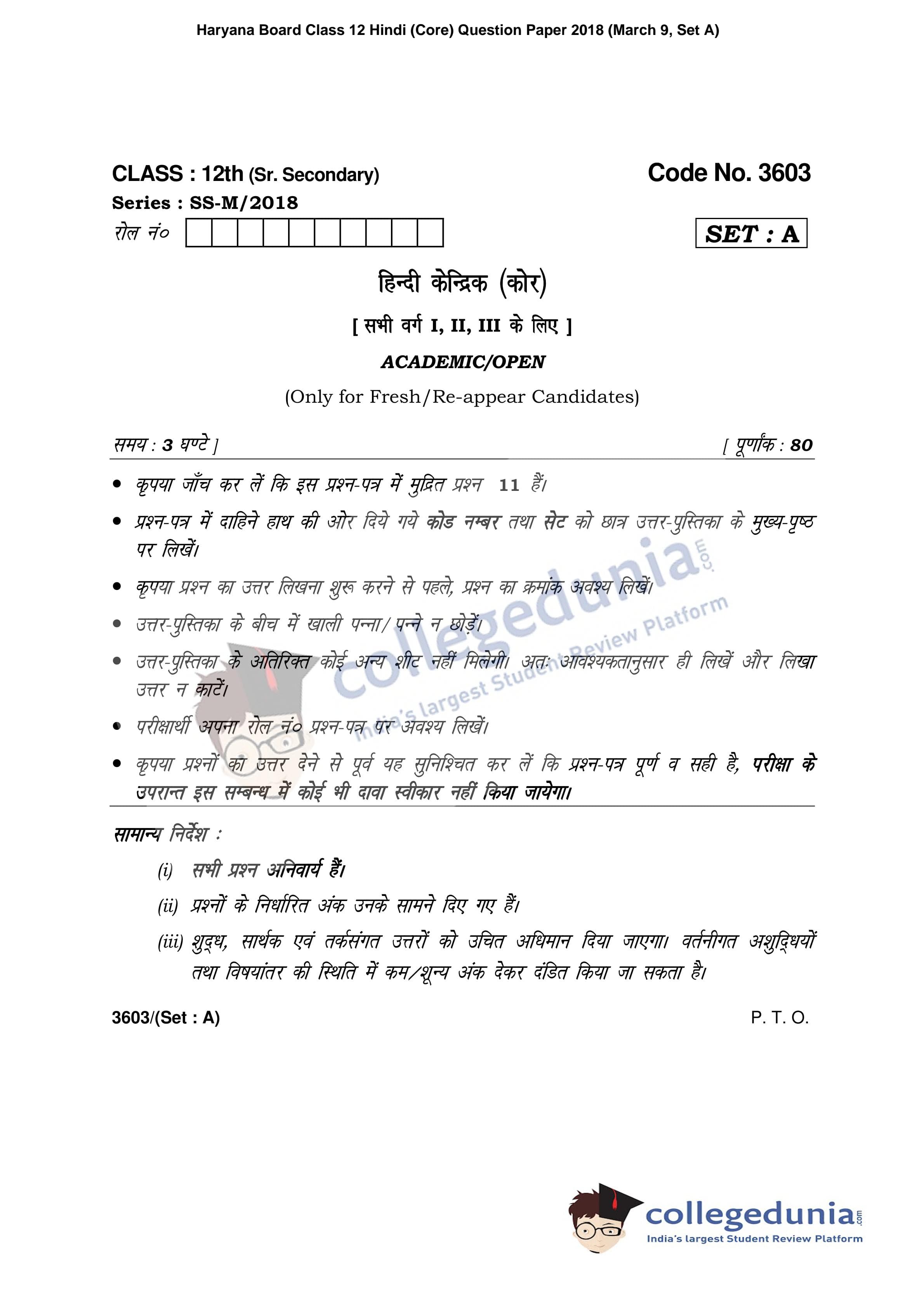 HBSE Class 12 Hindi (Core) Set A Question Paper 2018 with Answer Key (March 9)