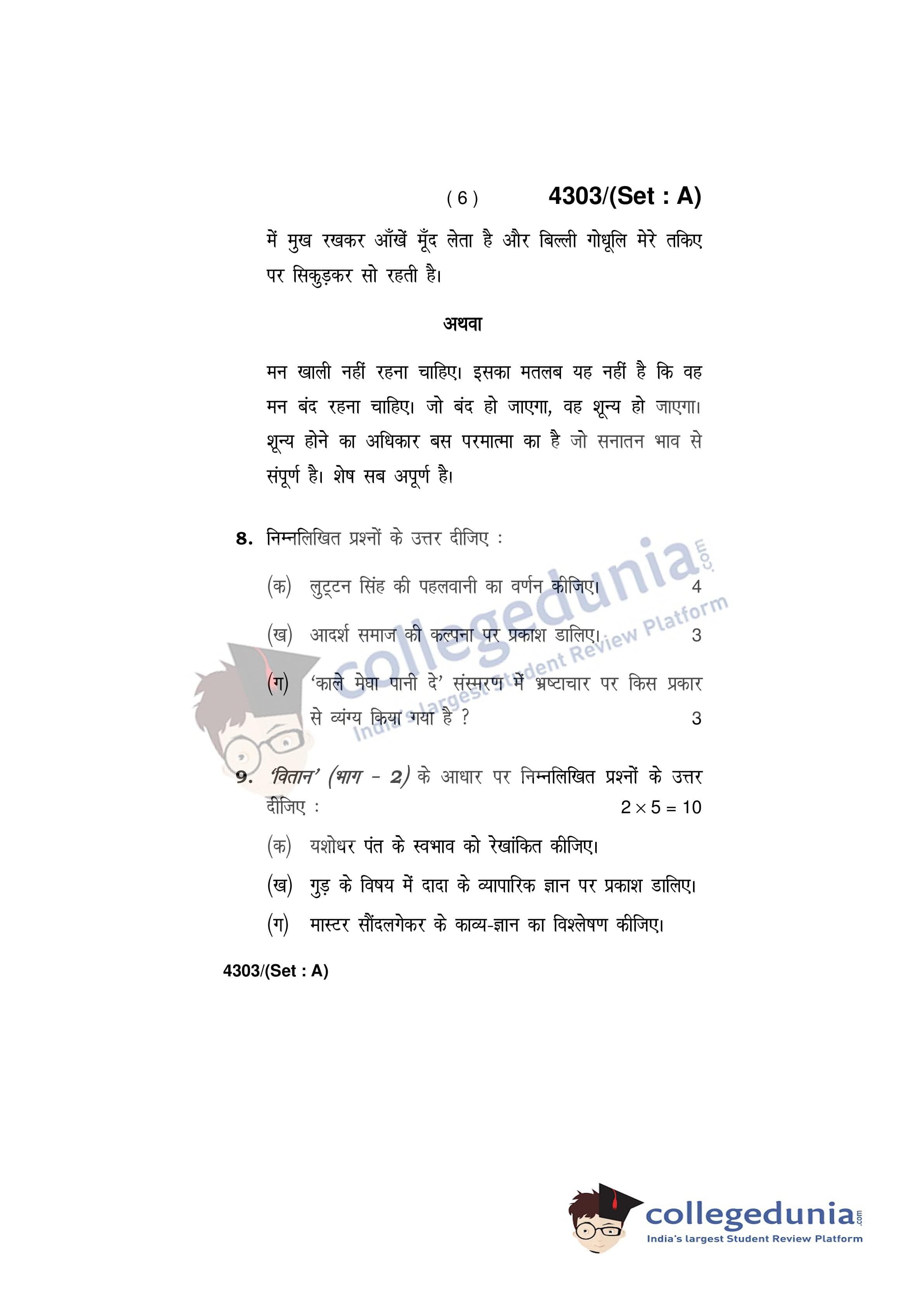 HBSE Class 12 Hindi Core Set A Question Paper 2019 with Answer Key (March 9)