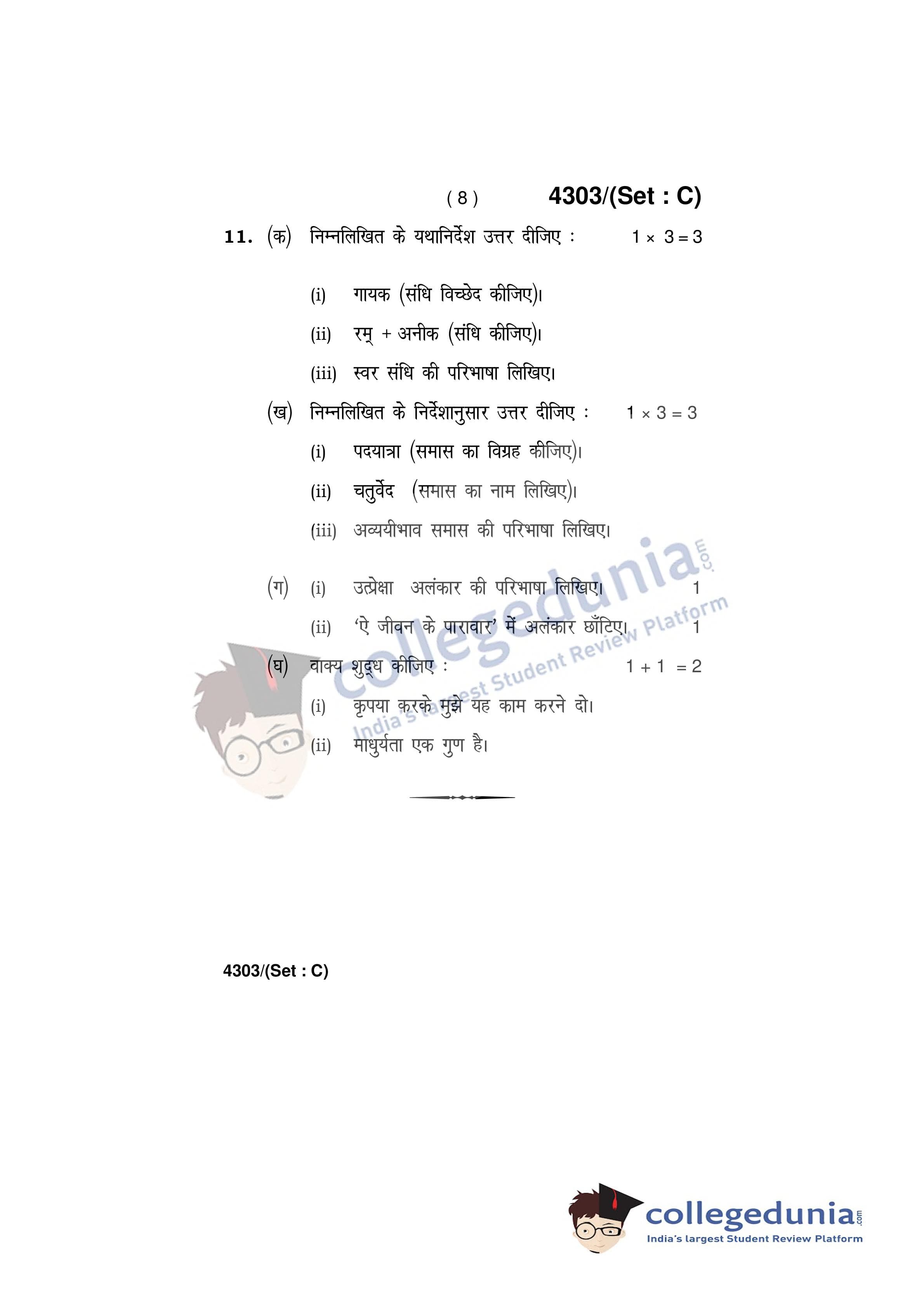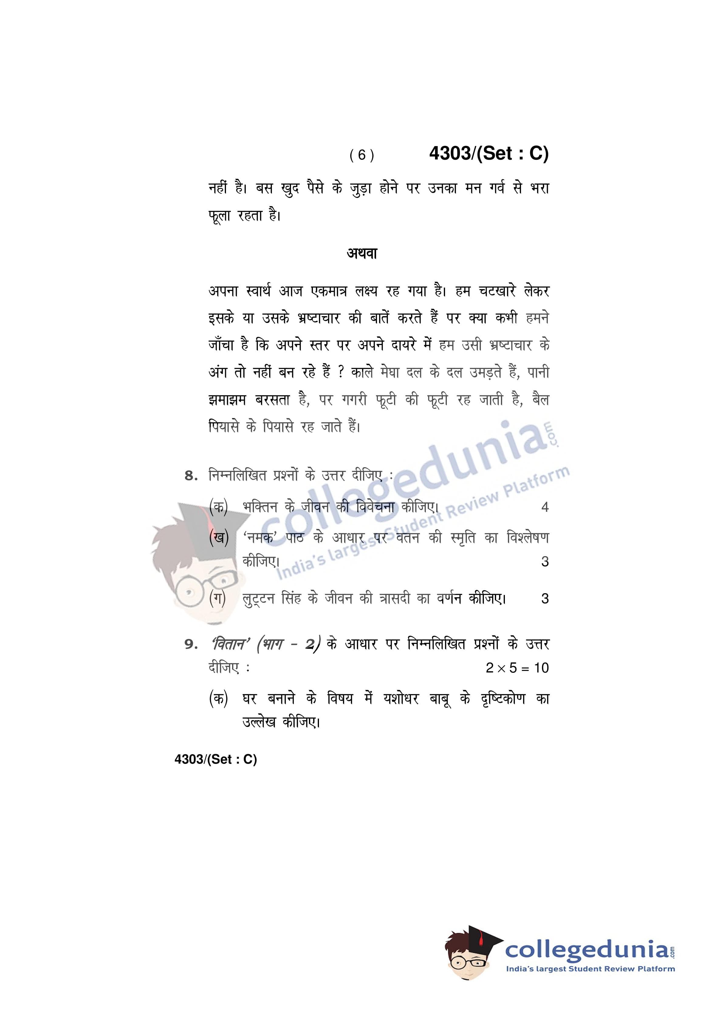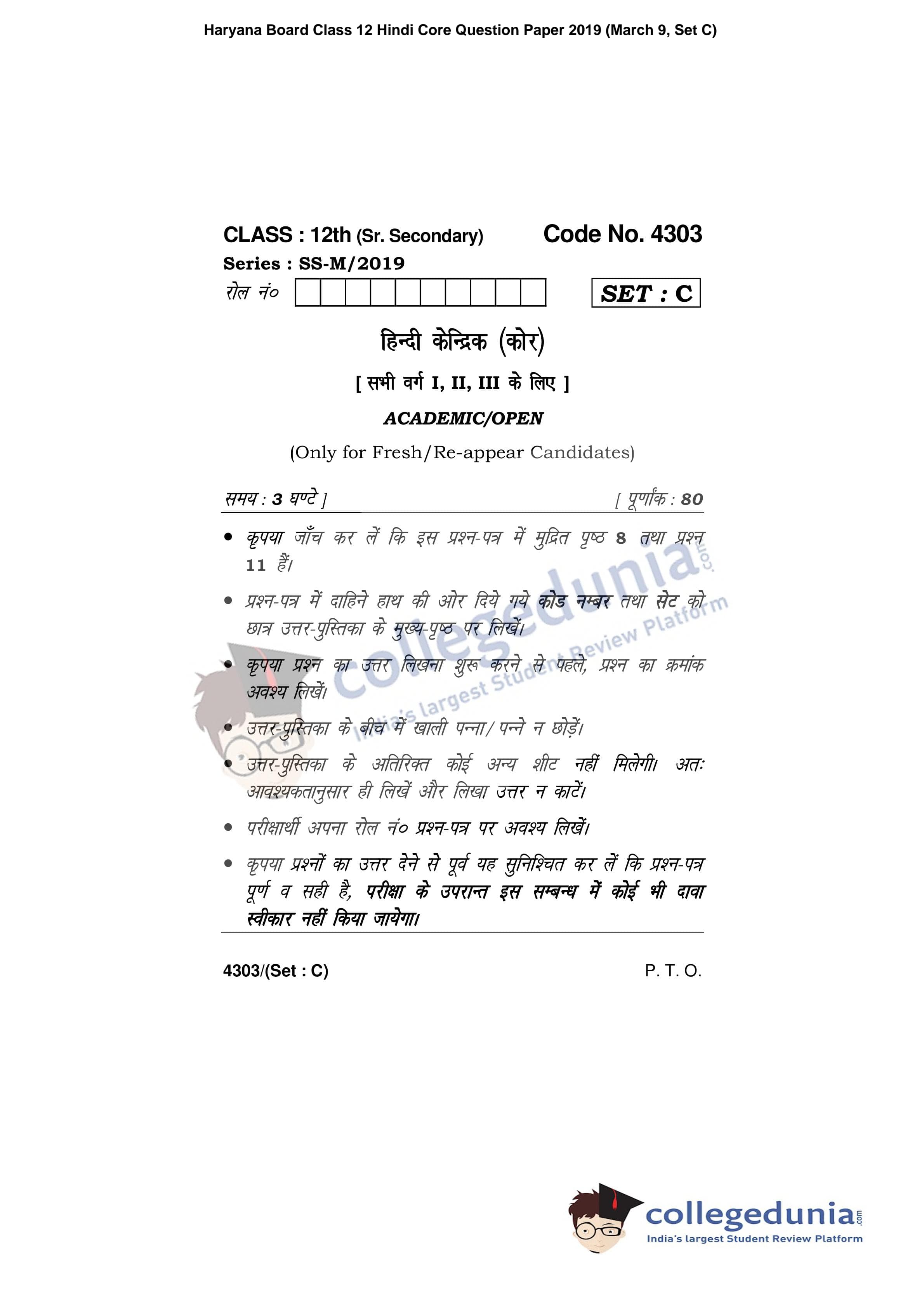 HBSE Class 12 Hindi Core Set C Question Paper 2019 with Answer Key (March 9)
