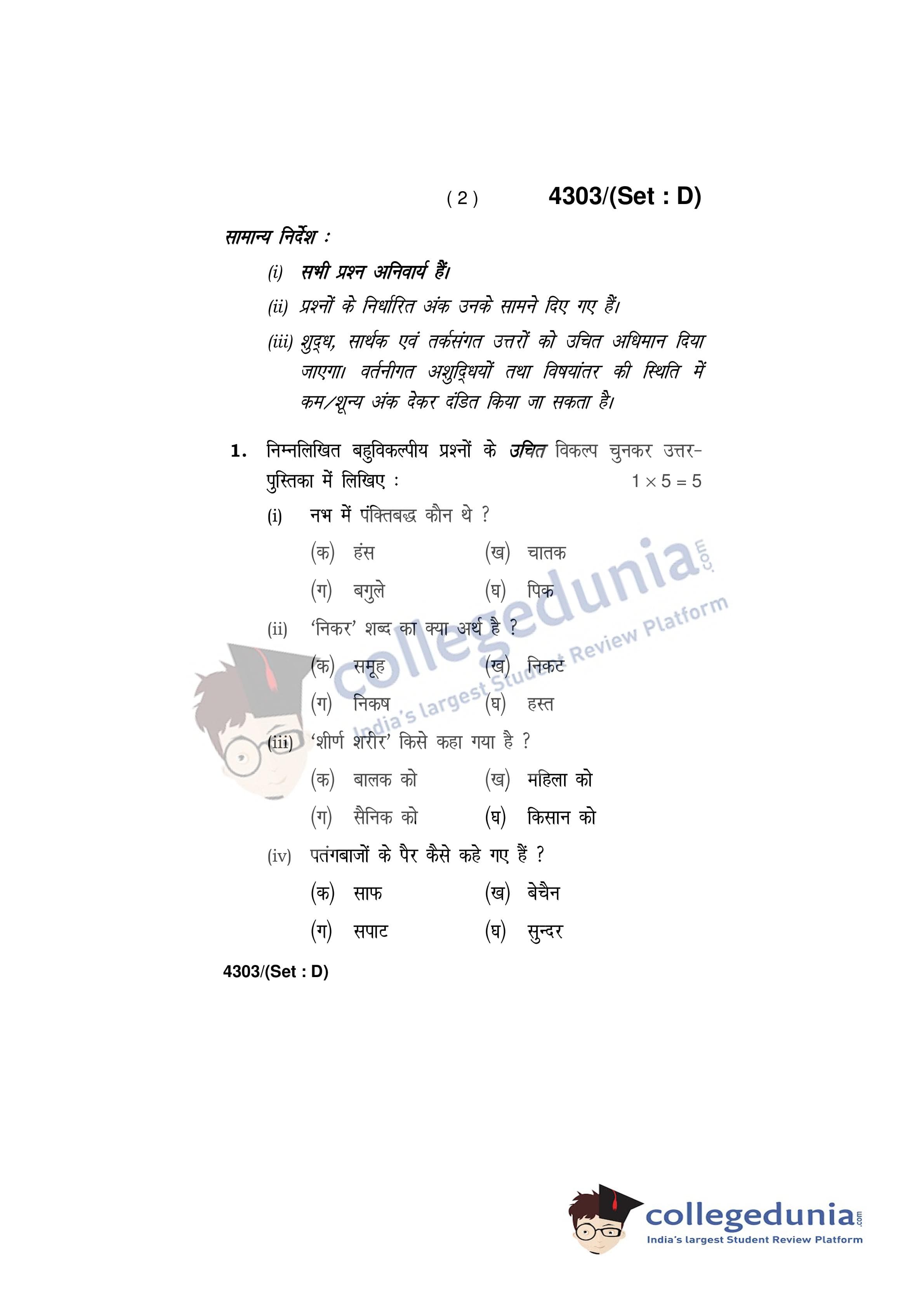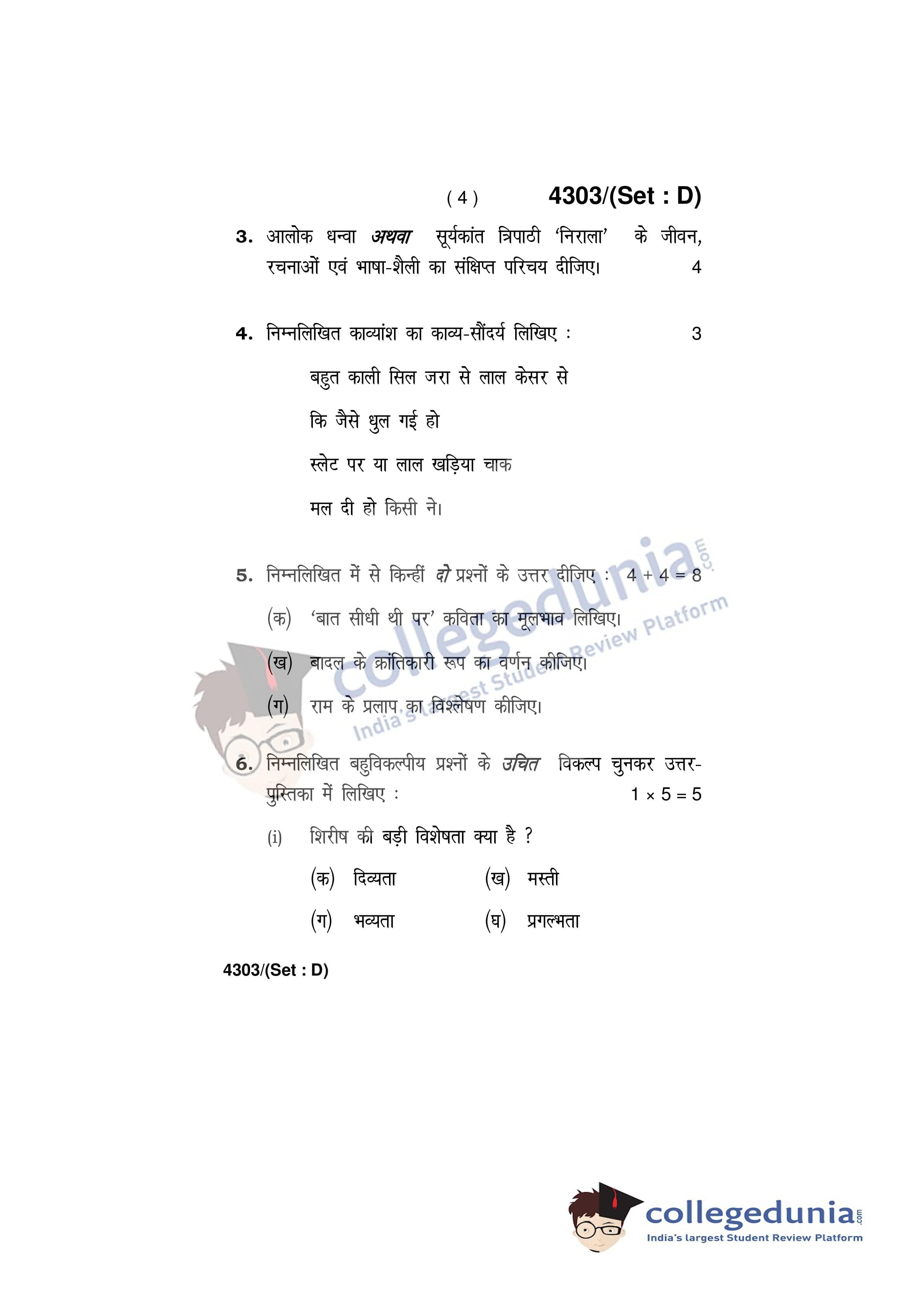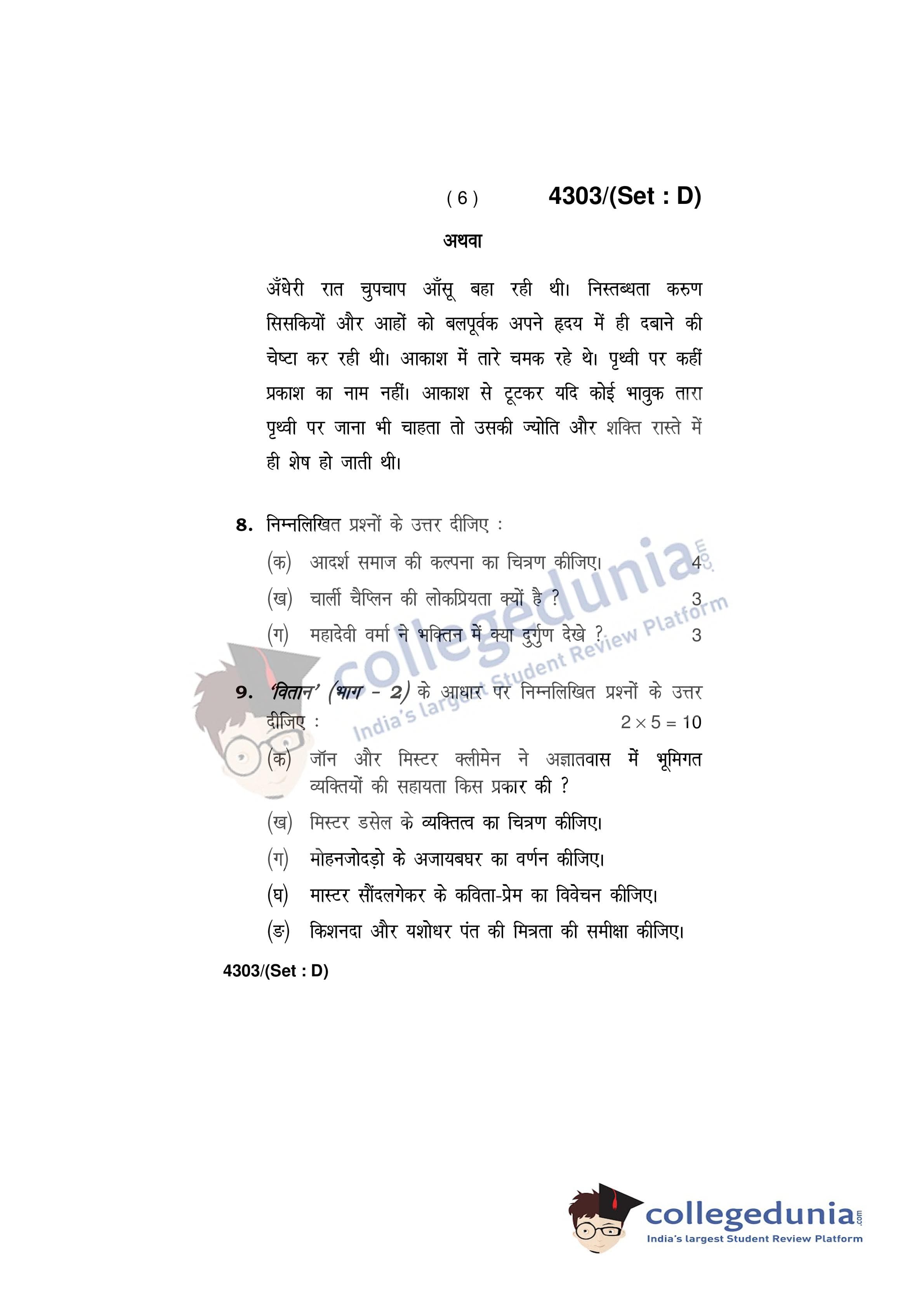HBSE Class 12 Hindi Core Set D Question Paper 2019 with Answer Key (March 9)