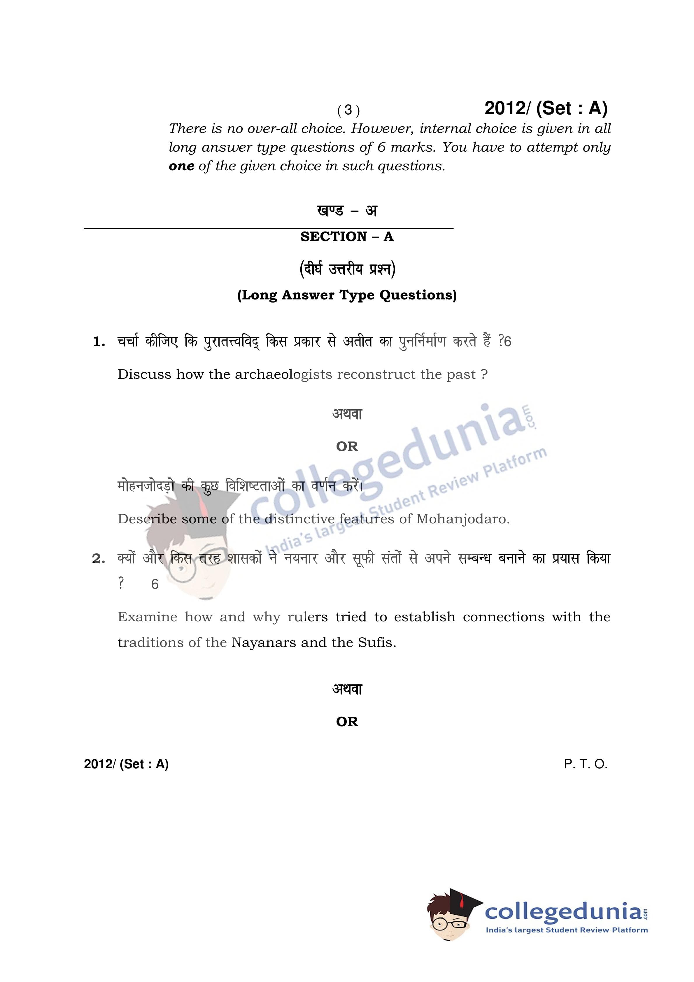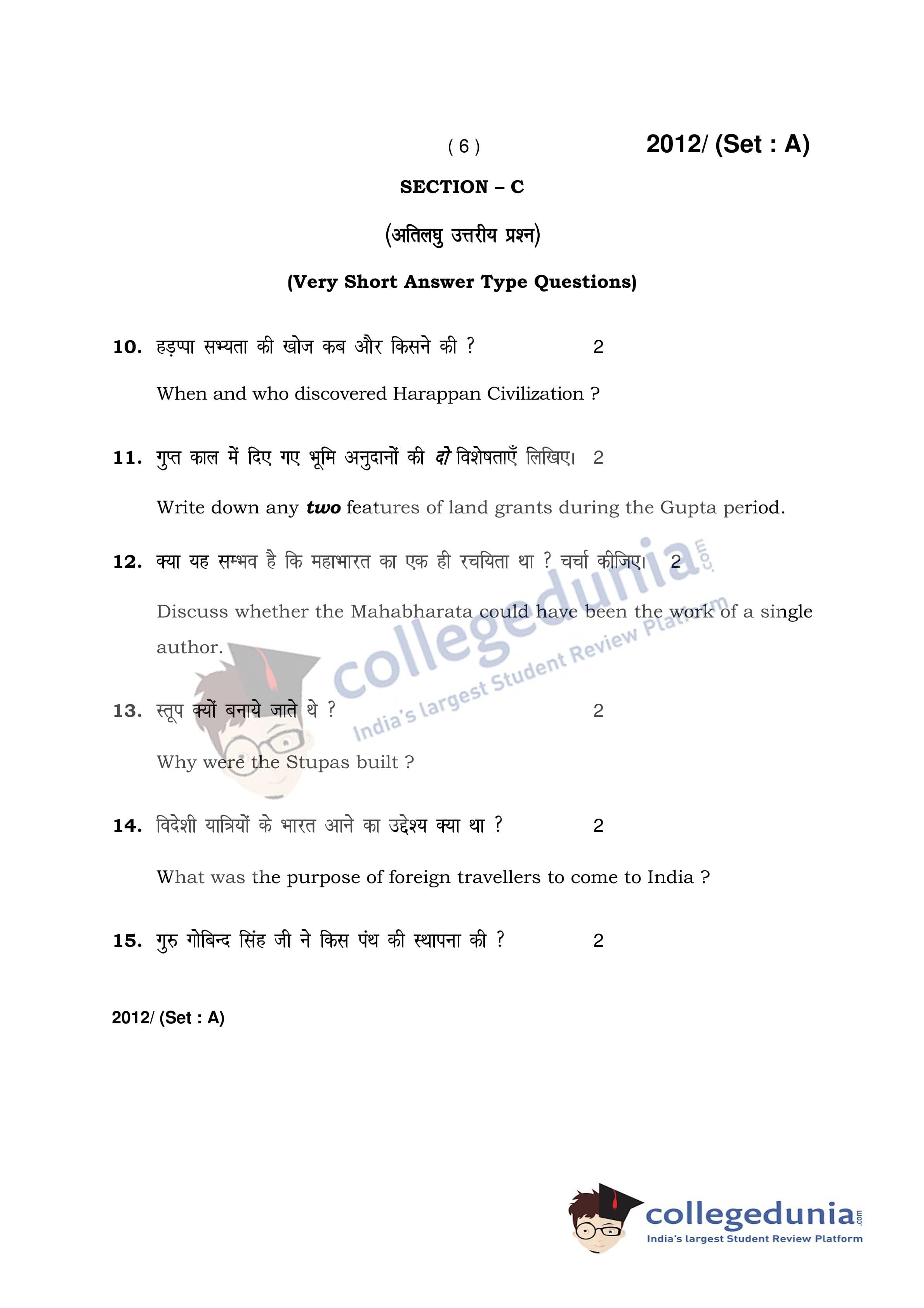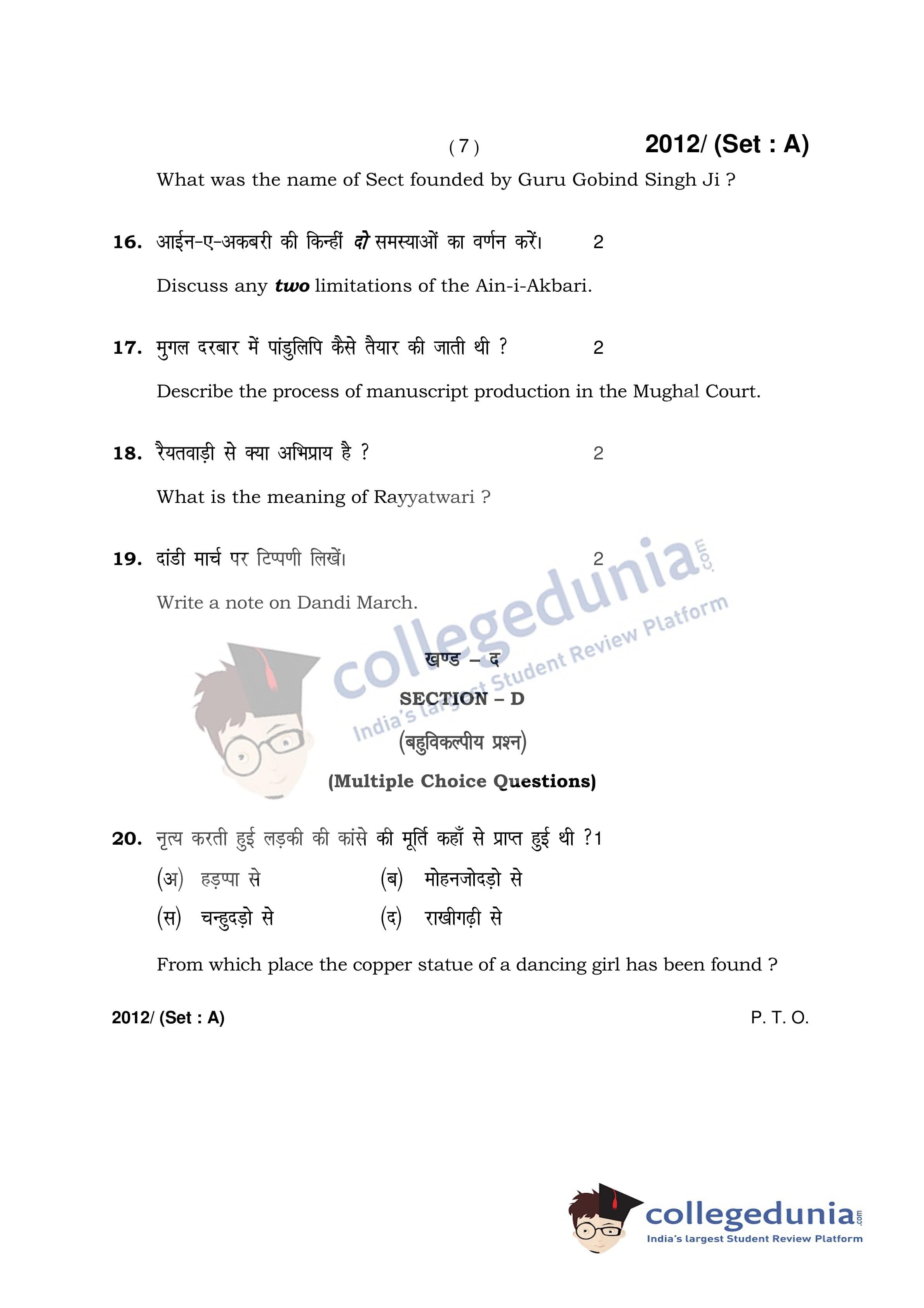 HBSE Class 12 History Set A Question Paper 2017 with Answer Key (April 3)