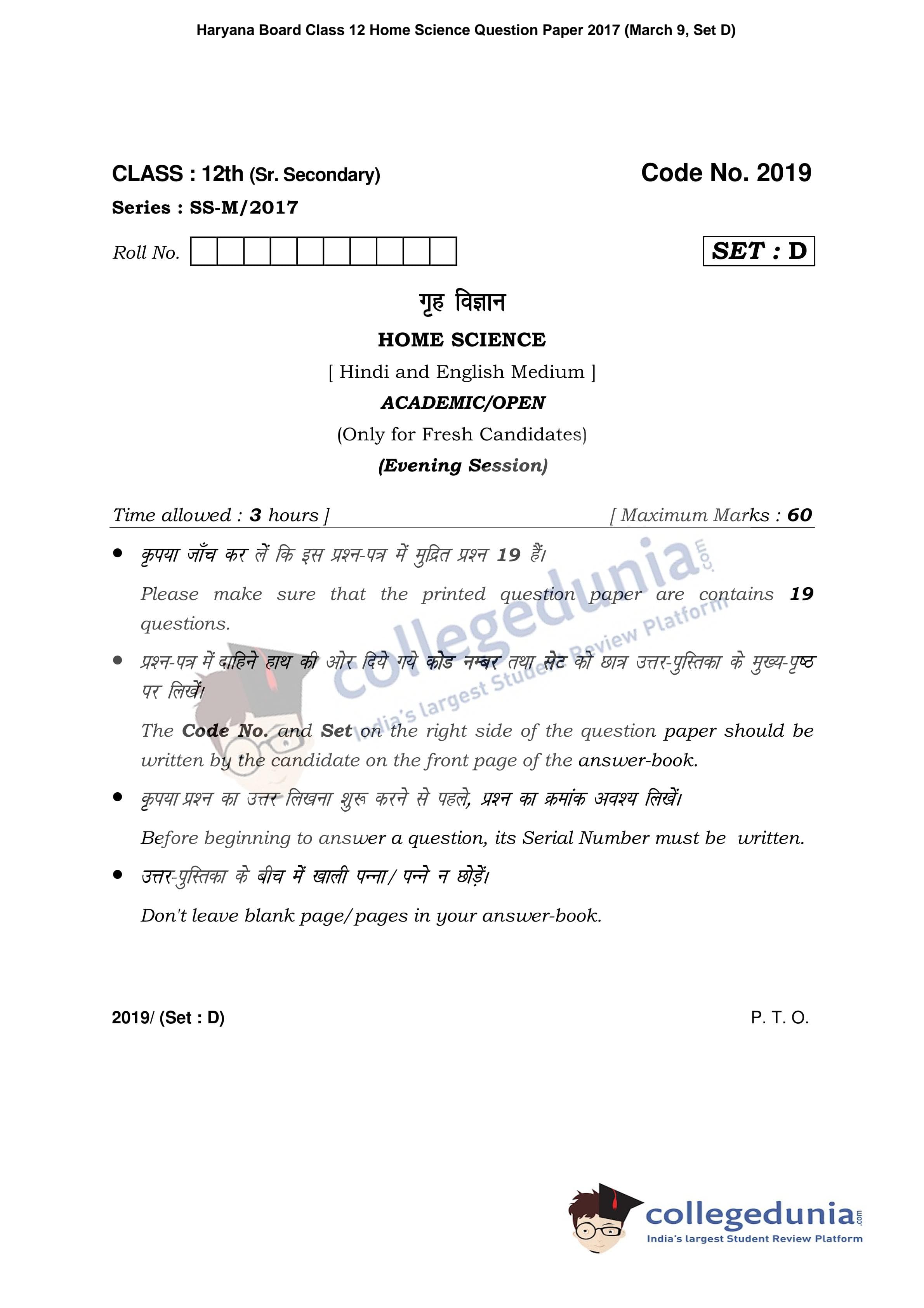 HBSE Class 12 Home Science Set D Question Paper 2017 with Answer Key (March 9)