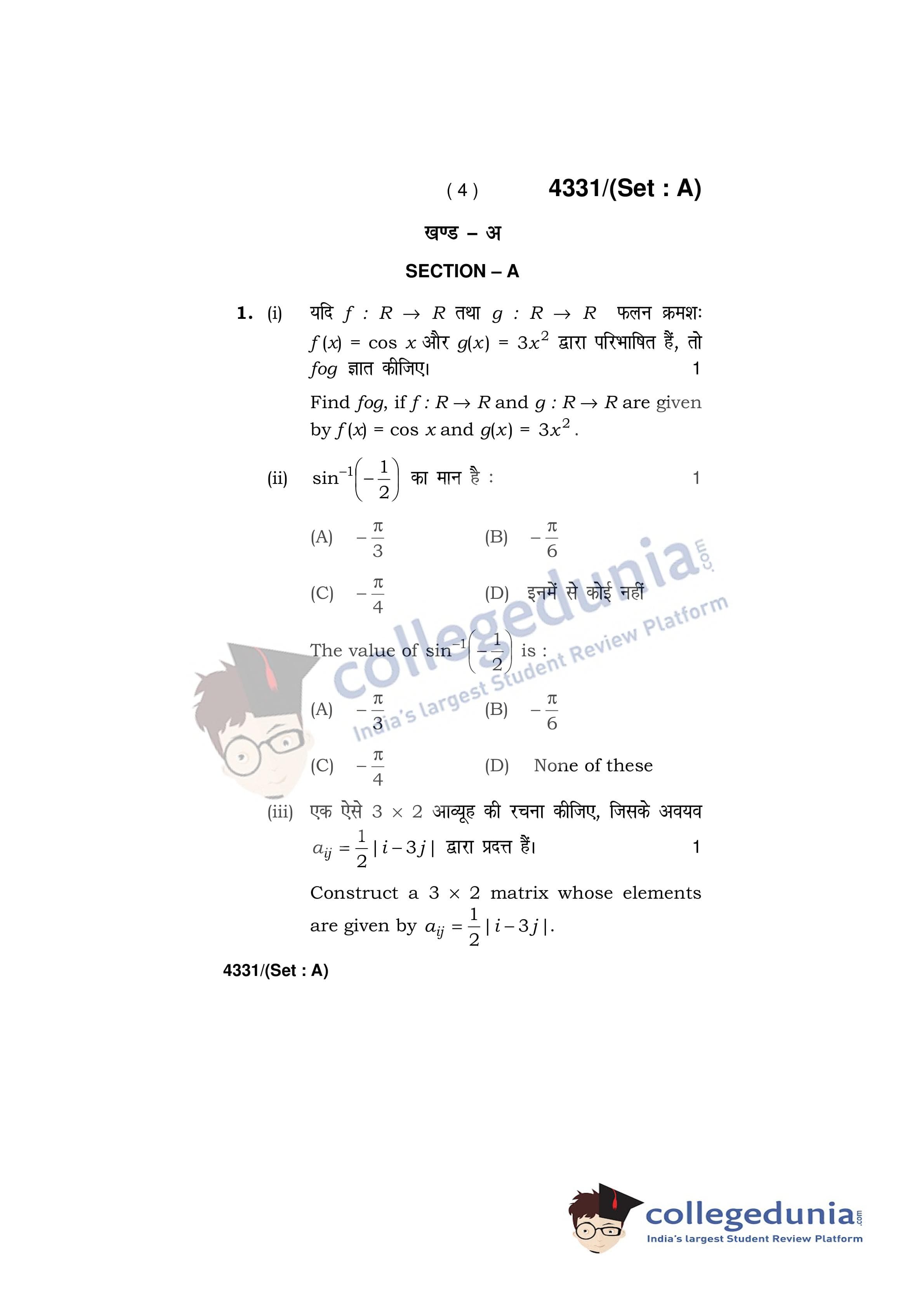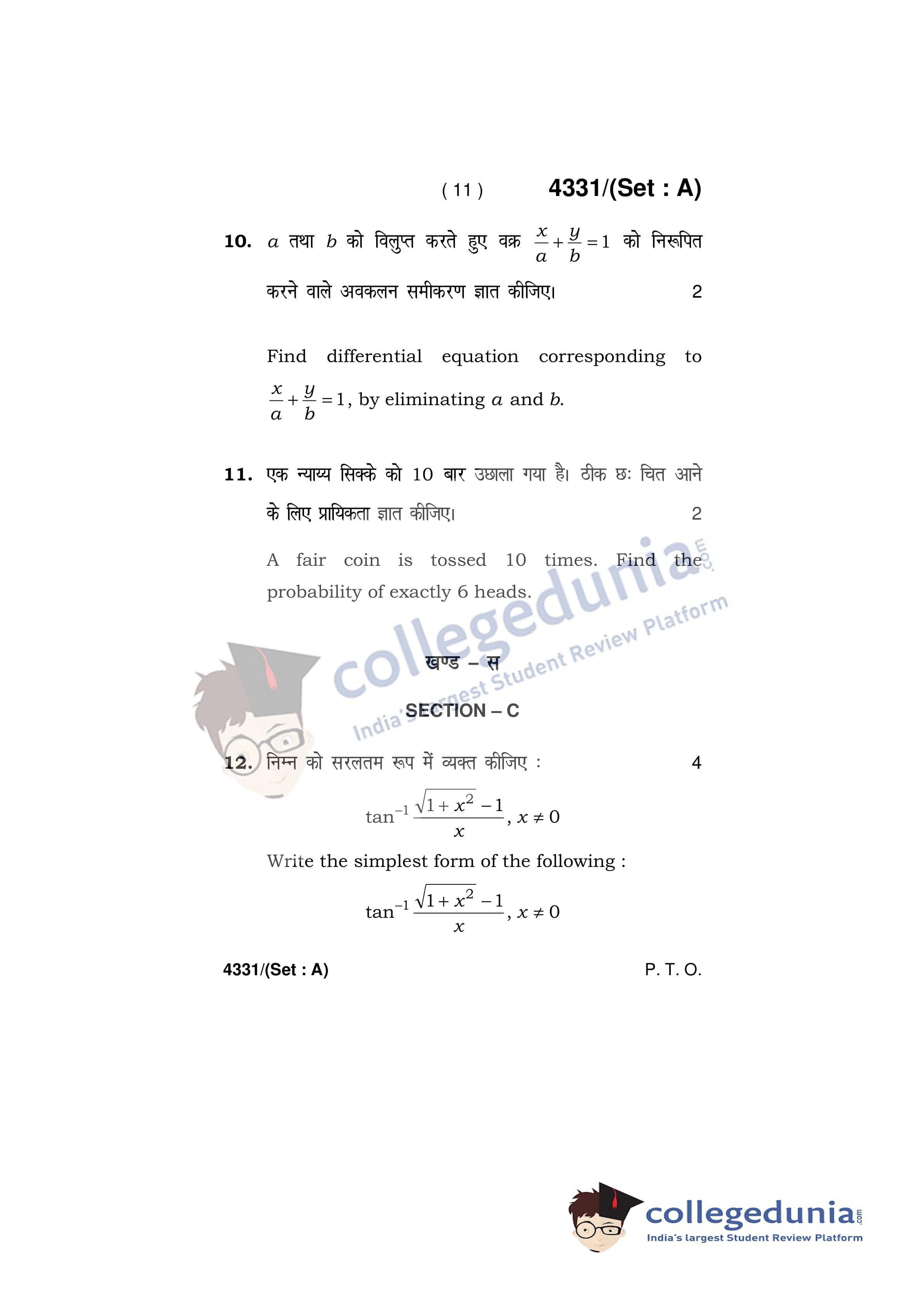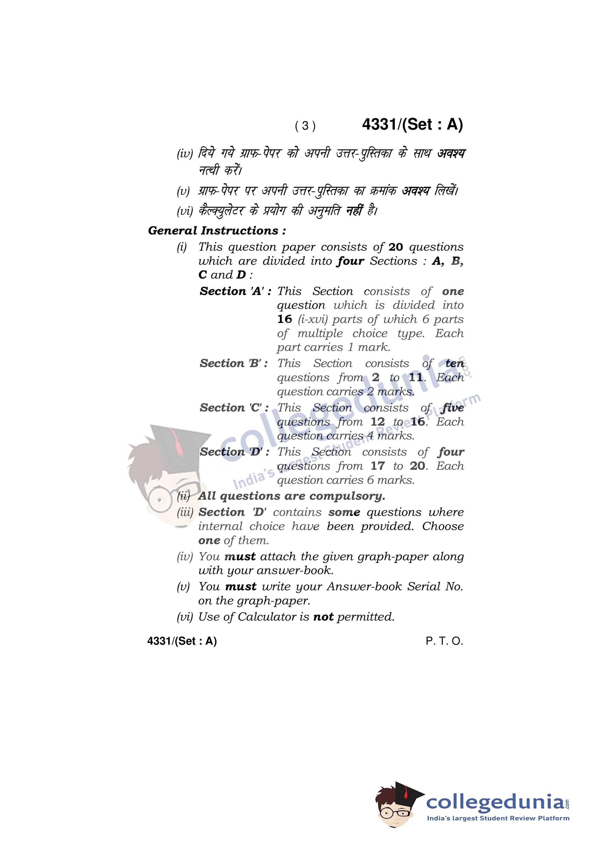 HBSE Class 12 Mathematics Set A Question Paper 2019 with Answer Key (March 18)