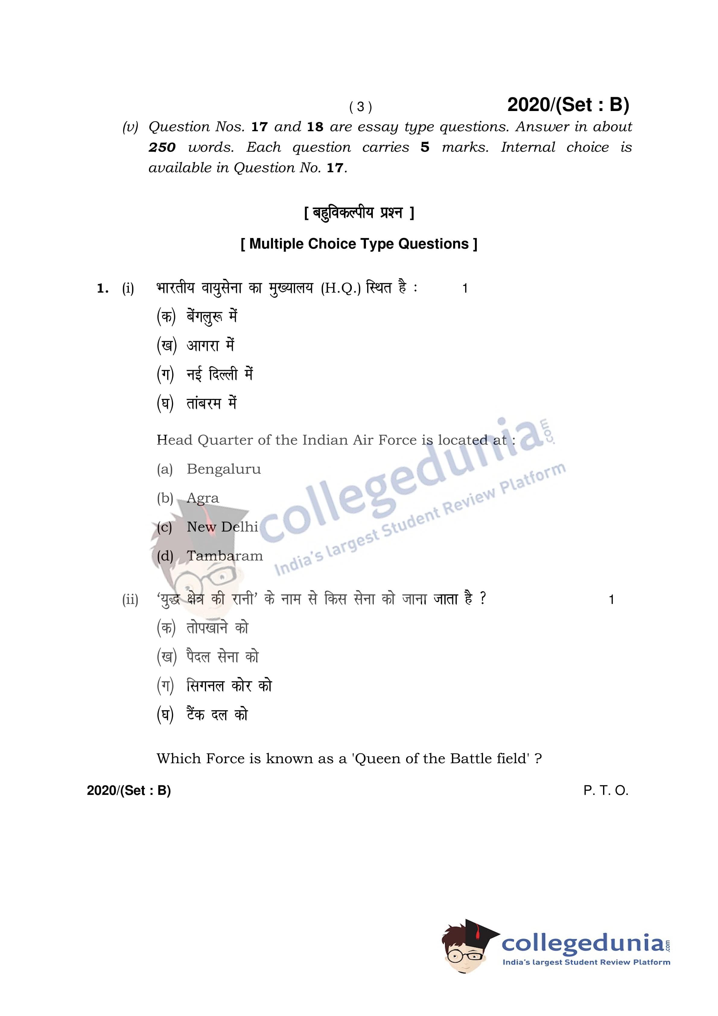 HBSE Class 12 Military Science Question Paper 2017 with Answer Key Set B is available for download. The exam was conducted by the Board of School Education Haryana on March 18, 2017 in the Afternoon Session 2 PM to 4:30 PM. The medium of paper was English and Hindi. The question paper comprised a total of 18 questions.