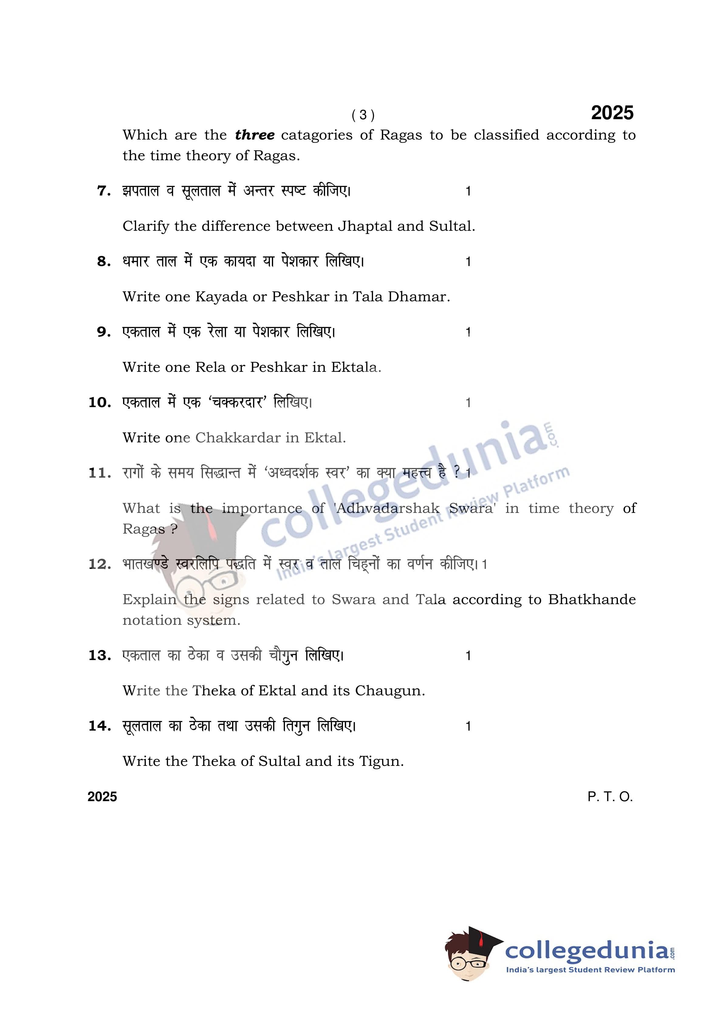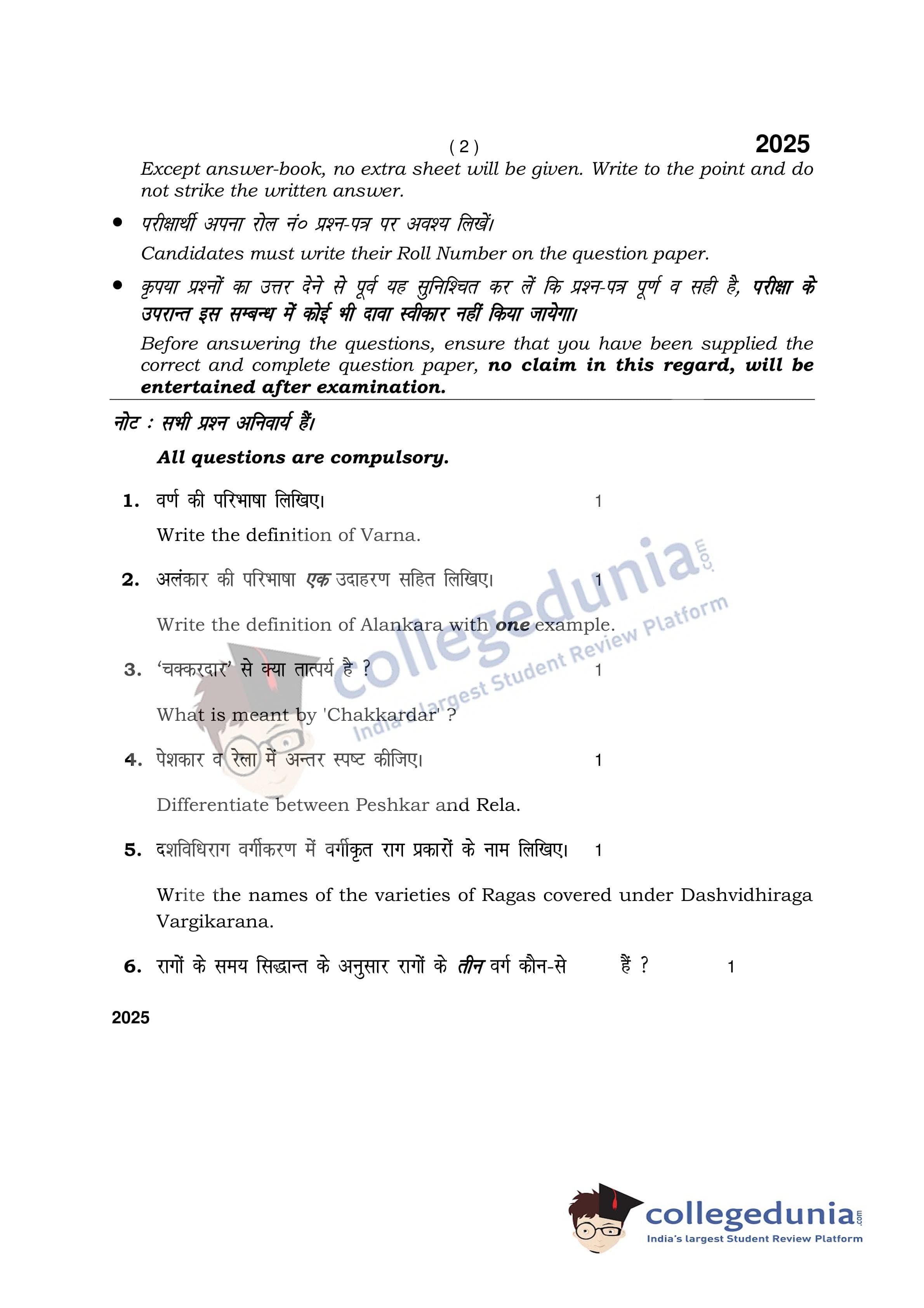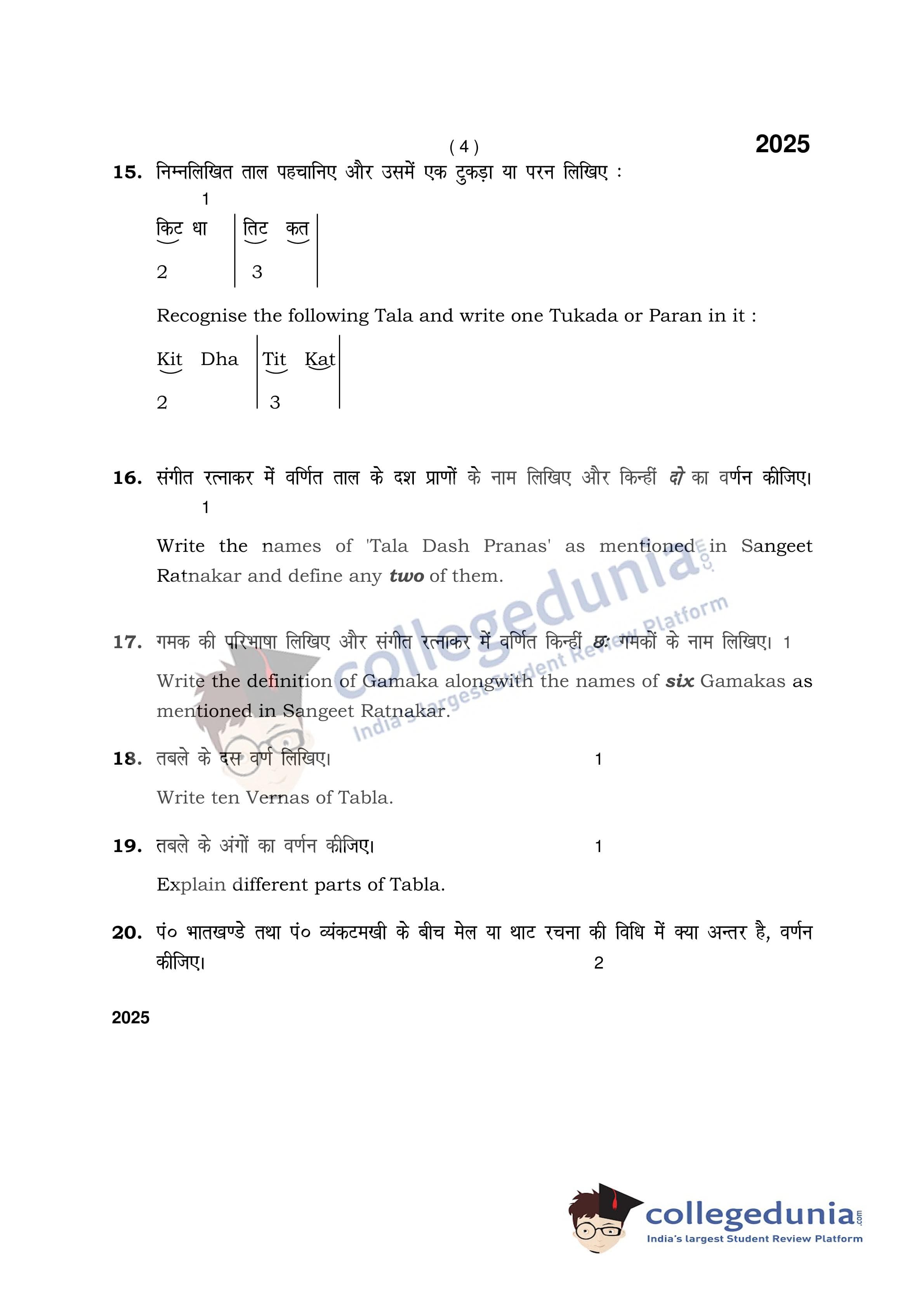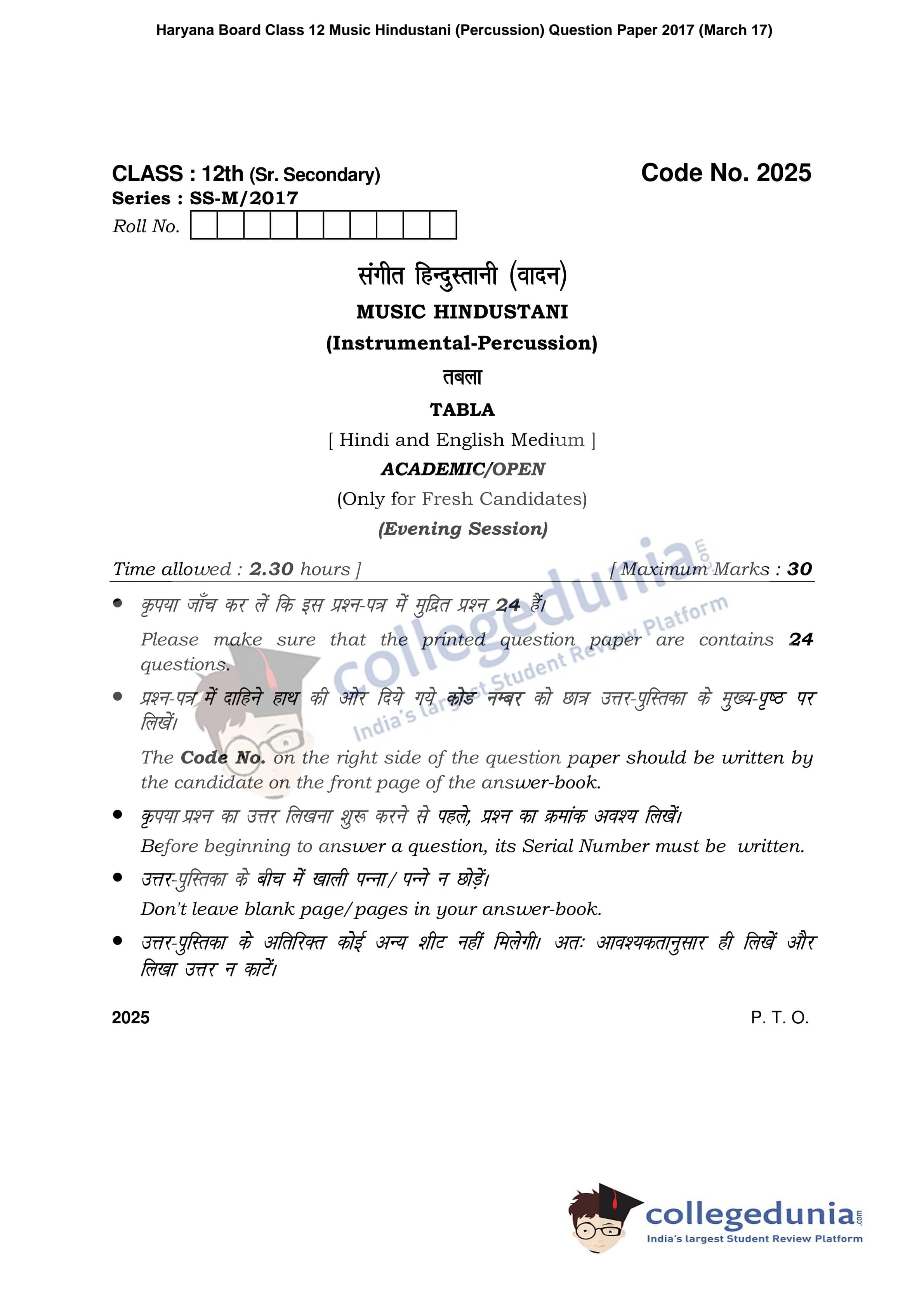 HBSE Class 12 Music Hindustani (Percussion) Question Paper 2017 with Answer Key (March 17)