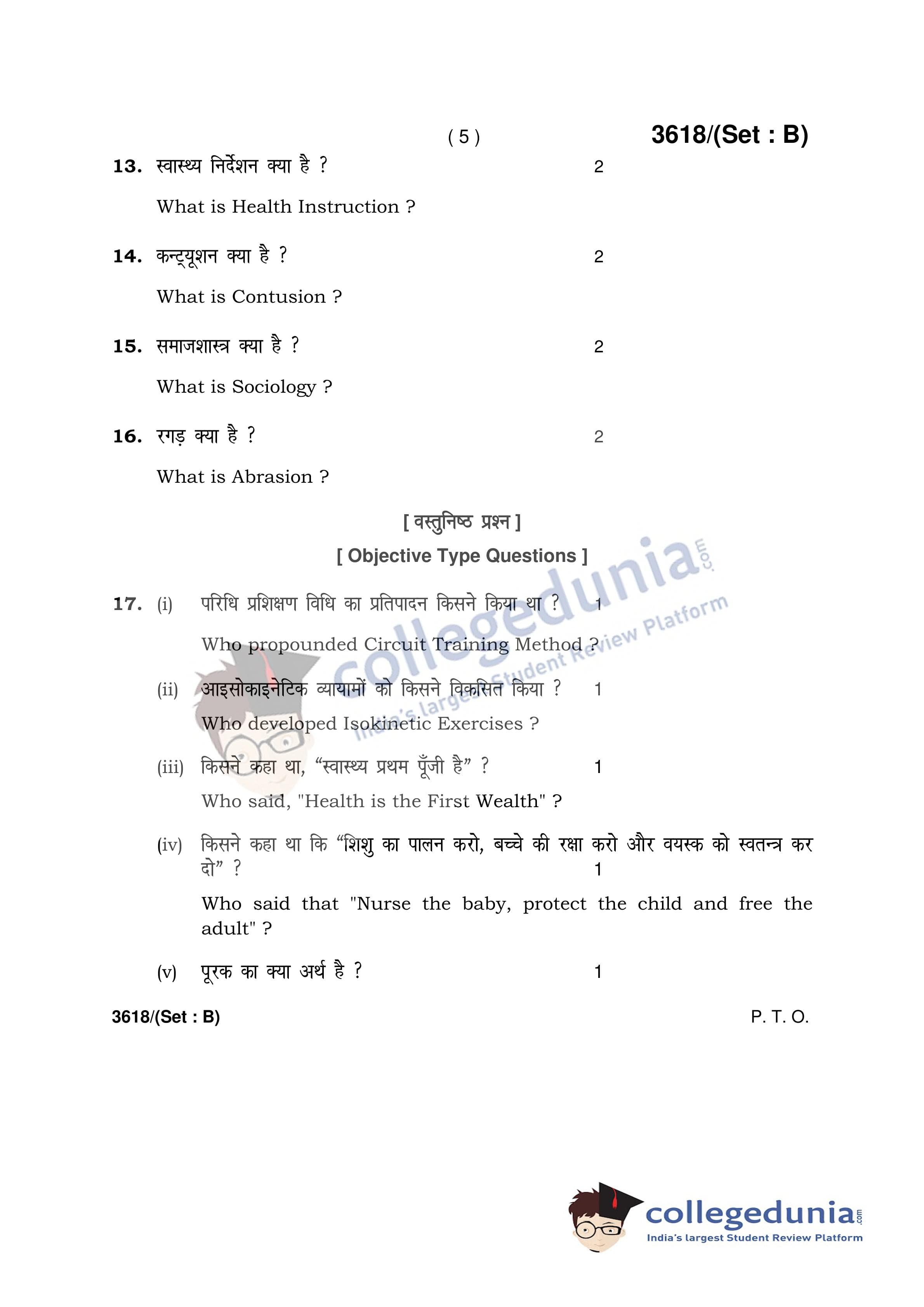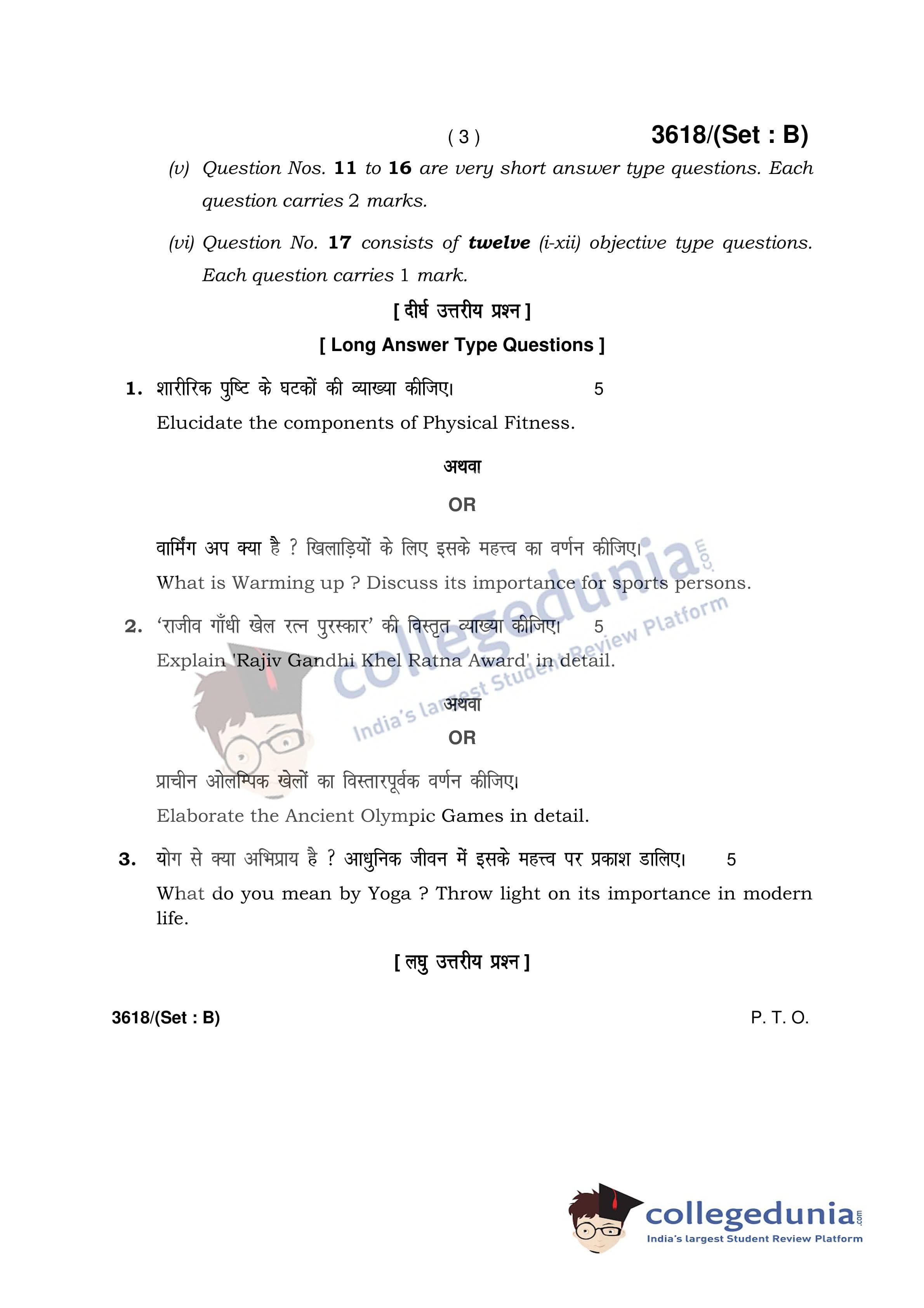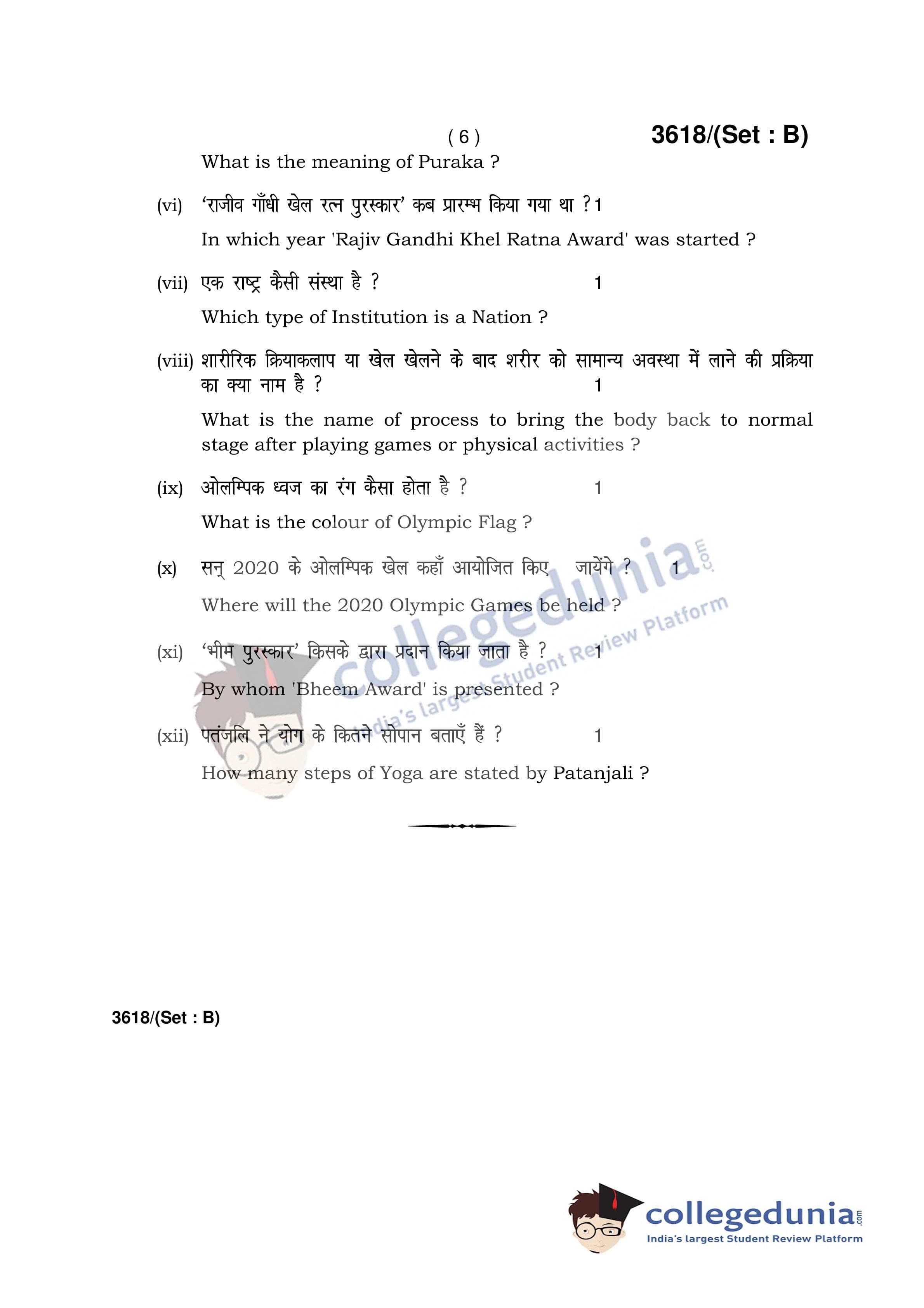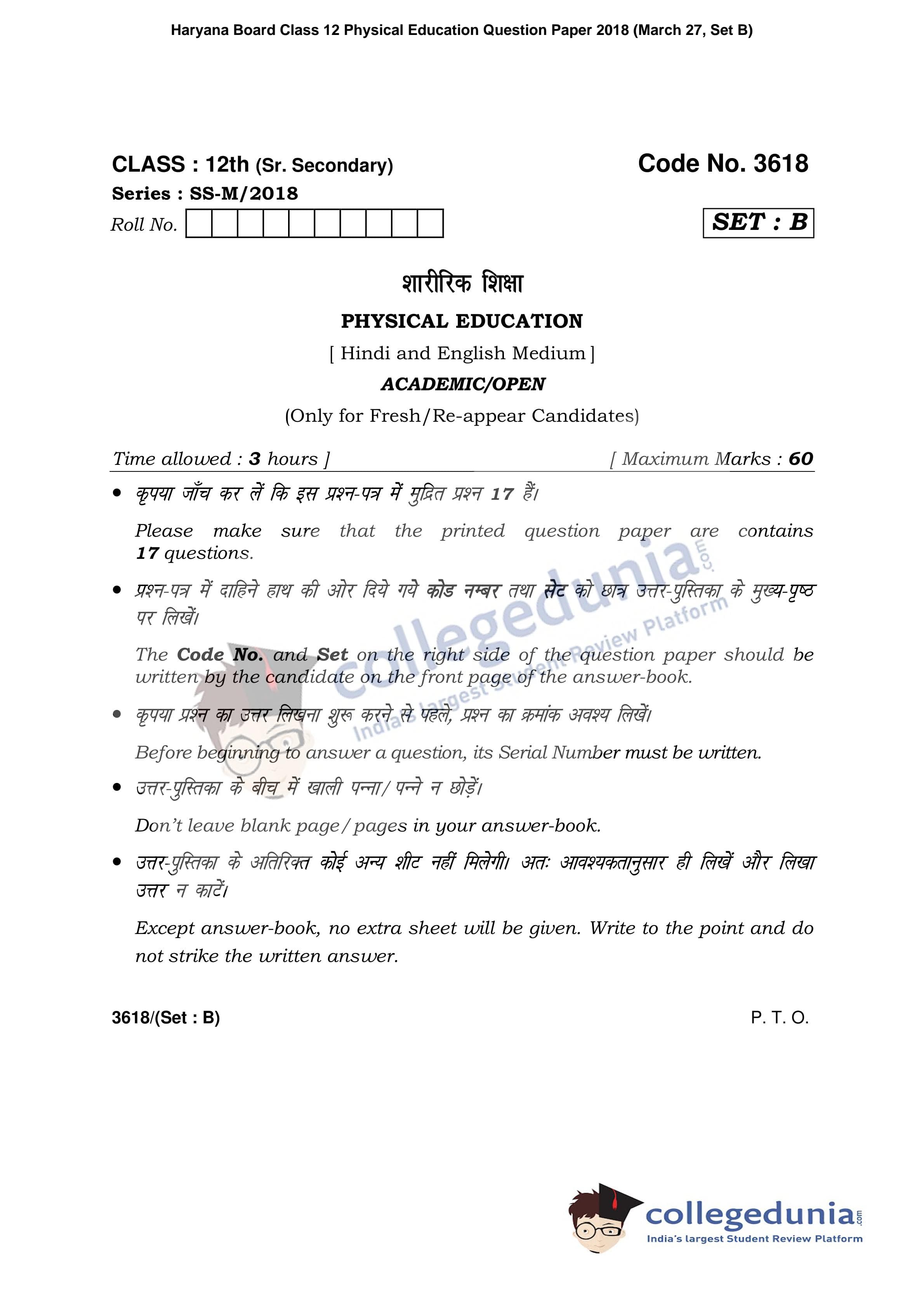 HBSE Class 12 Physical Education Set B Question Paper 2018 with Answer Key (March 27)
