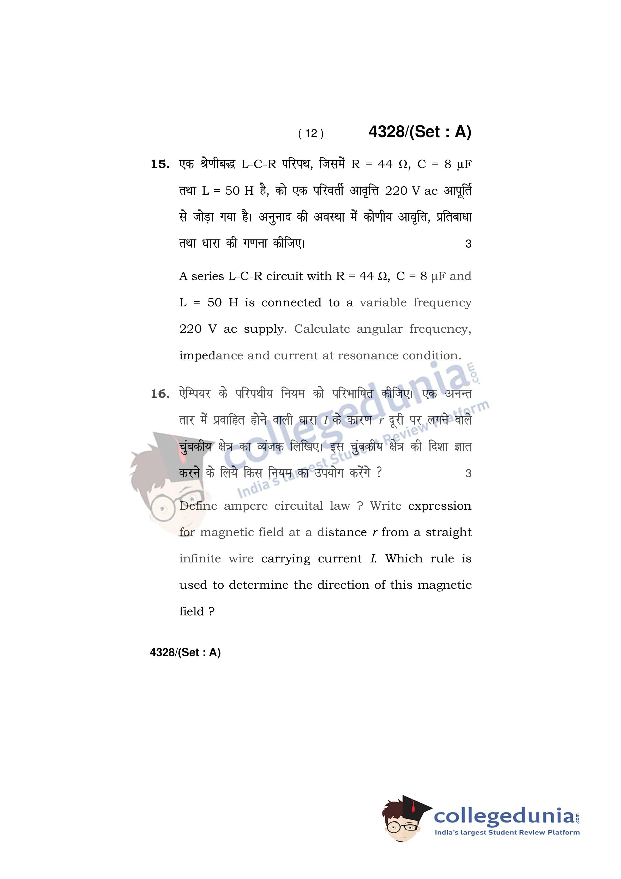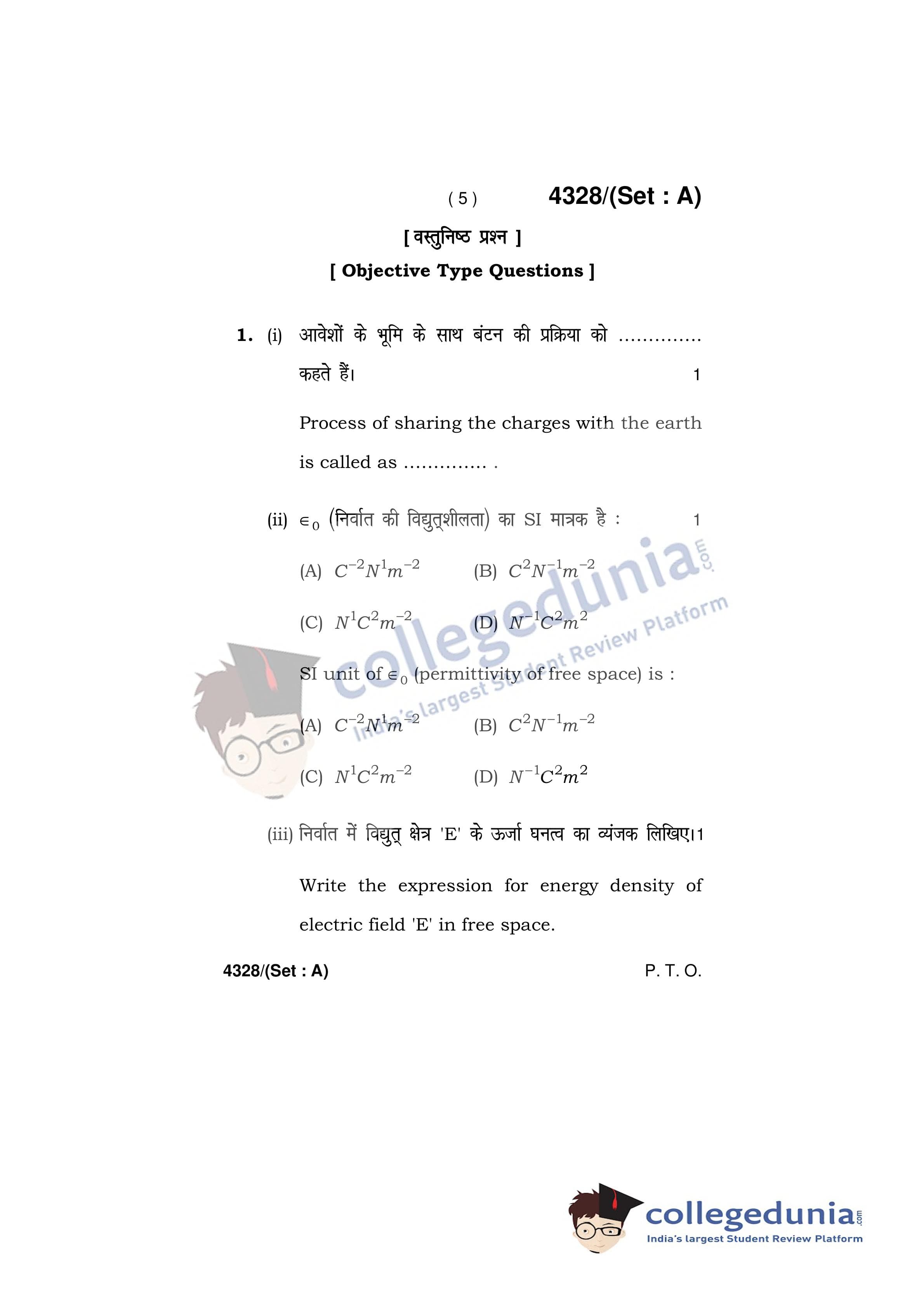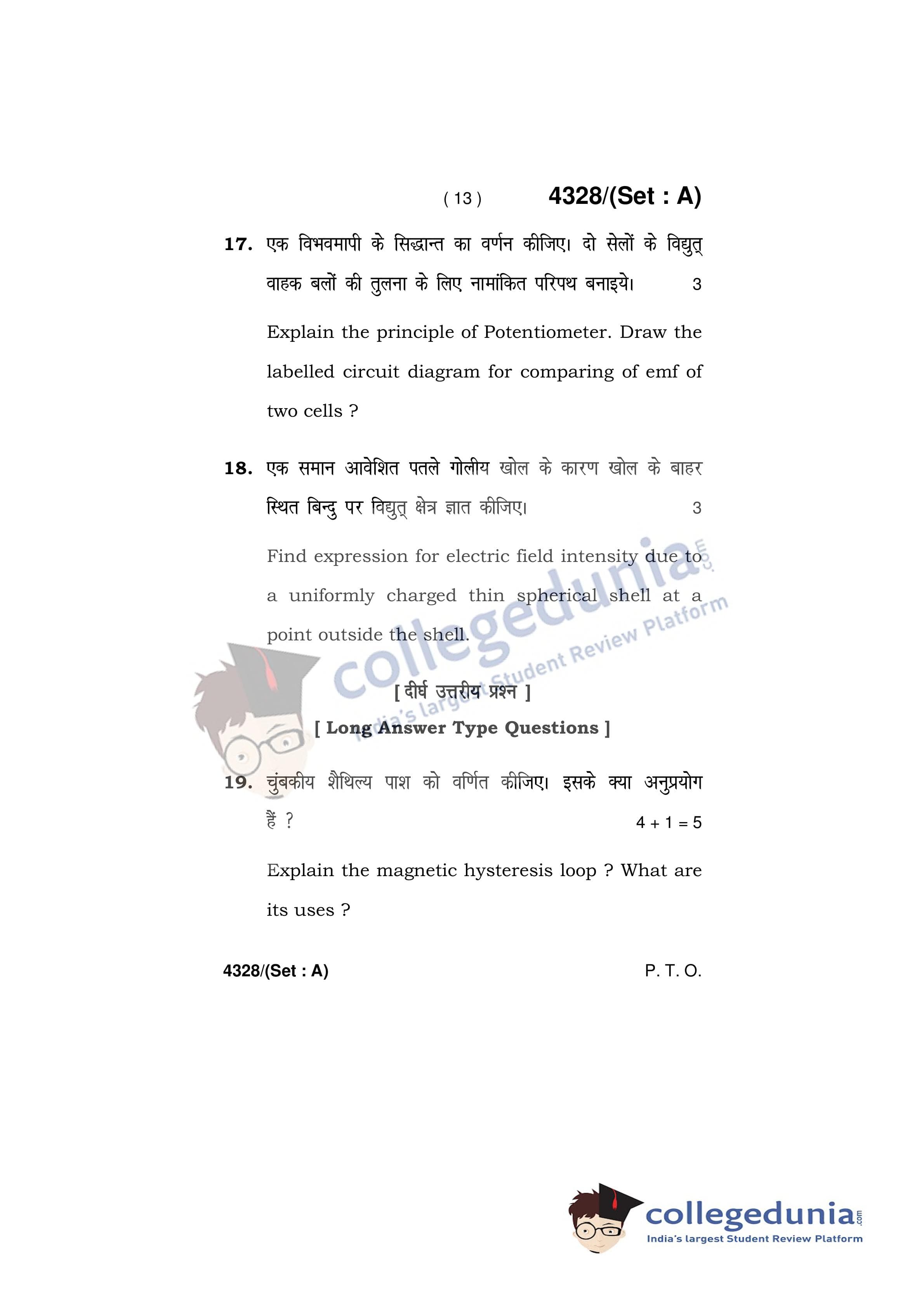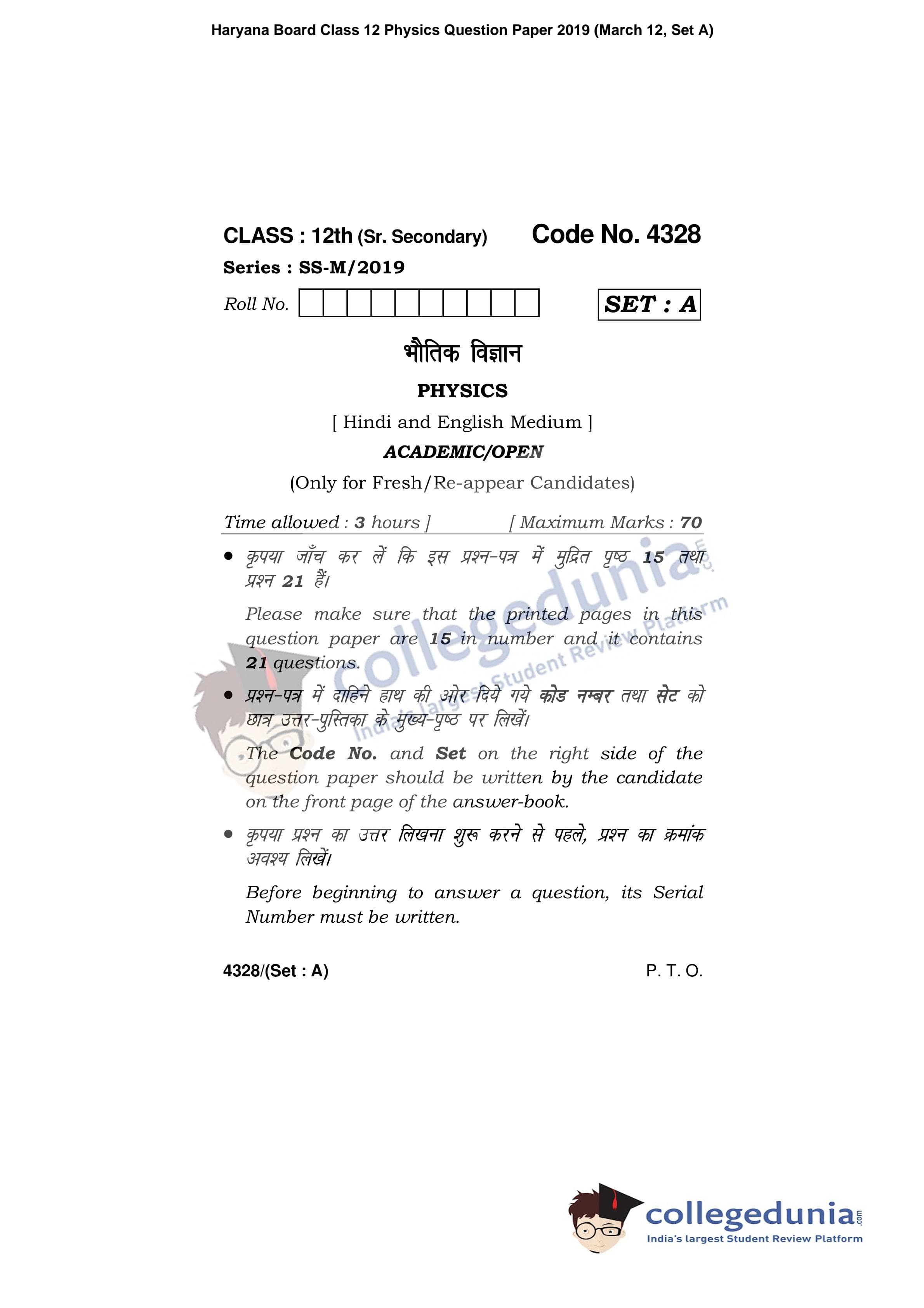 HBSE Class 12 Physics Set A Question Paper 2019 with Answer Key (March 12)
