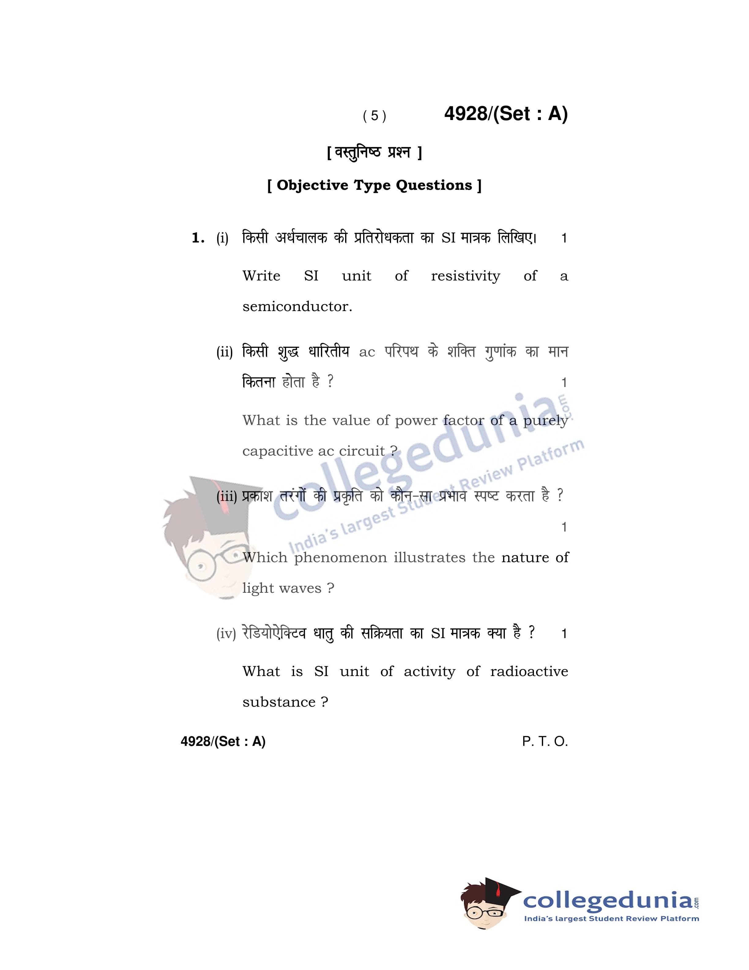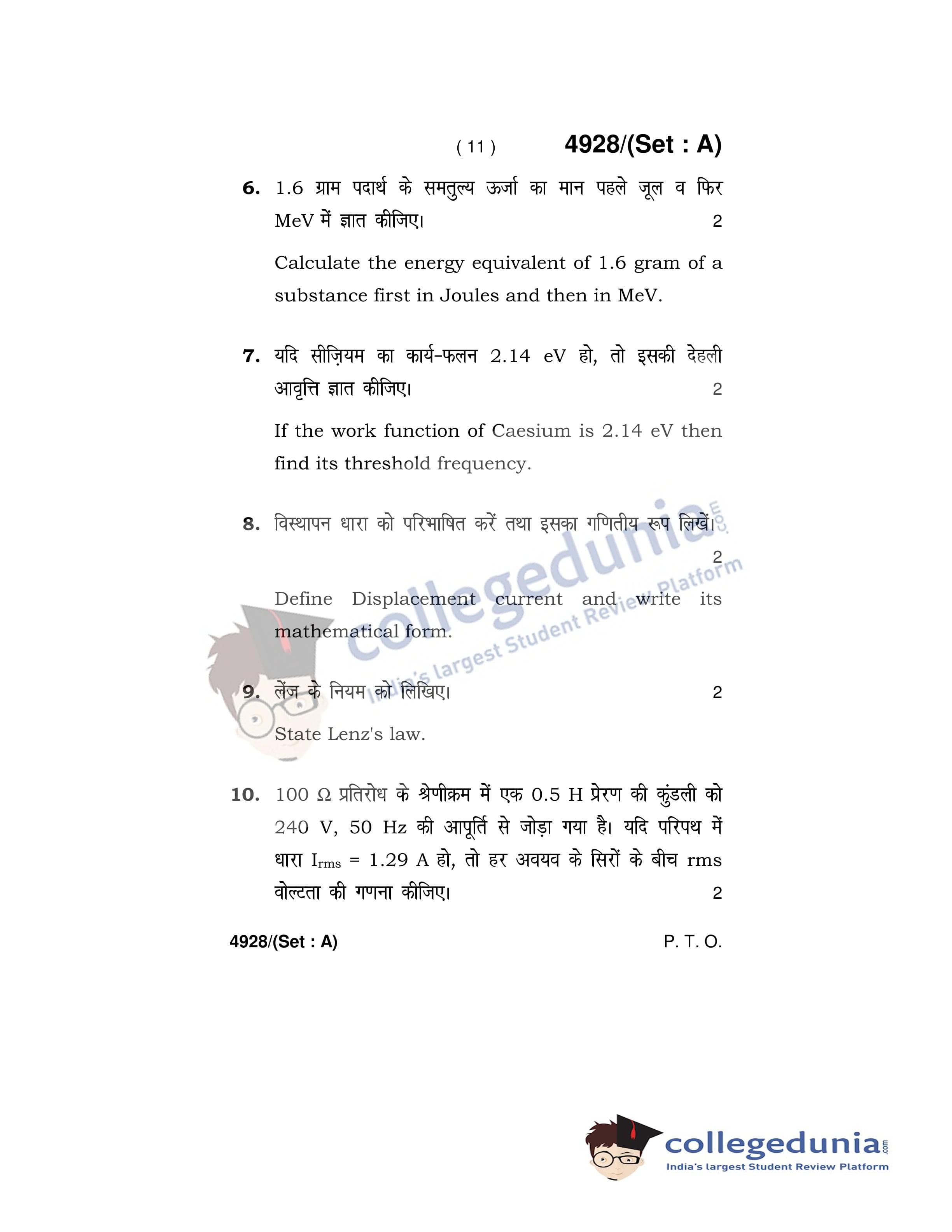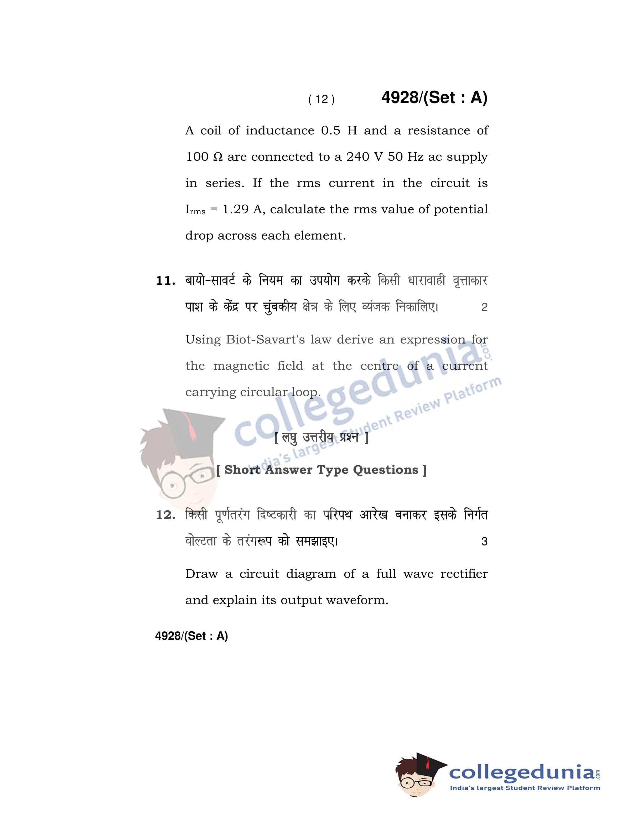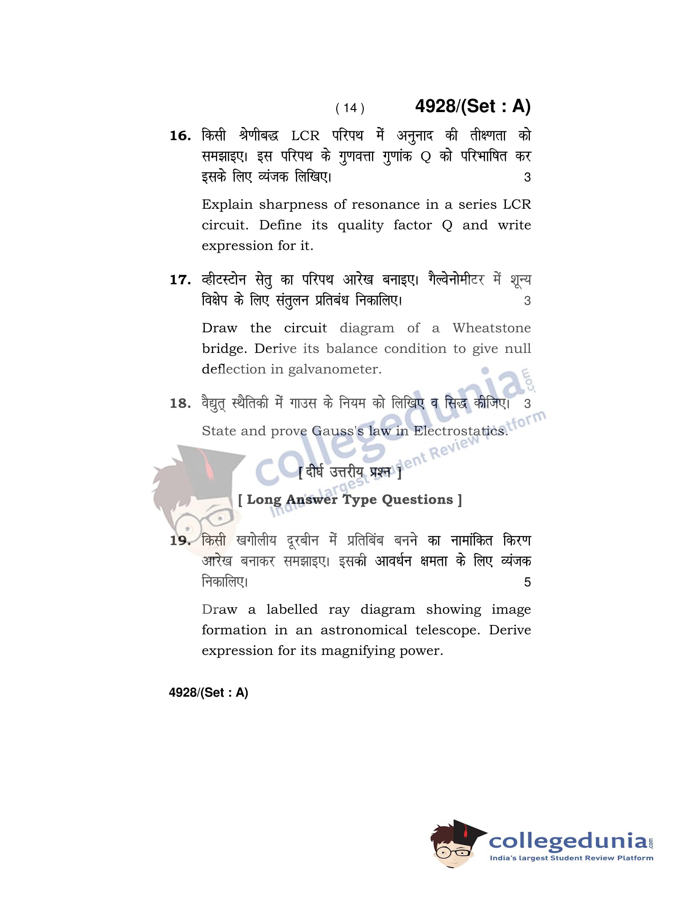 HBSE Class 12 Physics Set A Question Paper 2020 with Answer Key (March 5)