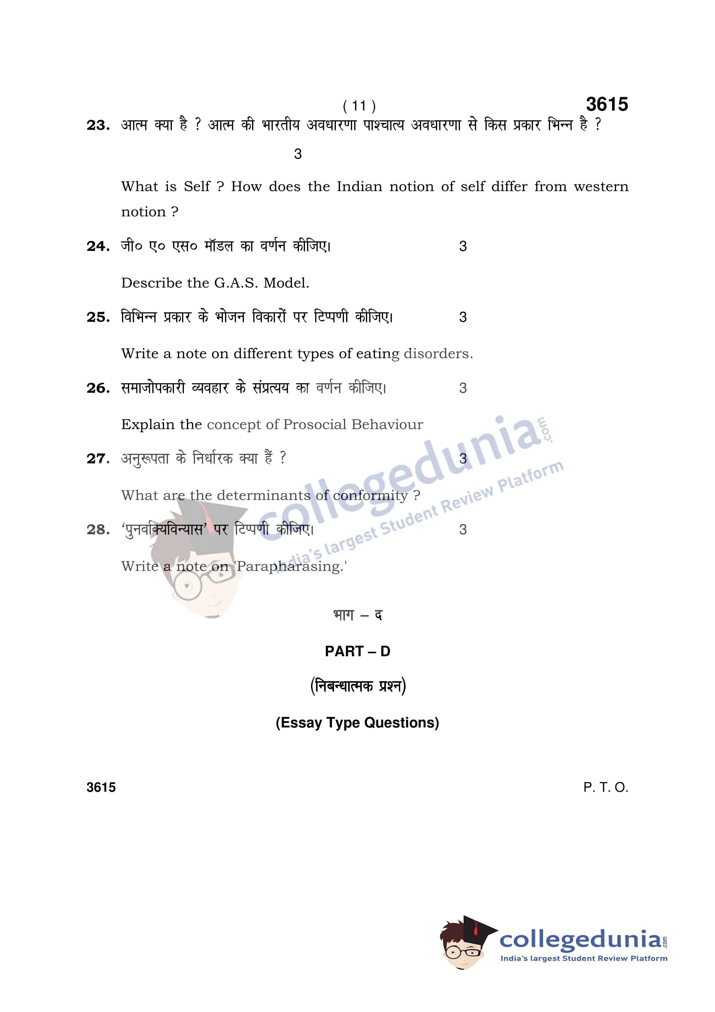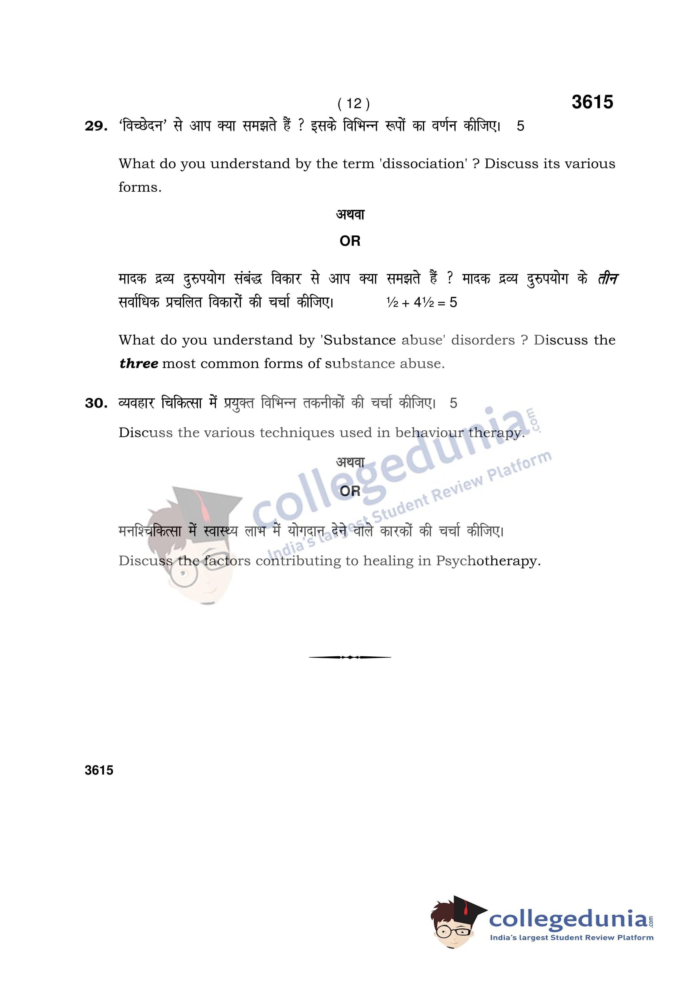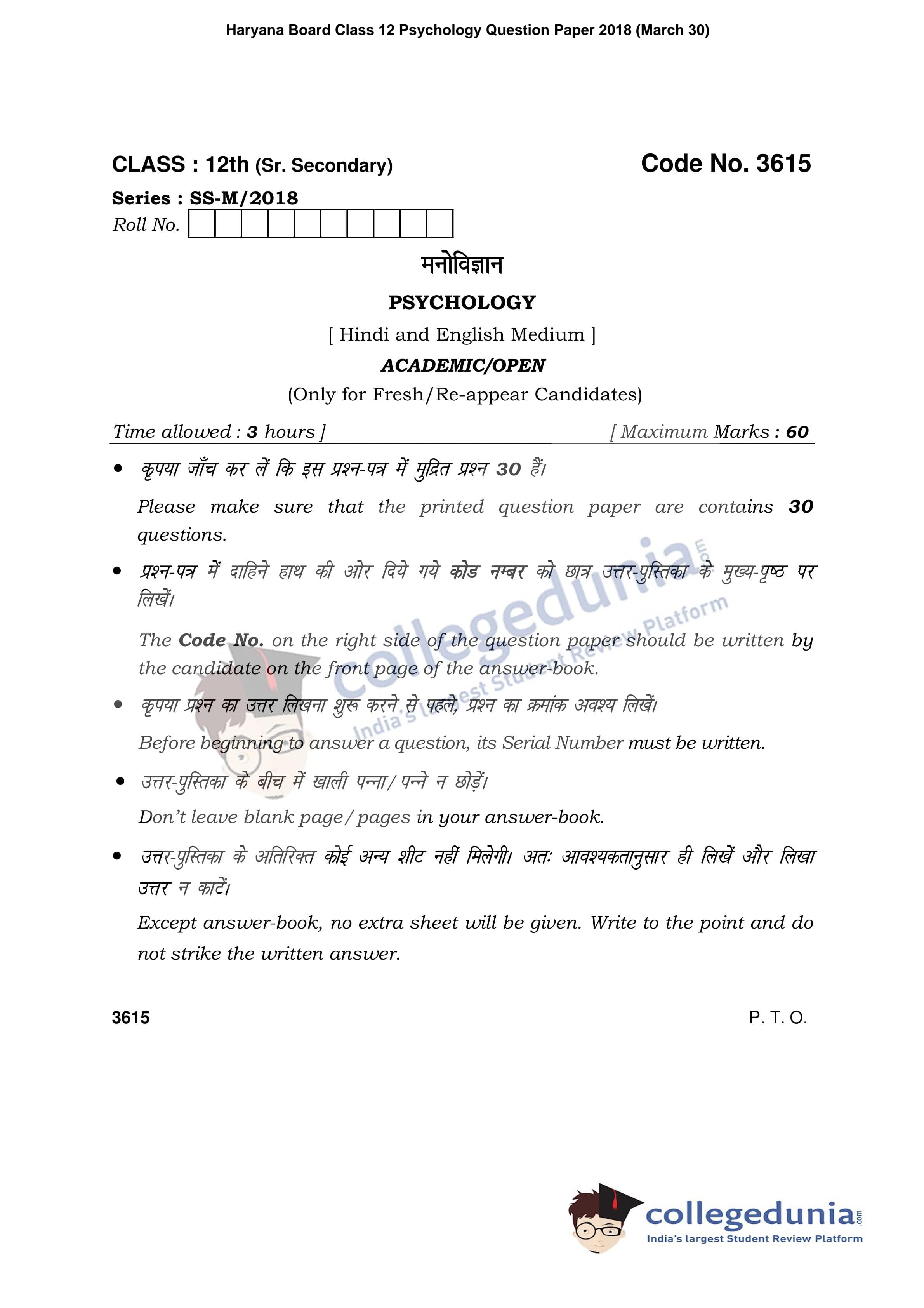 HBSE Class 12 Psychology Question Paper 2018 with Answer Key (March 30)