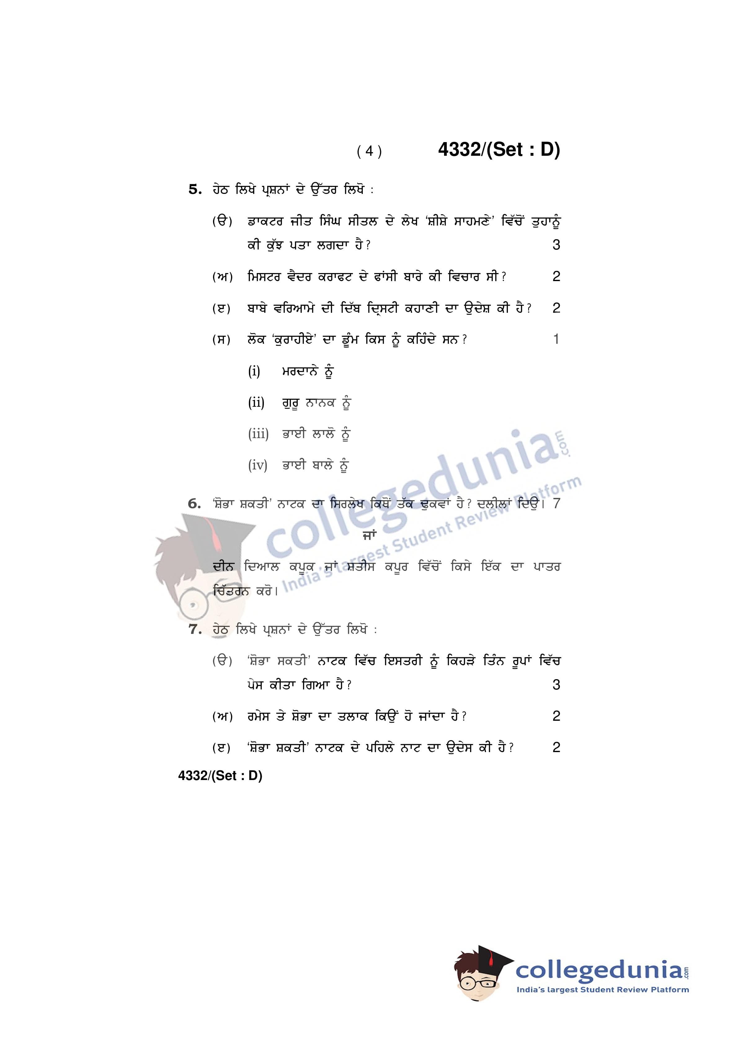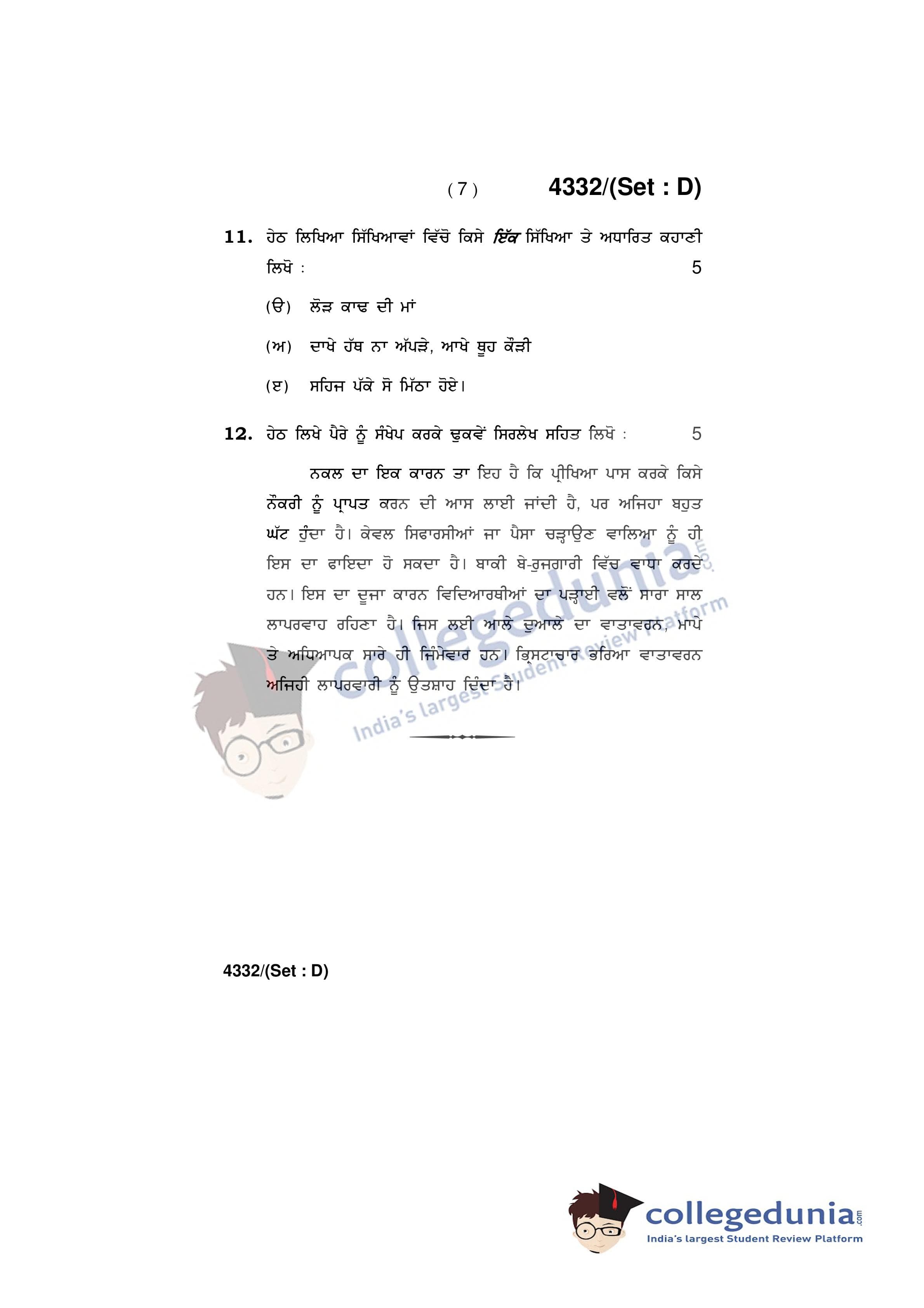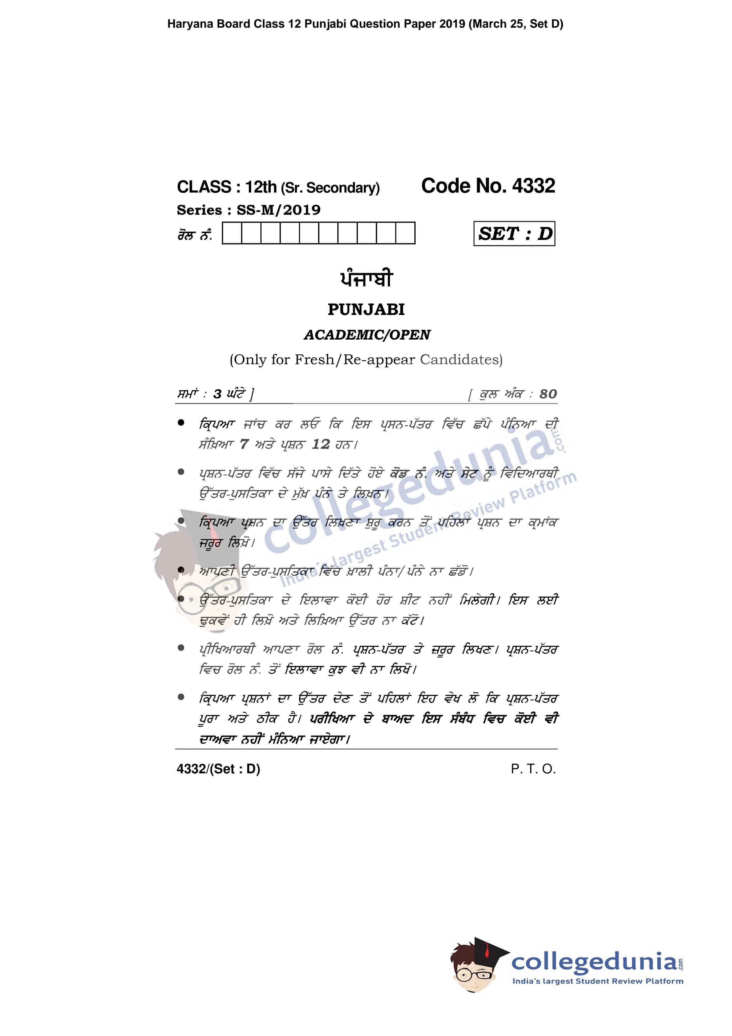 HBSE Class 12 Punjabi Set D Question Paper 2019 with Answer Key (March 25)