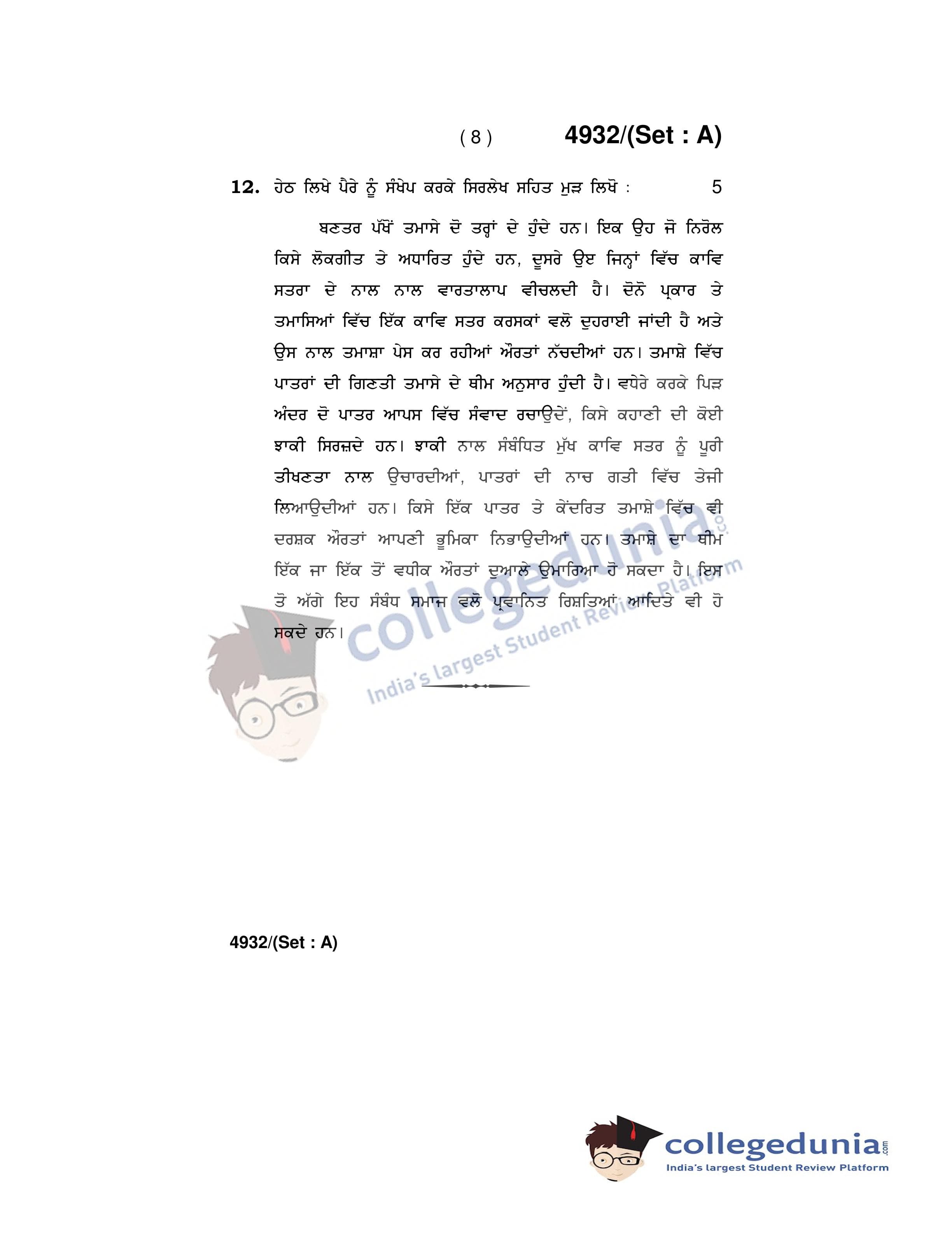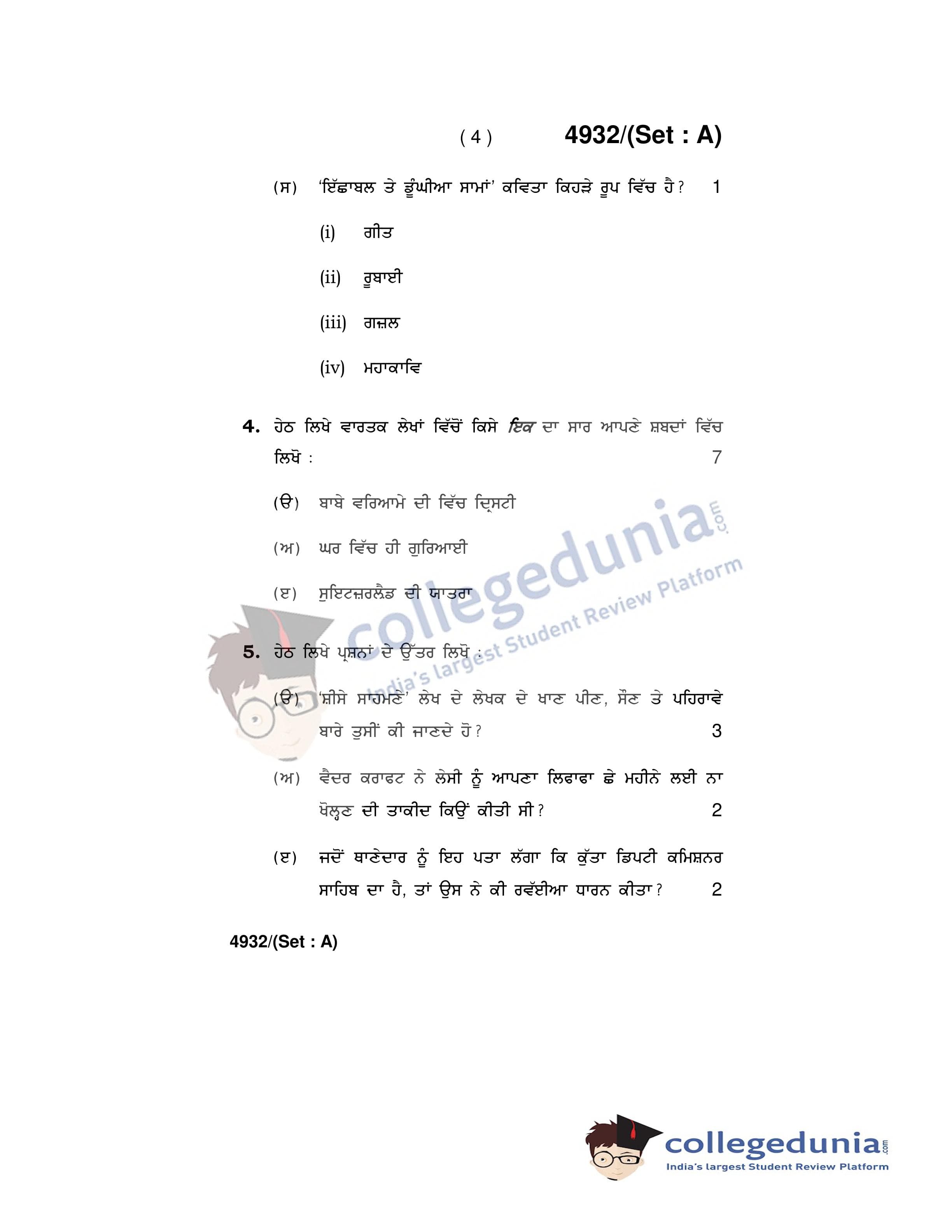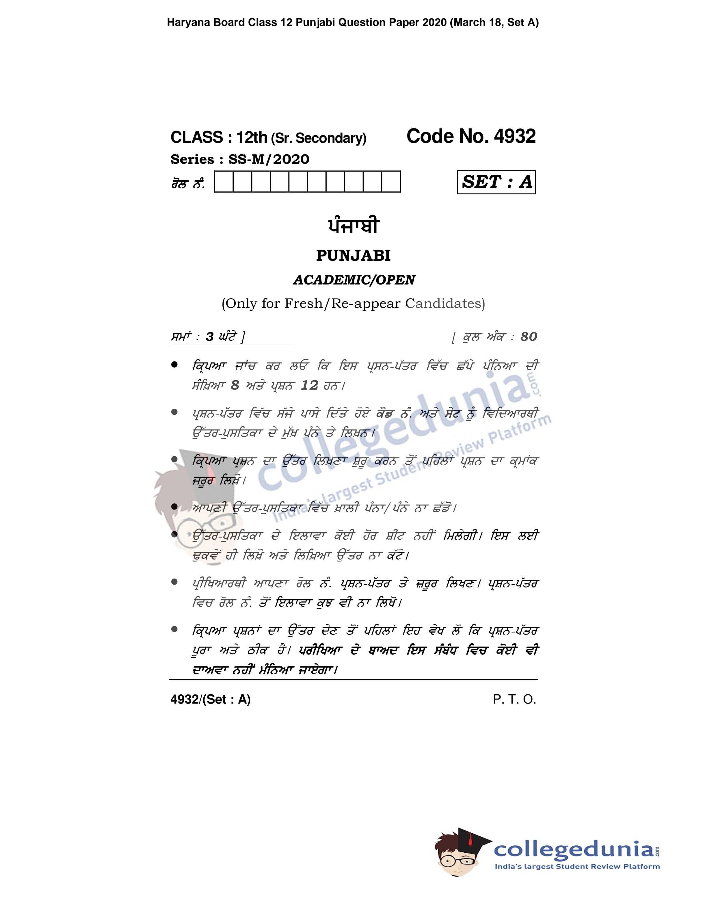 HBSE Class 12 Punjabi Set A Question Paper 2020 with Answer Key (March 18)