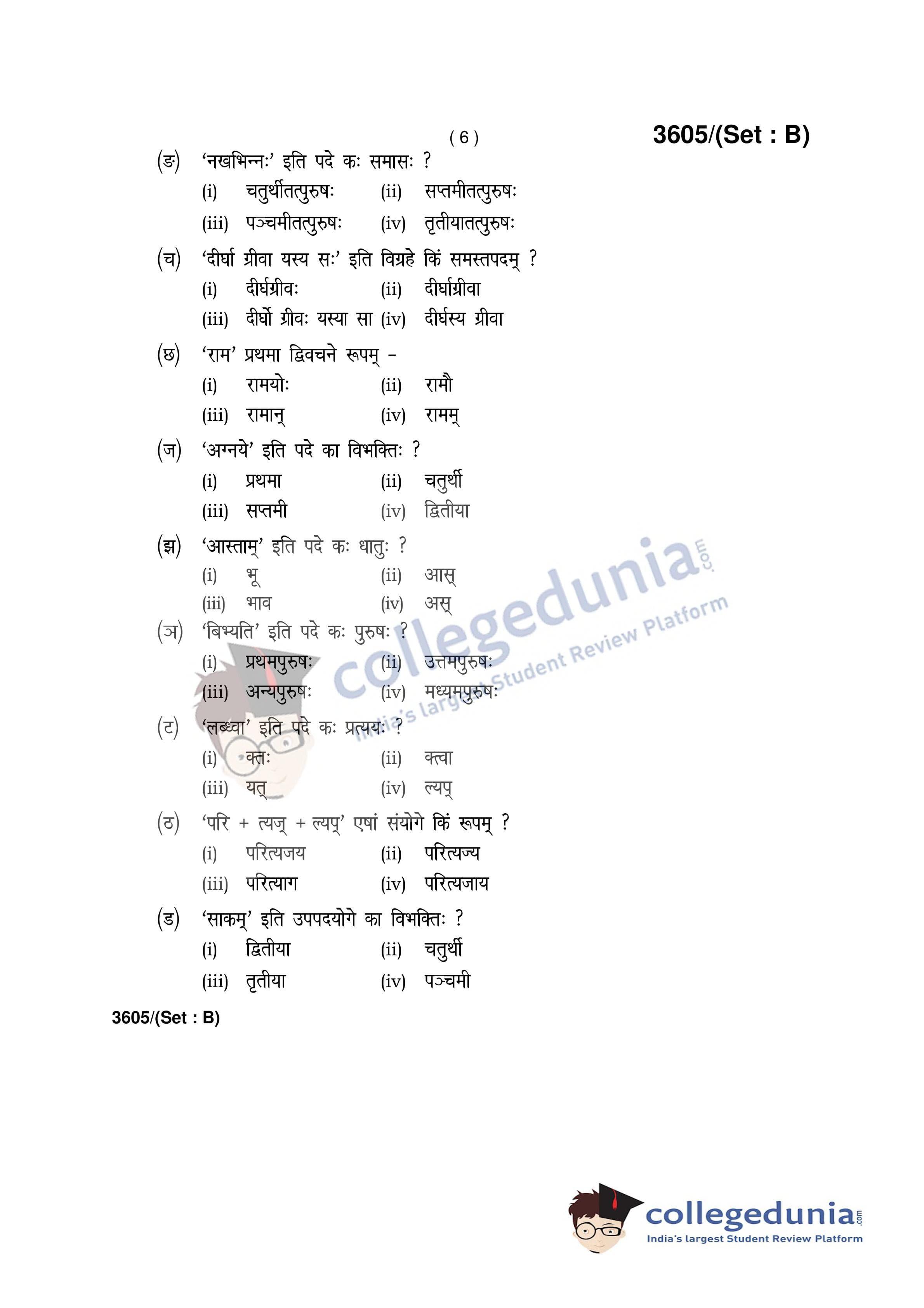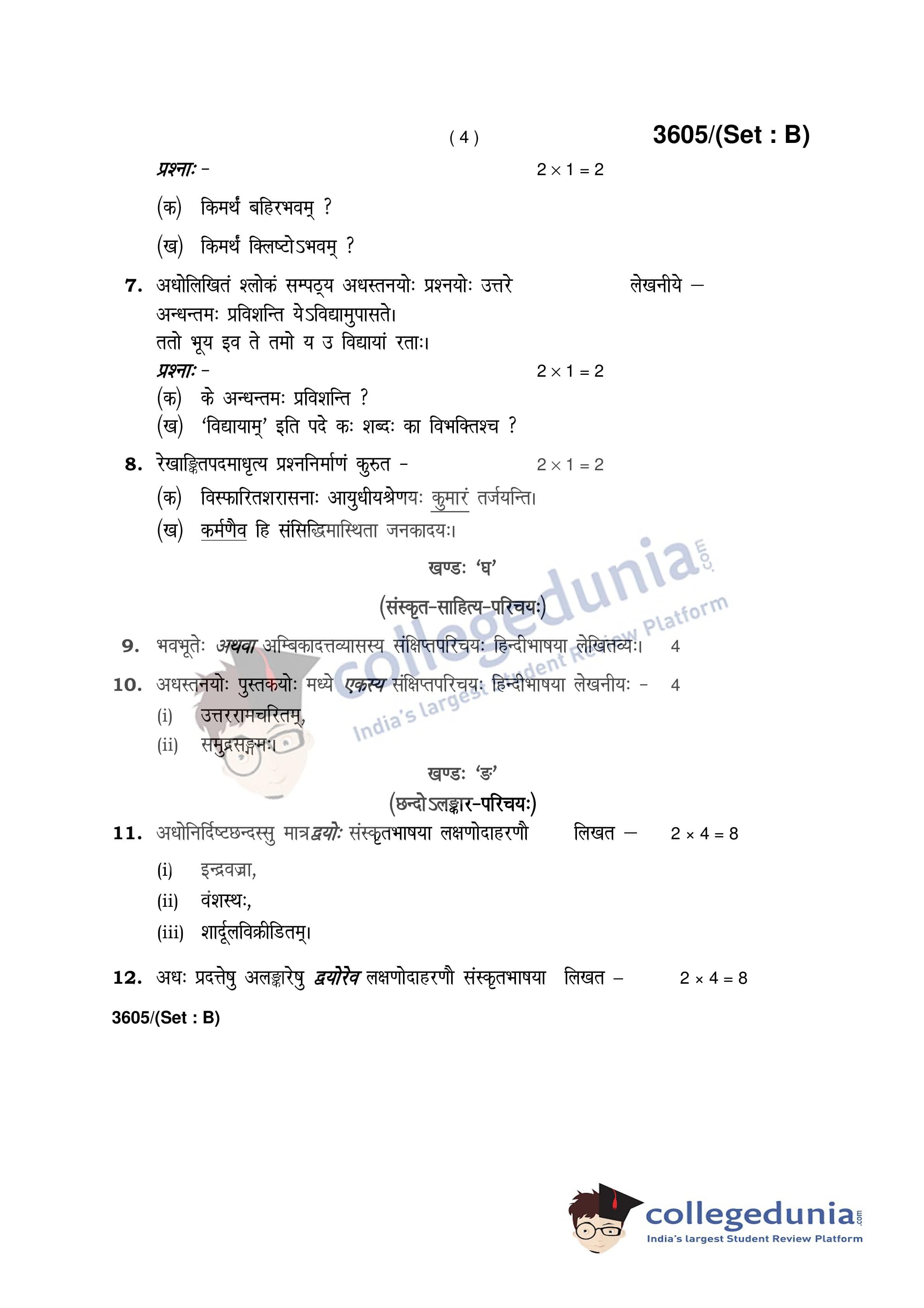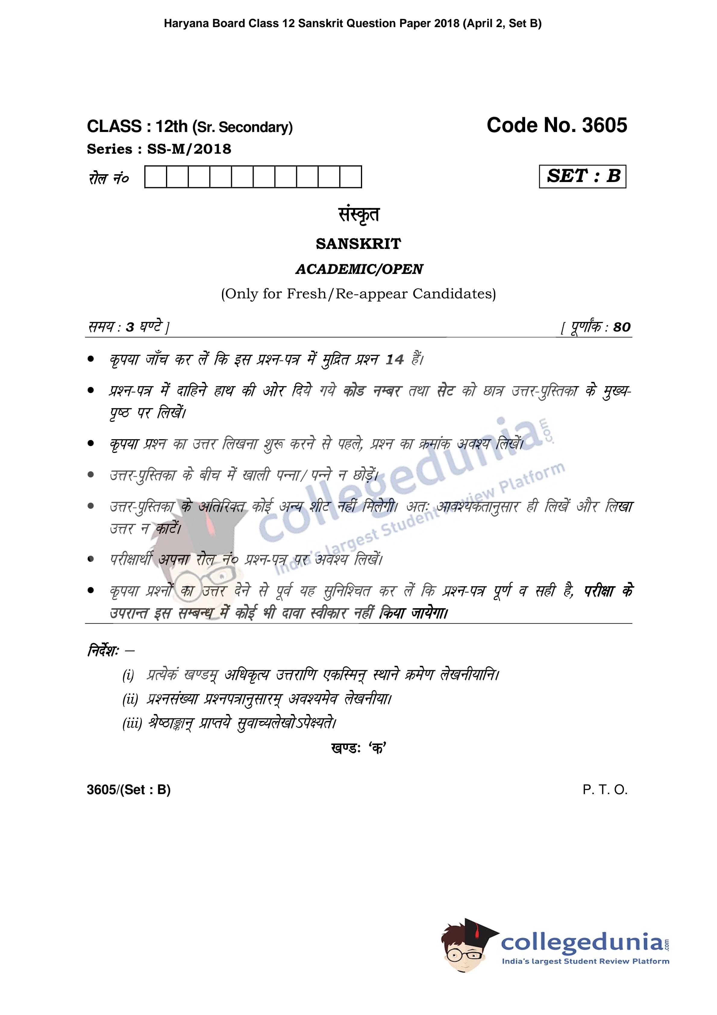 HBSE Class 12 Sanskrit Set B Question Paper 2018 with Answer Key (April 2)