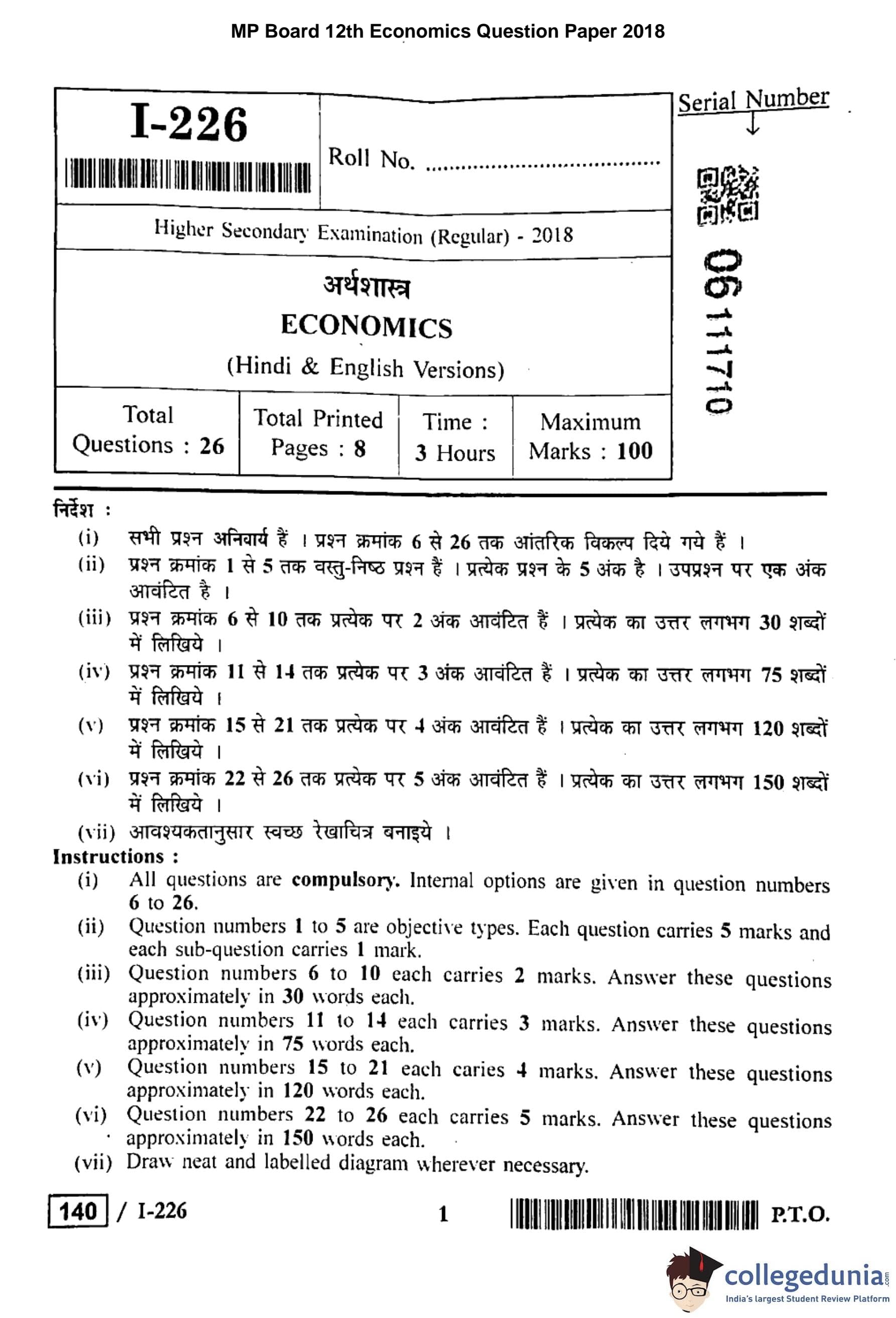 MP Board 12th Economics Question Paper 2018 with Answer Key pdf is available for download here. The exam was conducted by Madhya Pradesh Board of Secondary Education, MPBSE on March 12, 2018 in the Morning Session 9 AM to 12 PM. The question paper comprised a total of 26 questions.