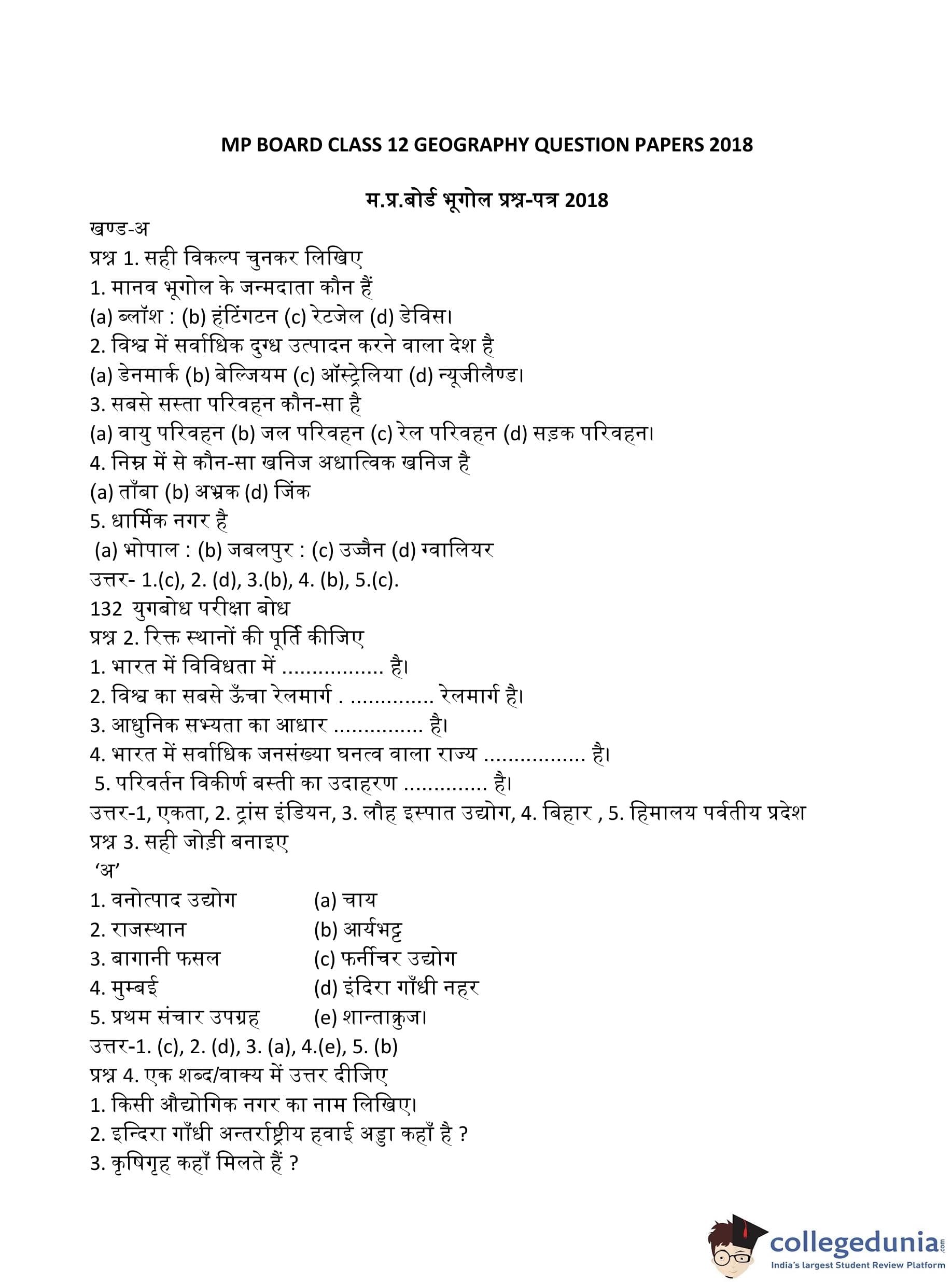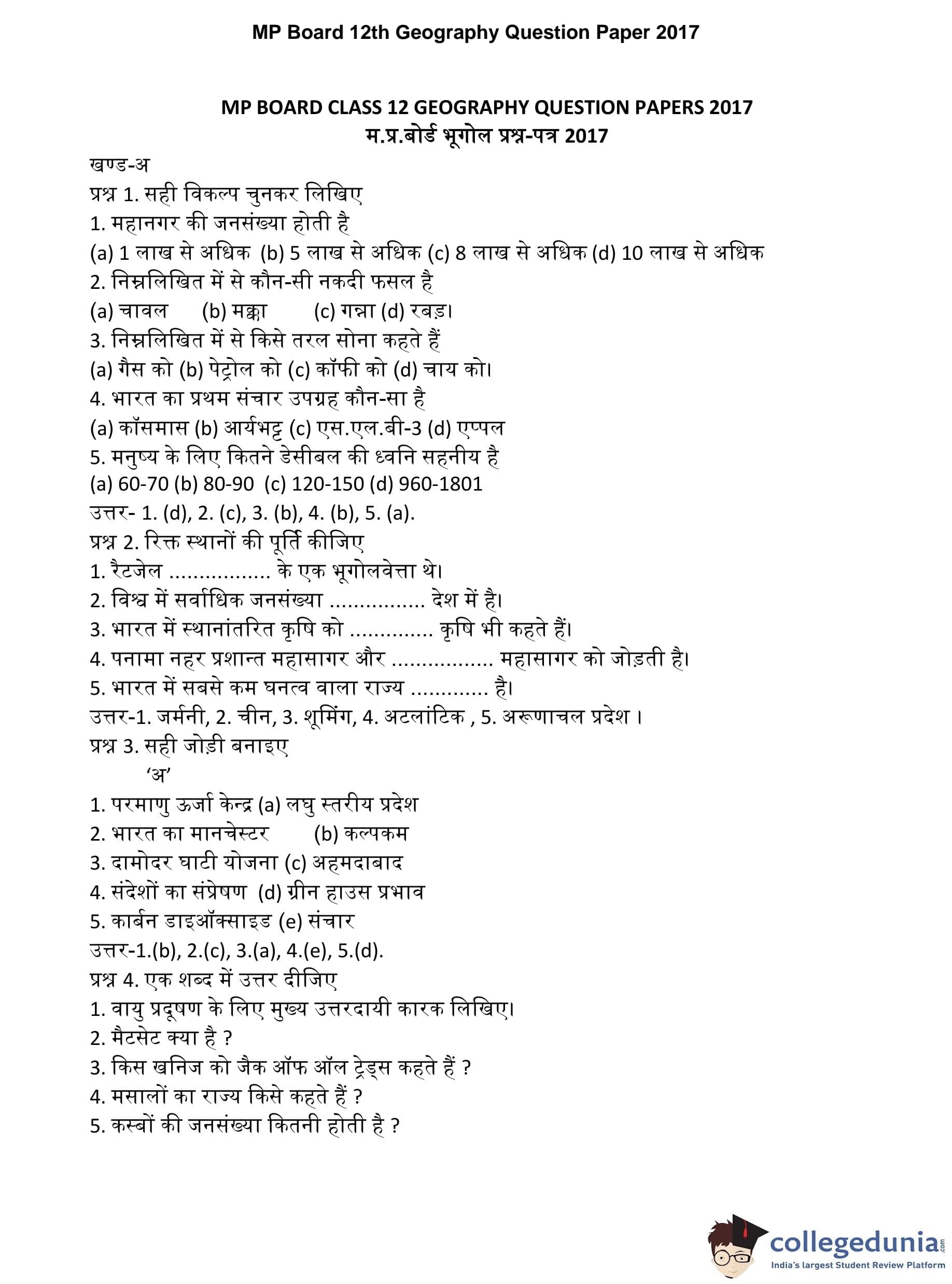 | MP Board 12th Geography Question Paper 2017 PDF | MP Board 12th Geography Answer Key 2017 PDF |