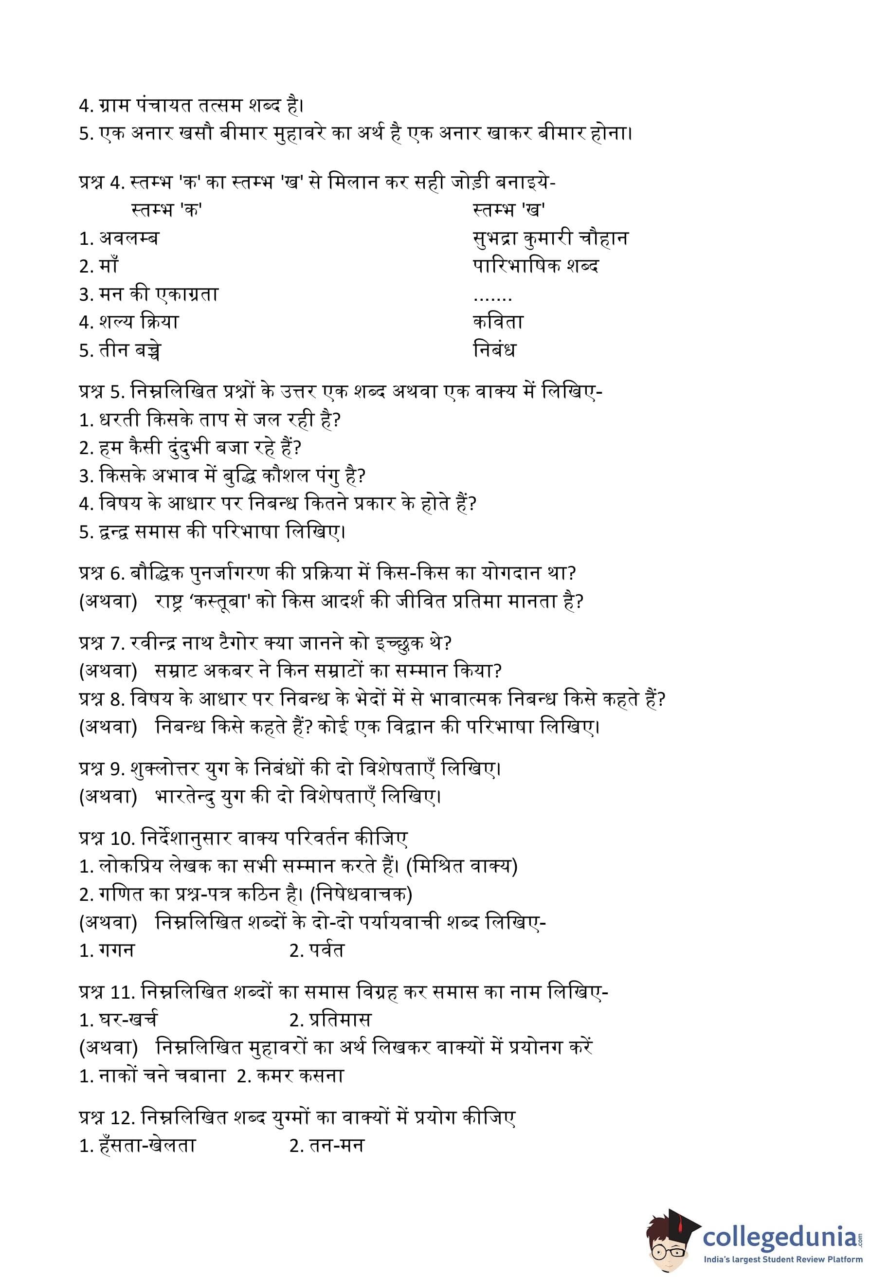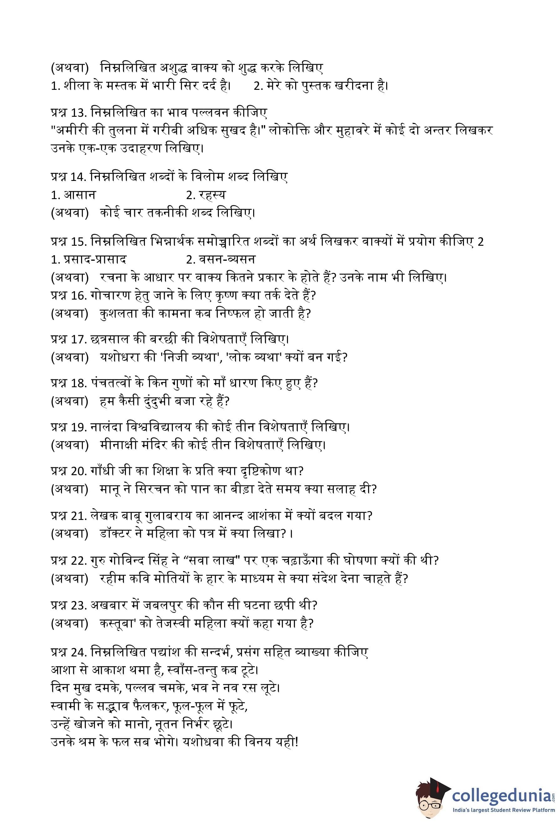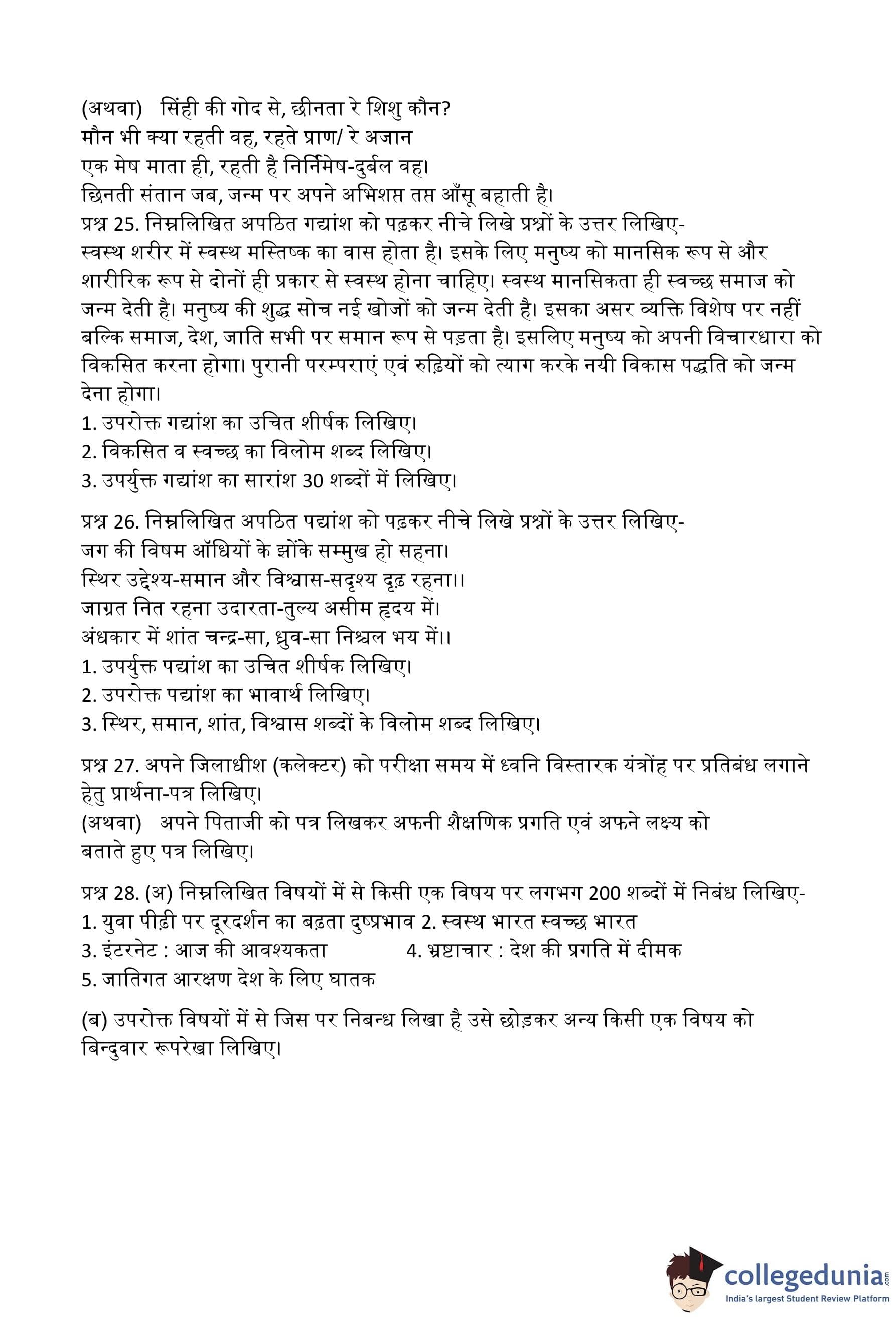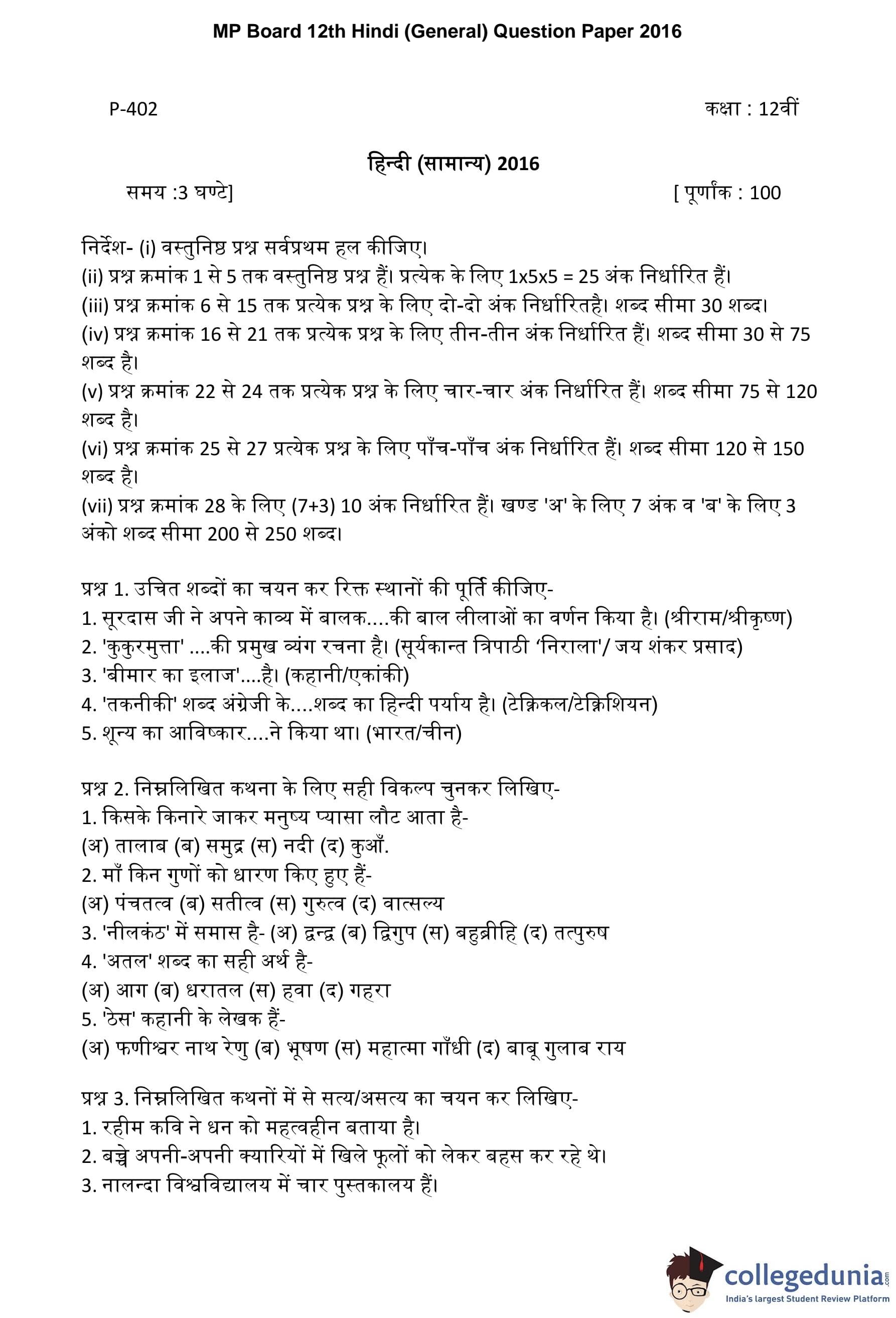 MP Board 12th Hindi (General) Question Paper 2016 with Answer Key