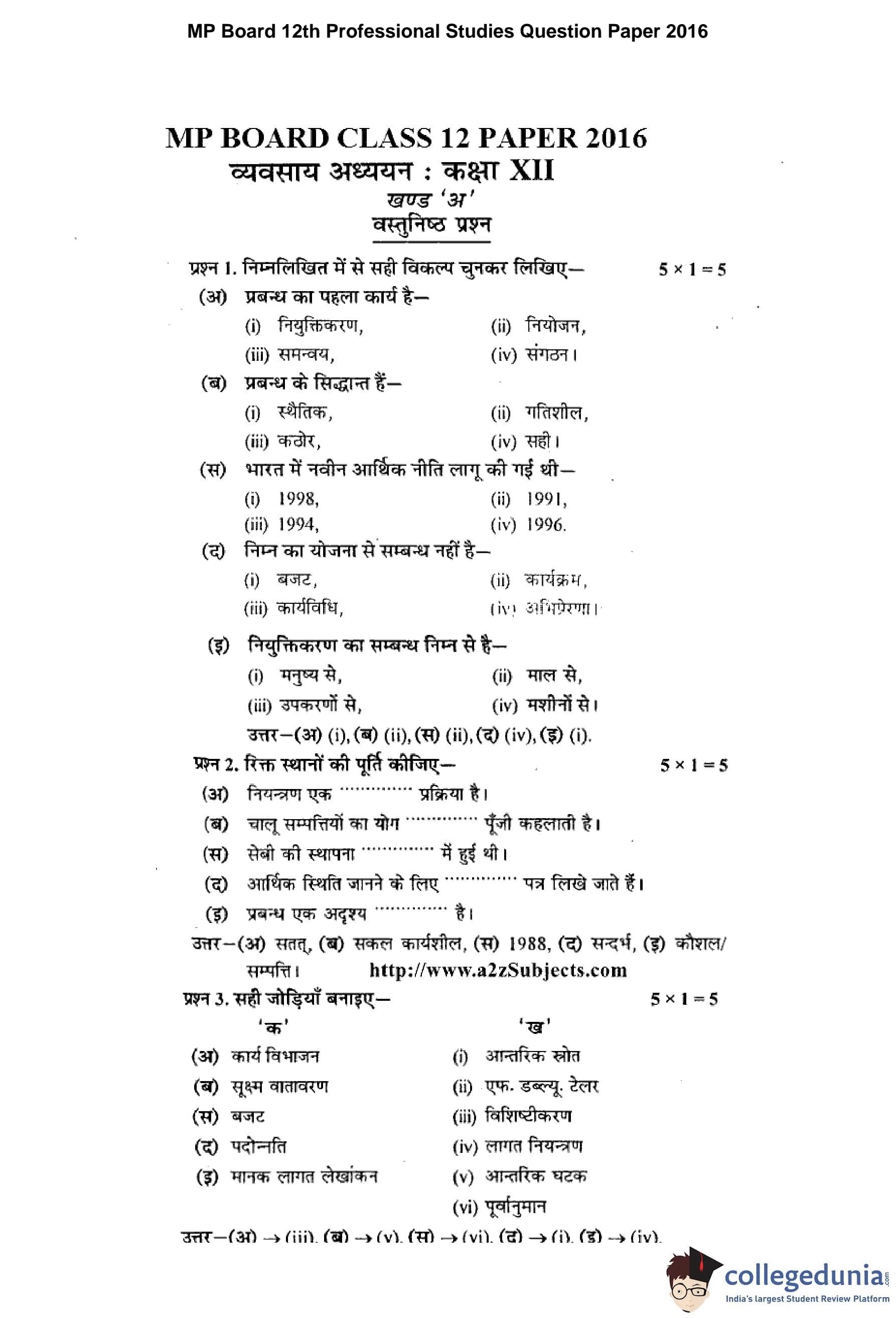 MP Board 12th Professional Studies Question Paper 2016 with Answer Key pdf is available for download here. The exam was conducted by Madhya Pradesh Board of Secondary Education, MPBSE. The question paper comprised a total of 24 questions divided among 2 sections.