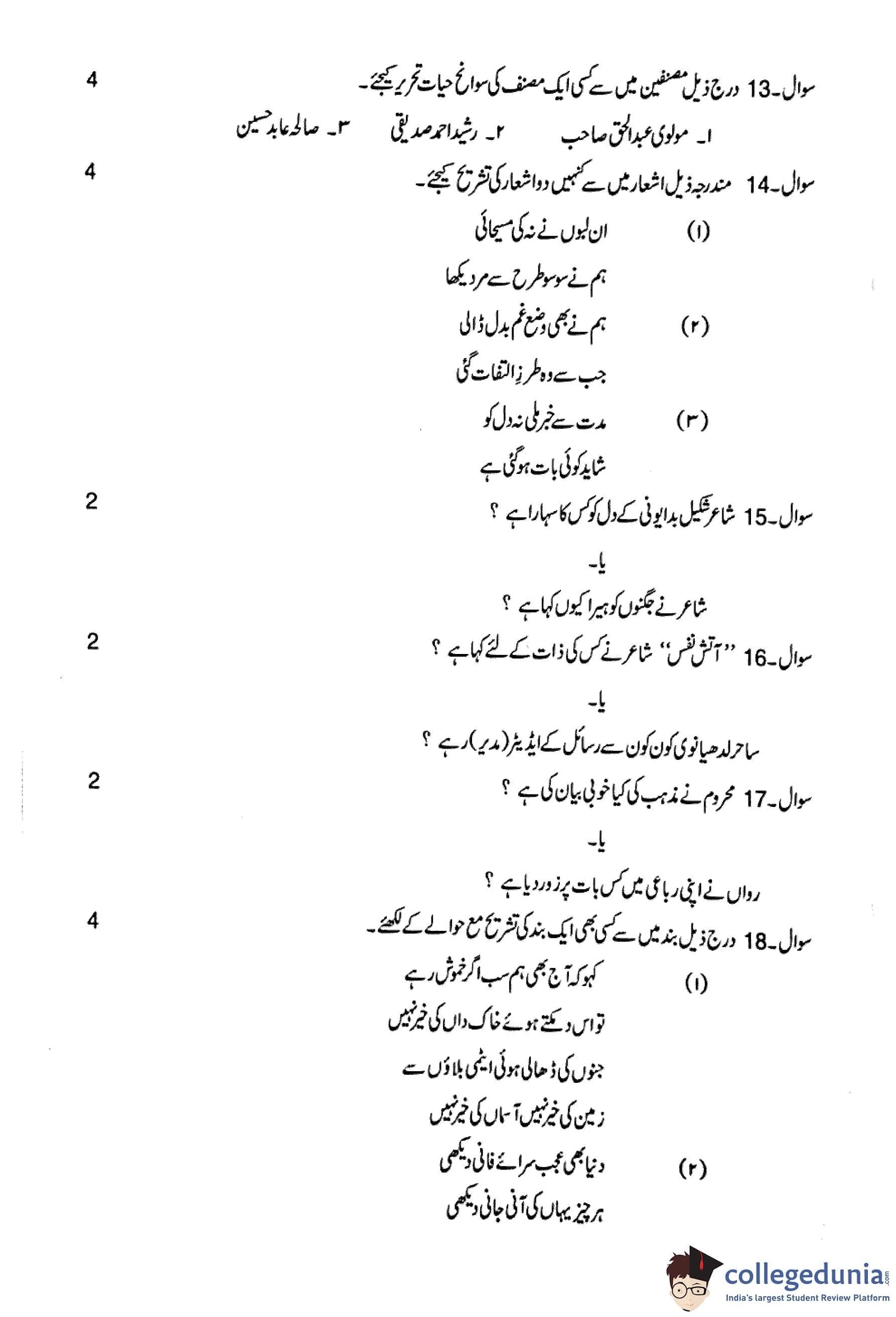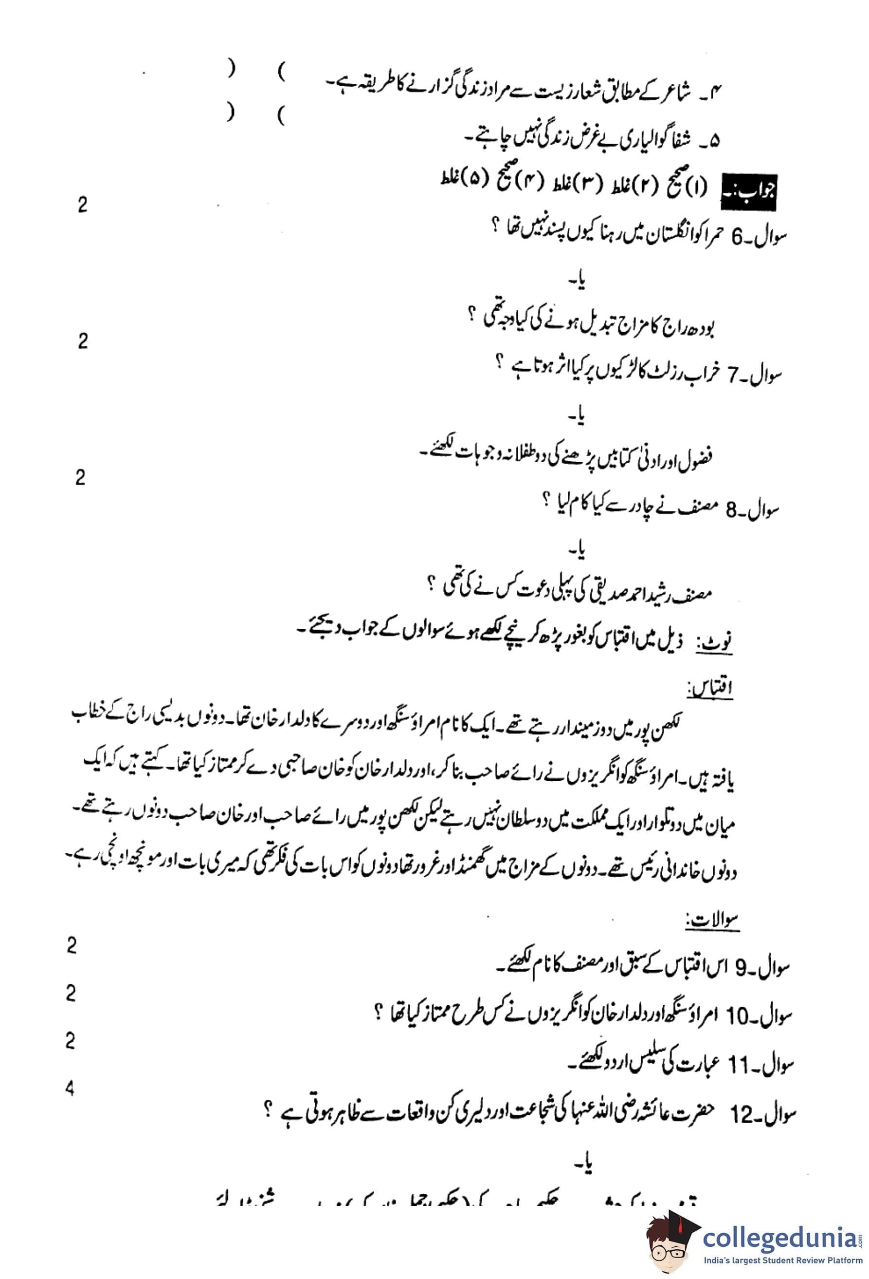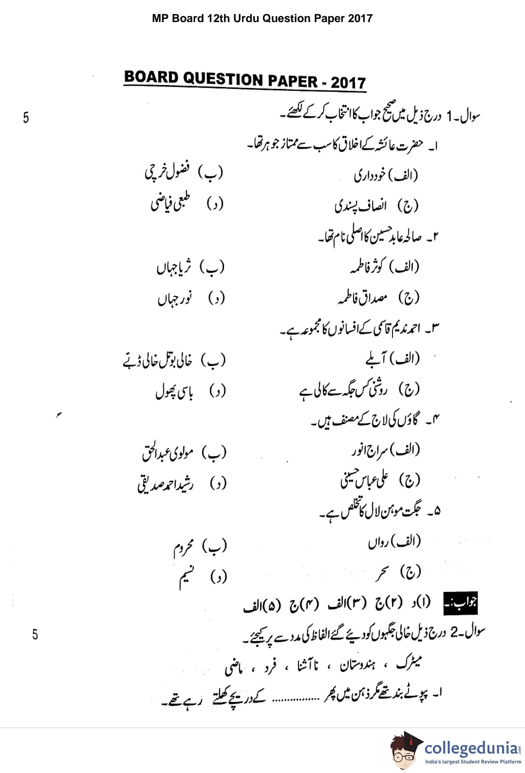 MP Board 12th Urdu Question Paper 2017 with Answer Key