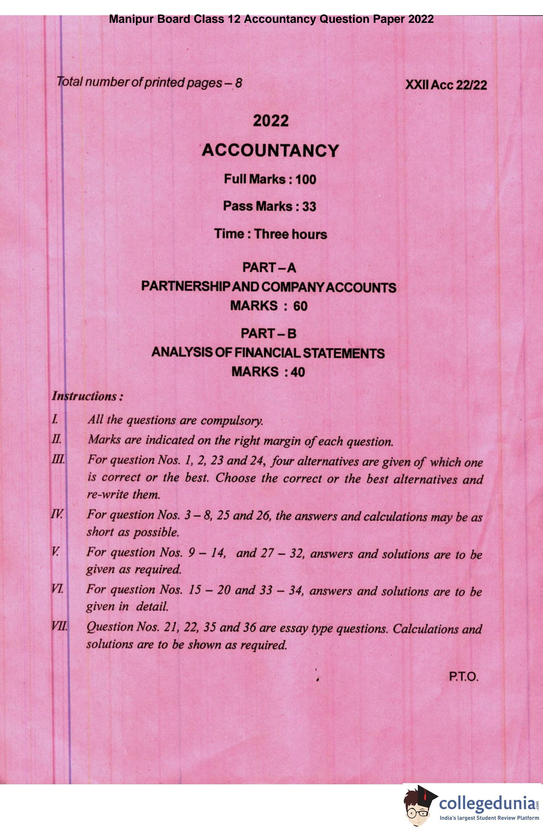 | Manipur Board Class 12 Accountancy Question Paper 2022 PDF | Manipur Board Class 12 Accountancy Answer Key 2022 PDF |