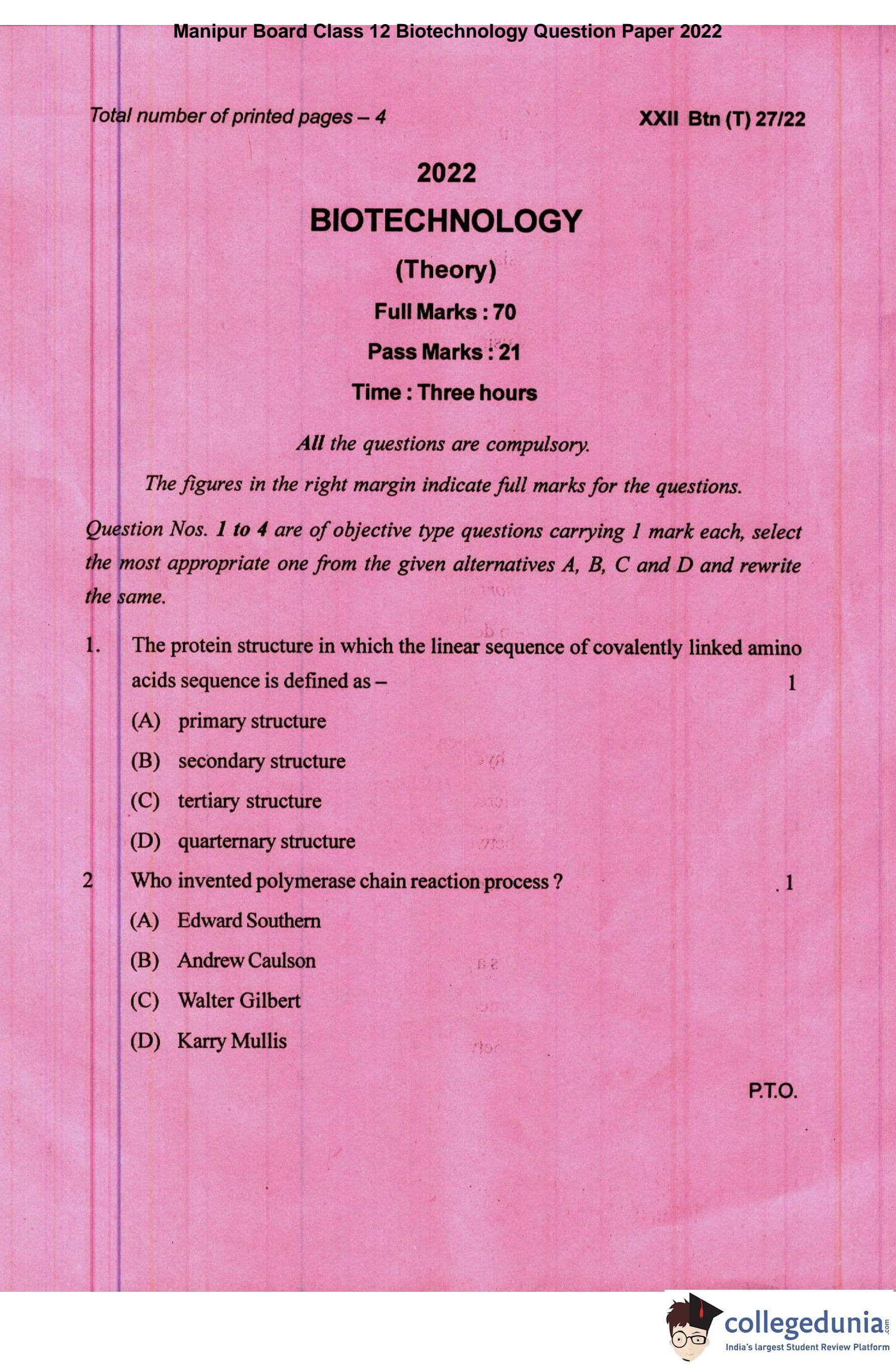 | Manipur Board Class 12 Biotechnology Question Paper 2022 PDF | Manipur Board Class 12 Biotechnology Answer Key 2022 PDF |
