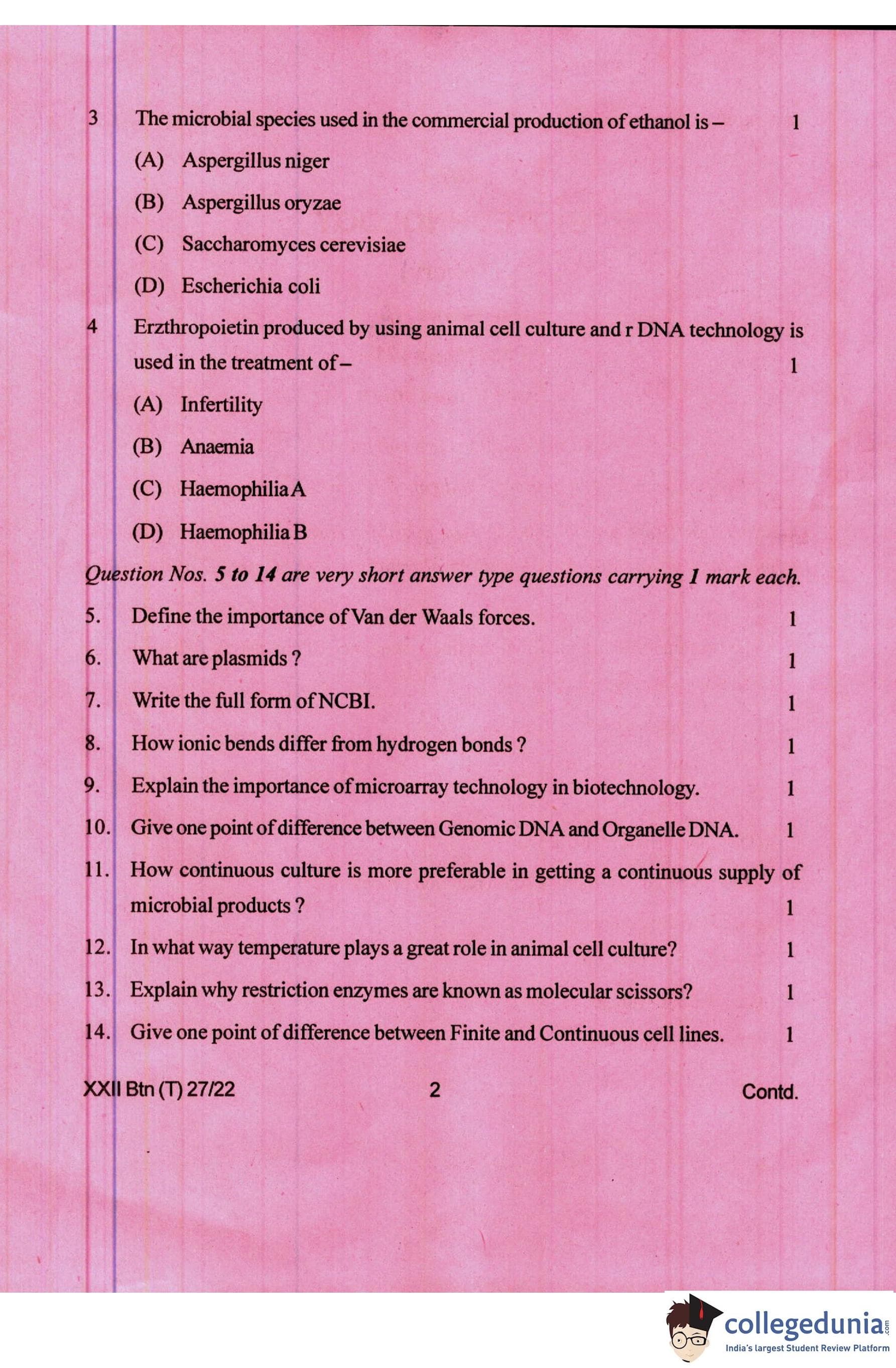 Manipur Board Class 12 Biotechnology Question Paper 2022