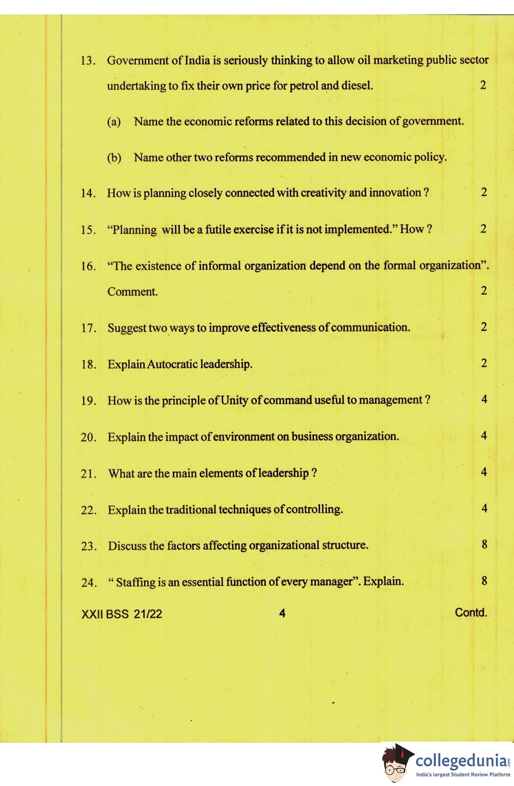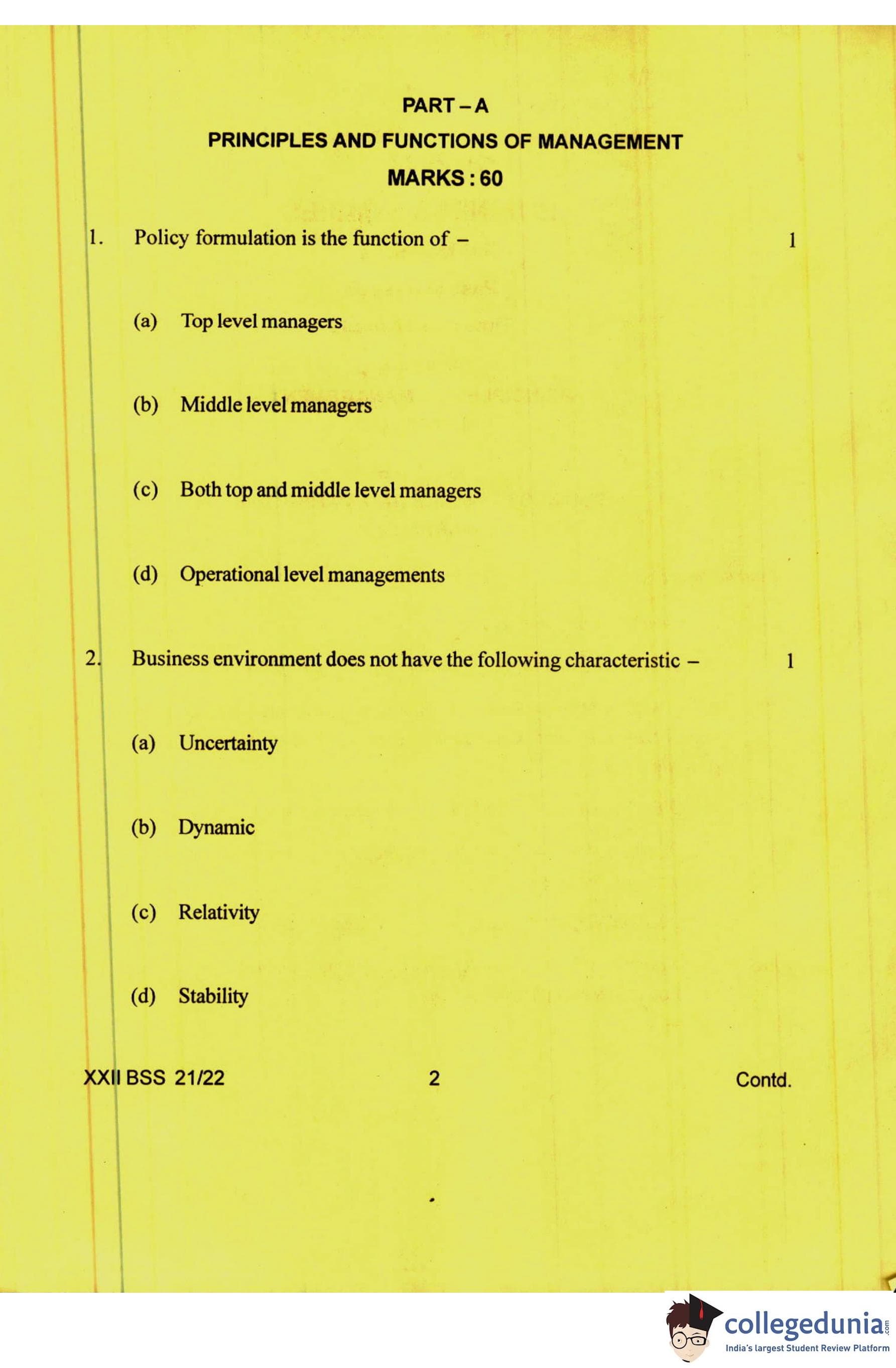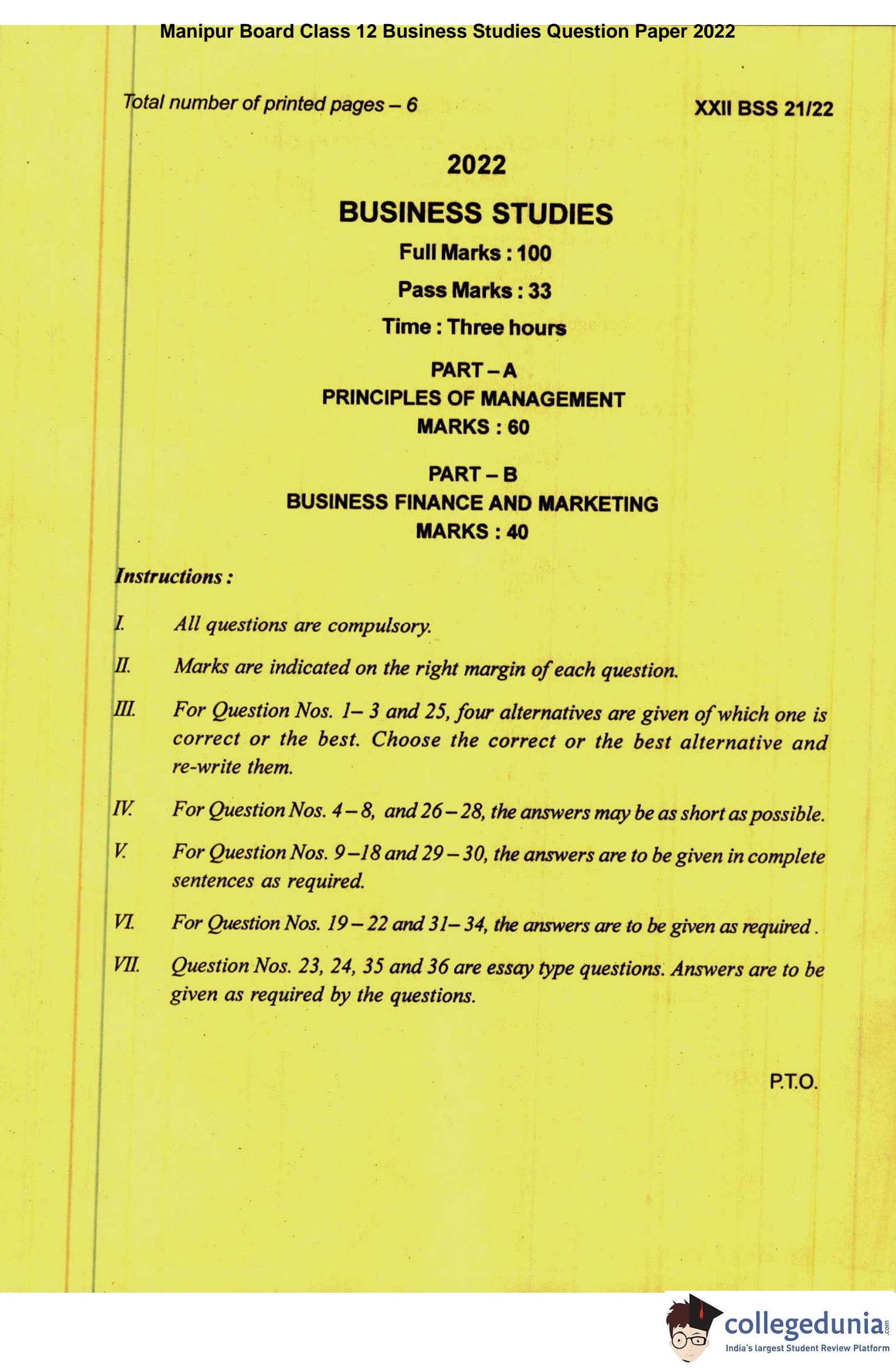 Manipur Board Class 12 Business Studies Question Paper 2022 with Answer Key pdf is available for download here. The exam was conducted by Council Of Higher Secondary Education, Manipur on April 16, 2022. The question paper comprised a total of 36 questions divided among 2 sections.