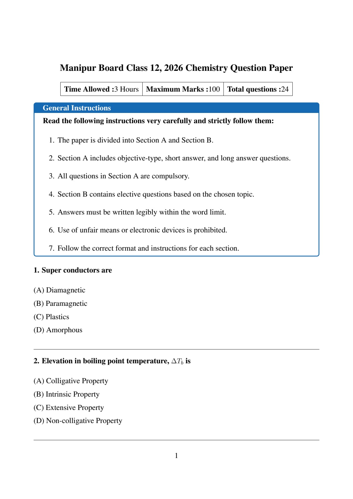 | Manipur Board Class 12 Chemistry Question Paper 2026 | Download PDF | Check Solutions |