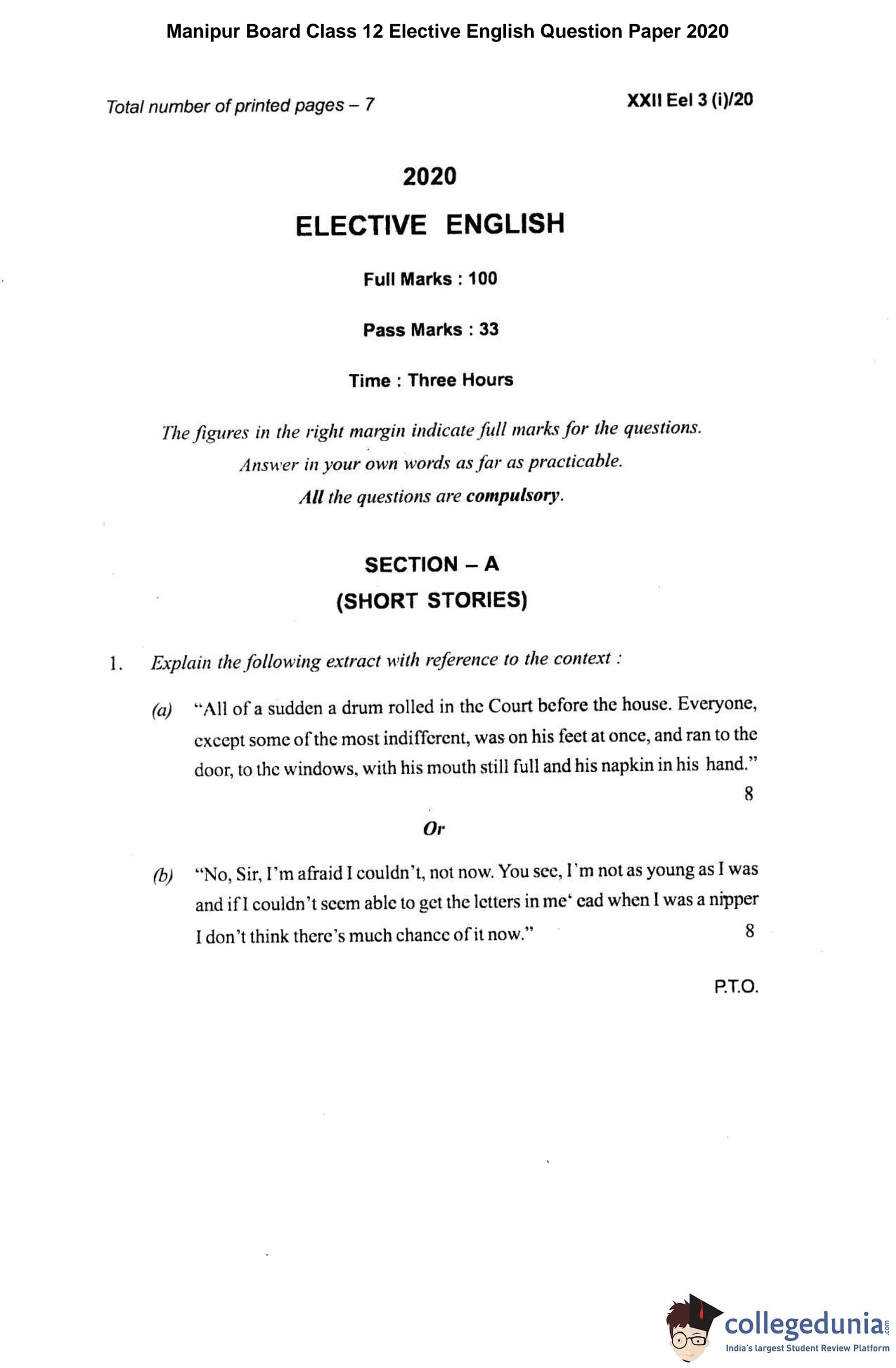 Manipur Board Class 12 Elective English Question Paper 2020