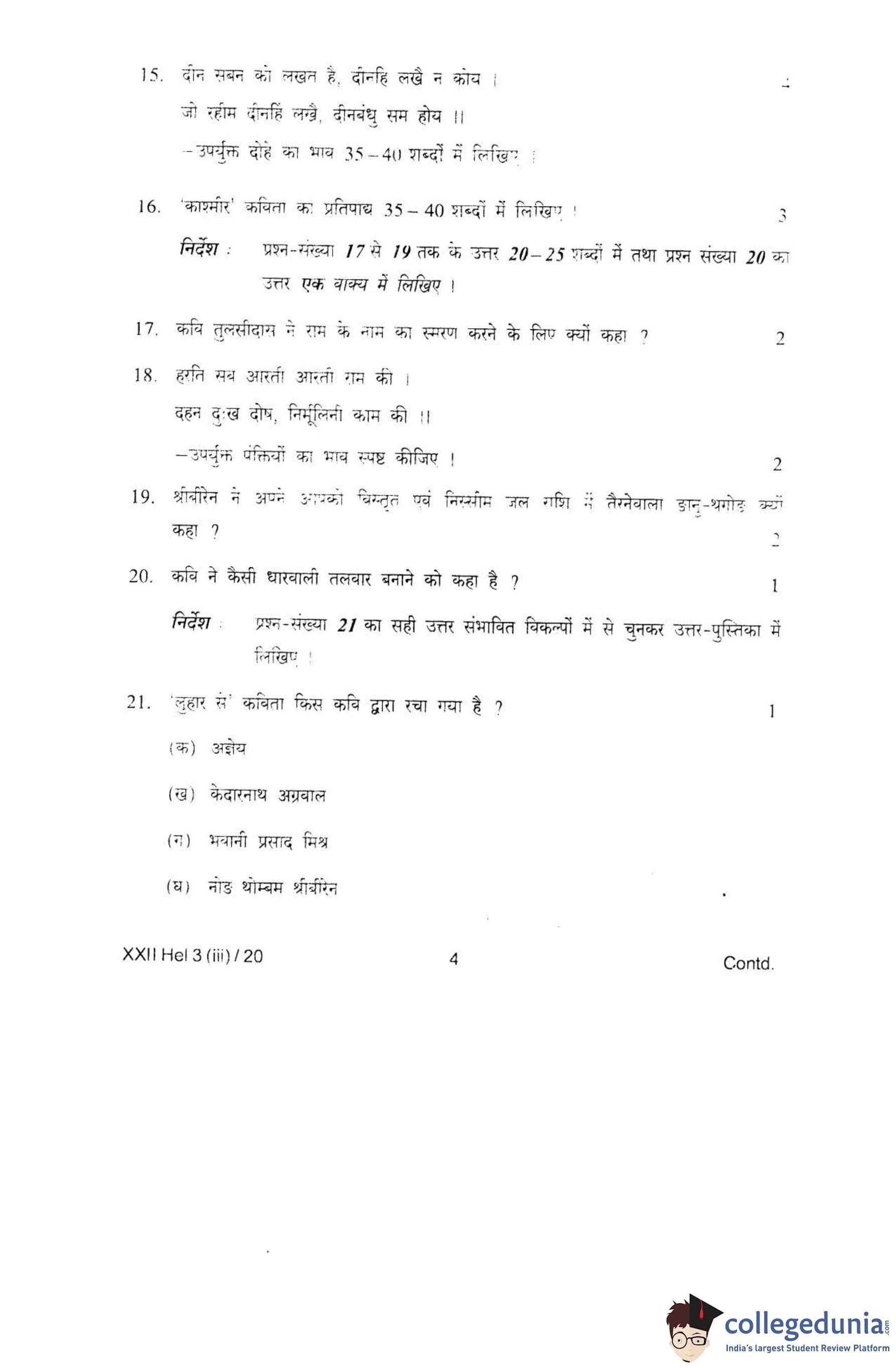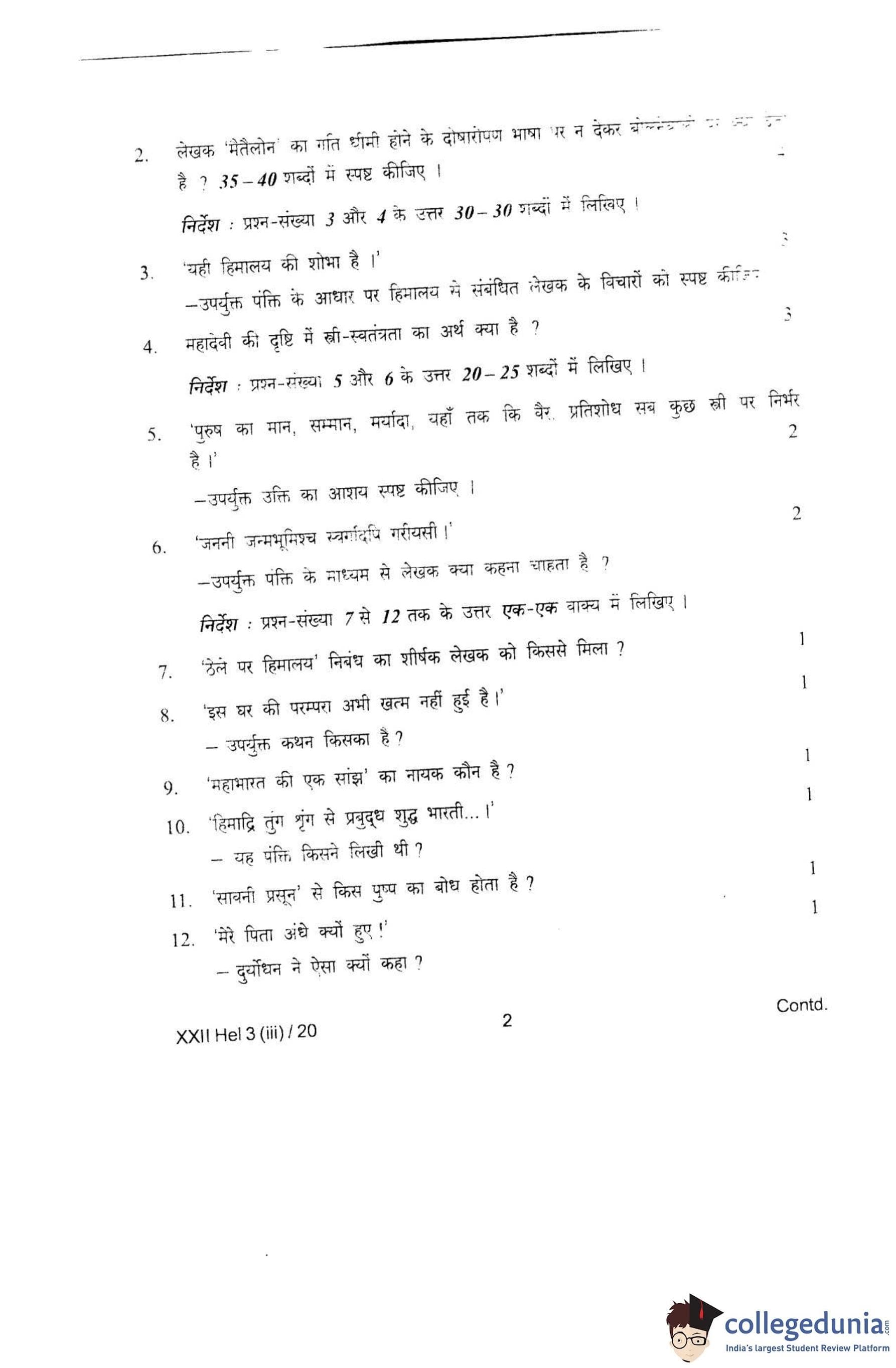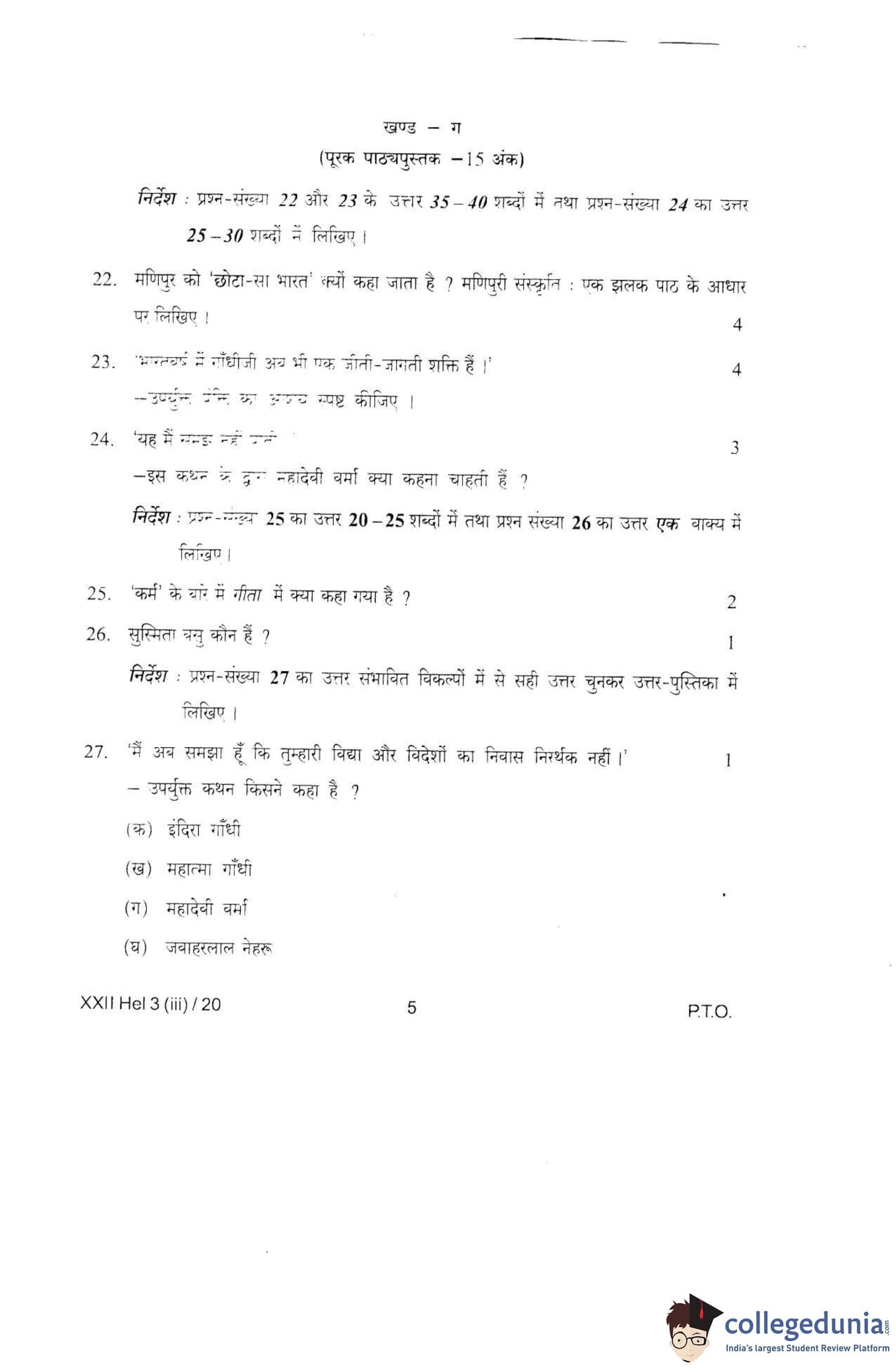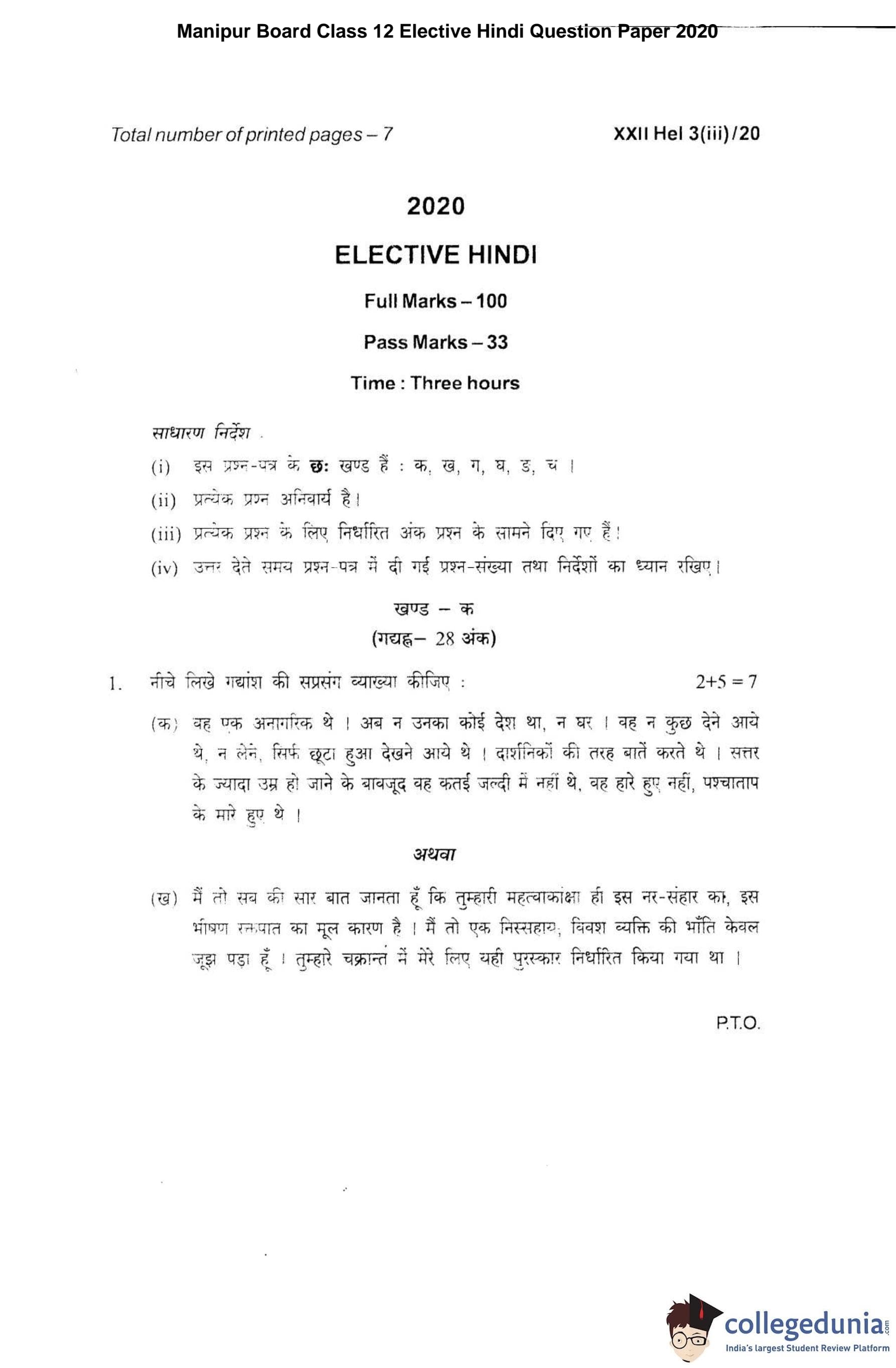 Manipur Board Class 12 Elective Hindi Question Paper 2020