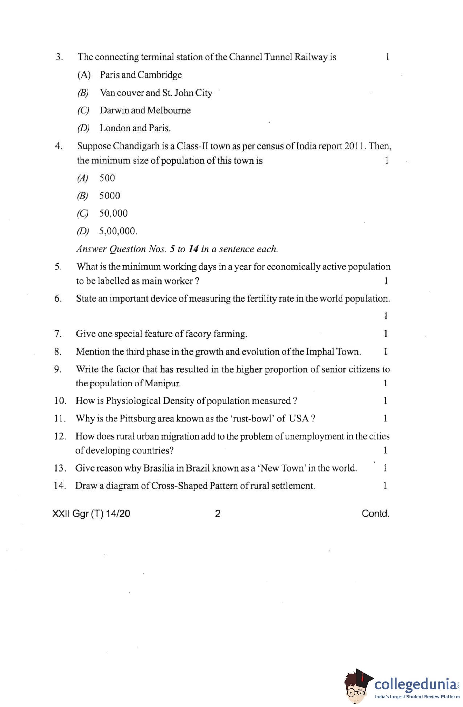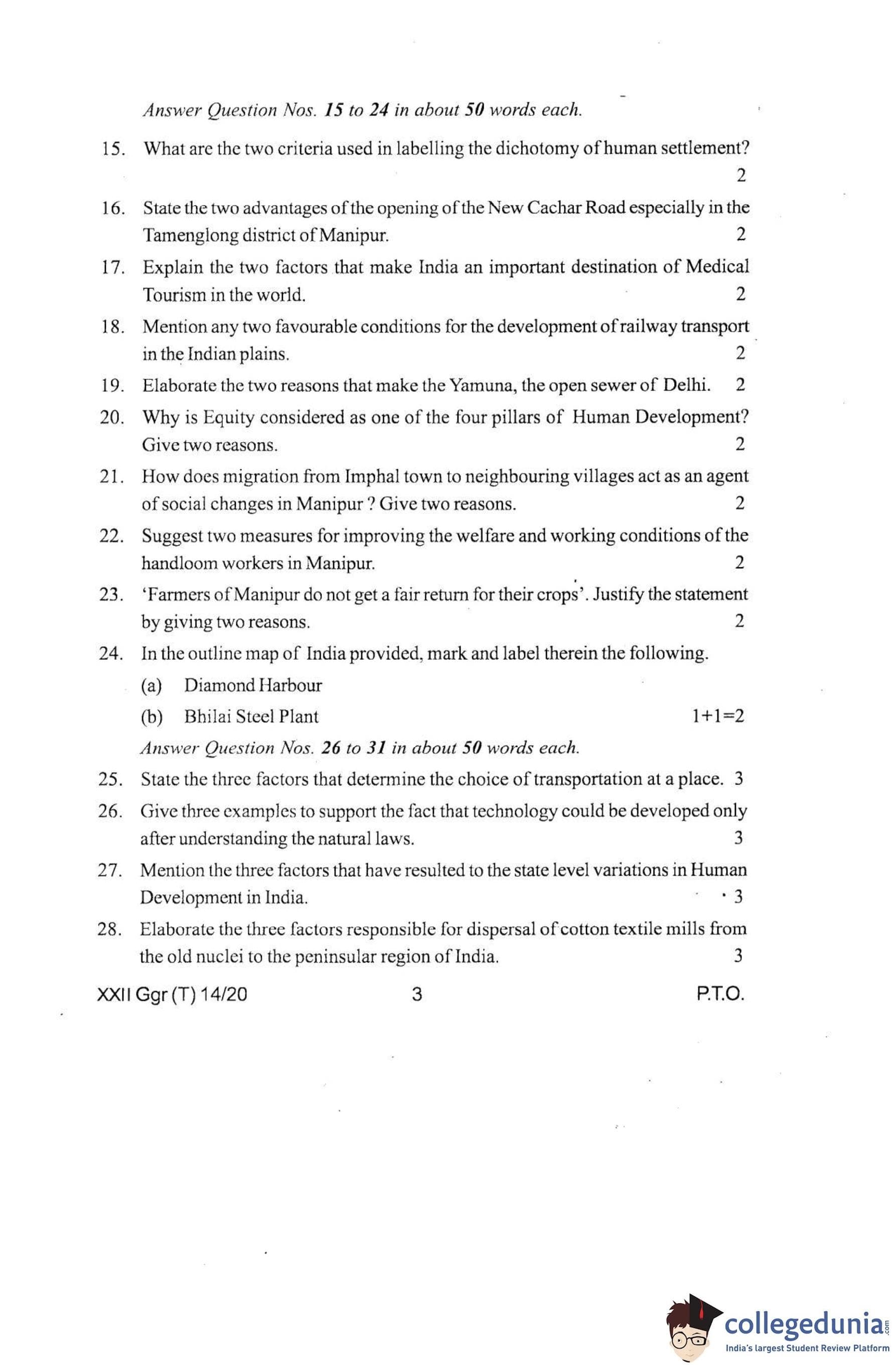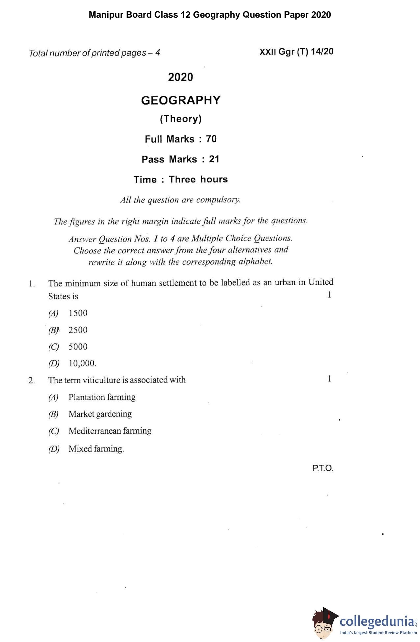 Manipur Board Class 12 Geography Question Paper 2020