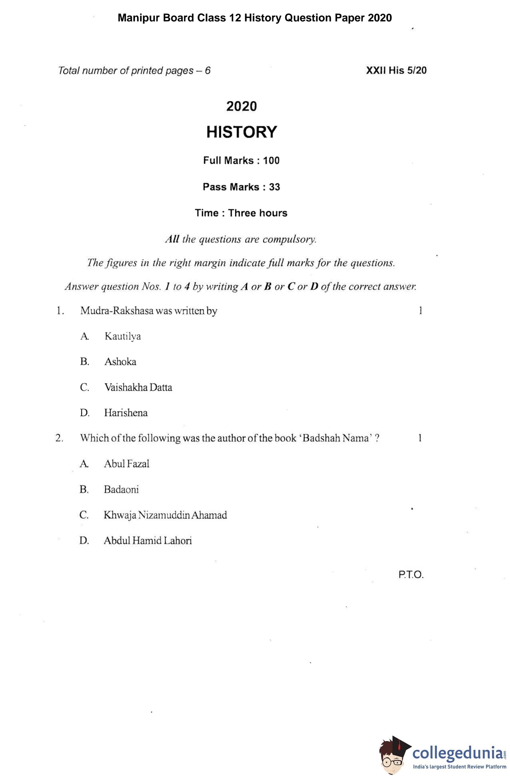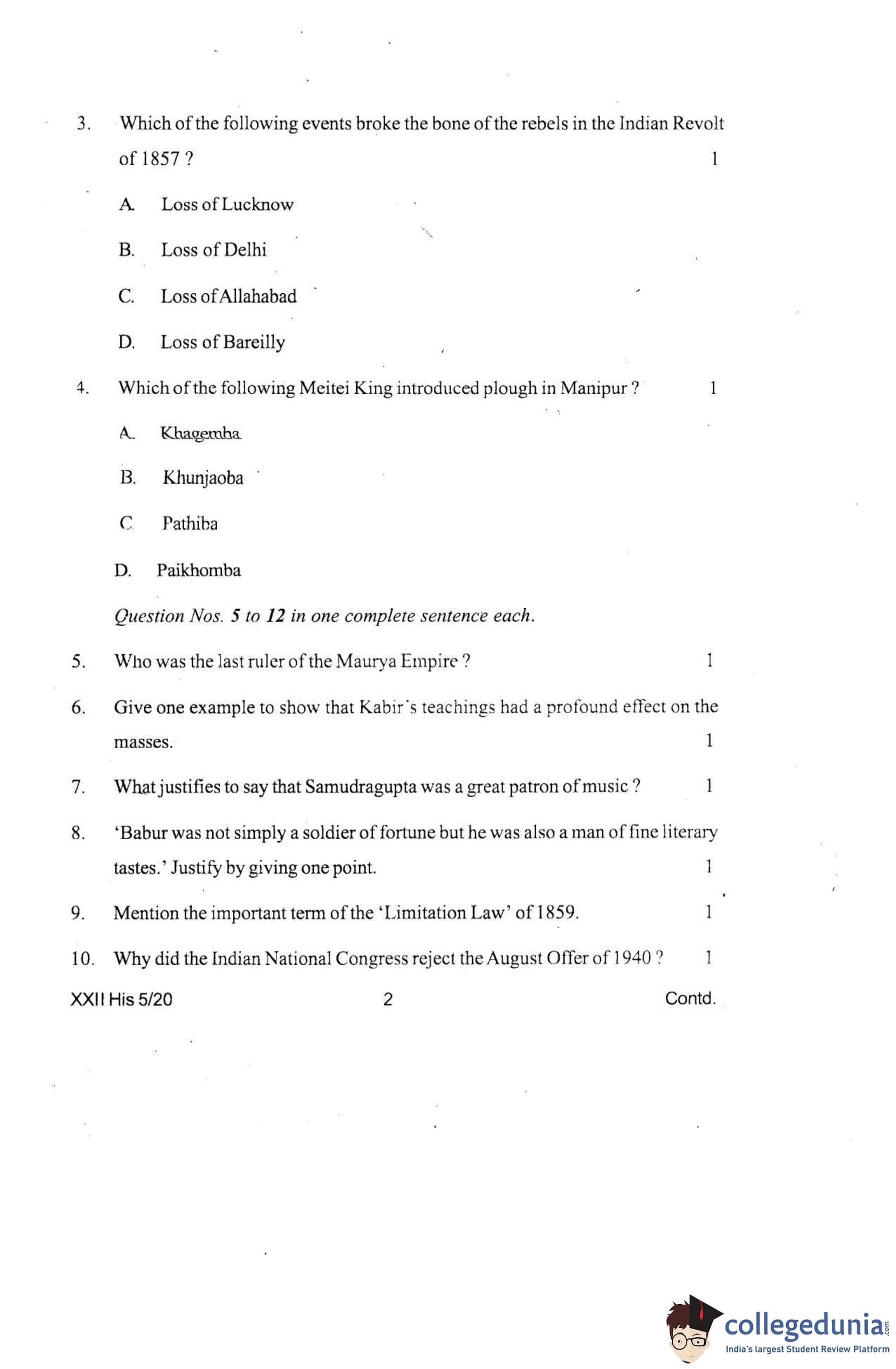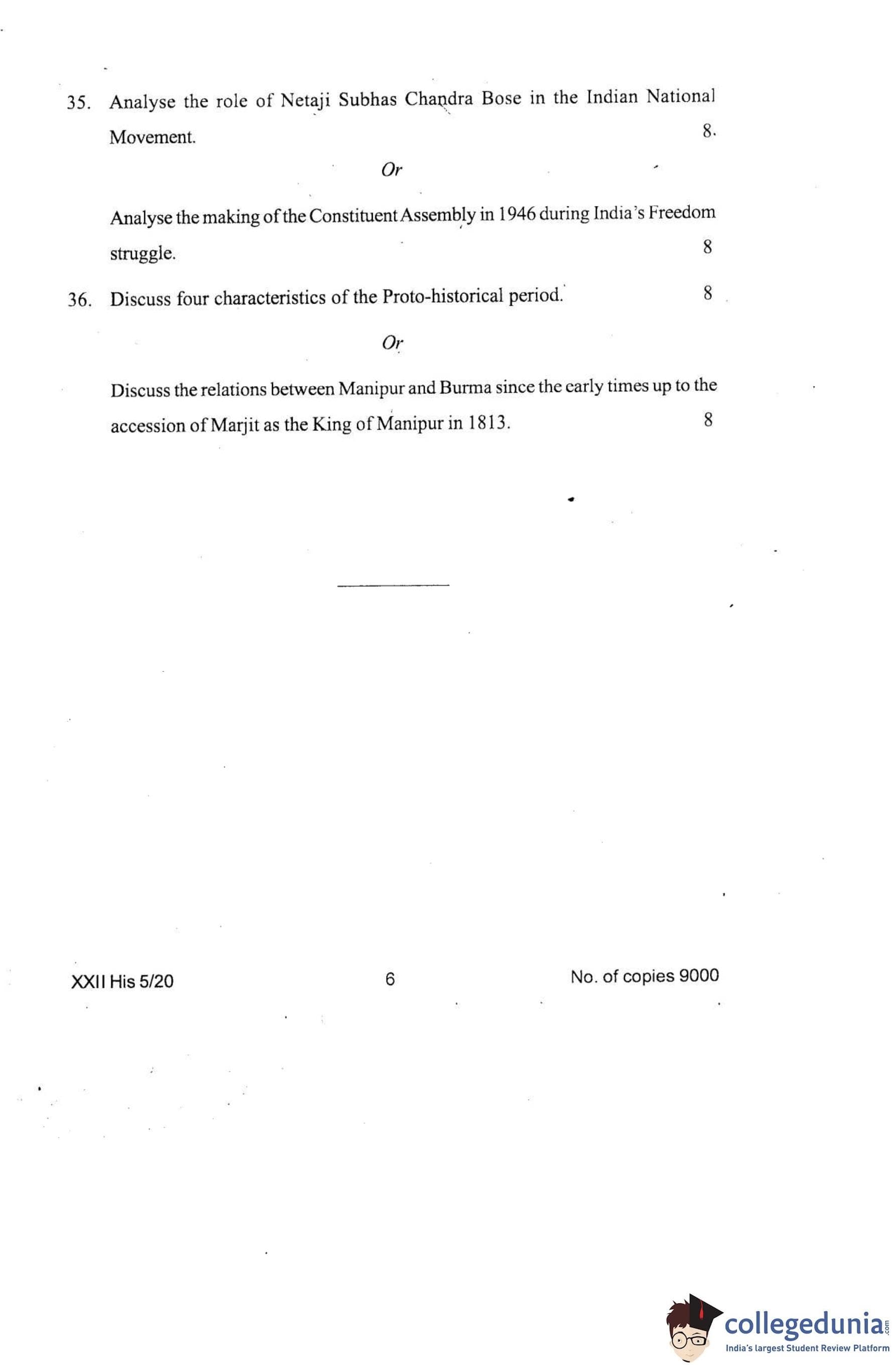 Manipur Board Class 12 History Question Paper 2020