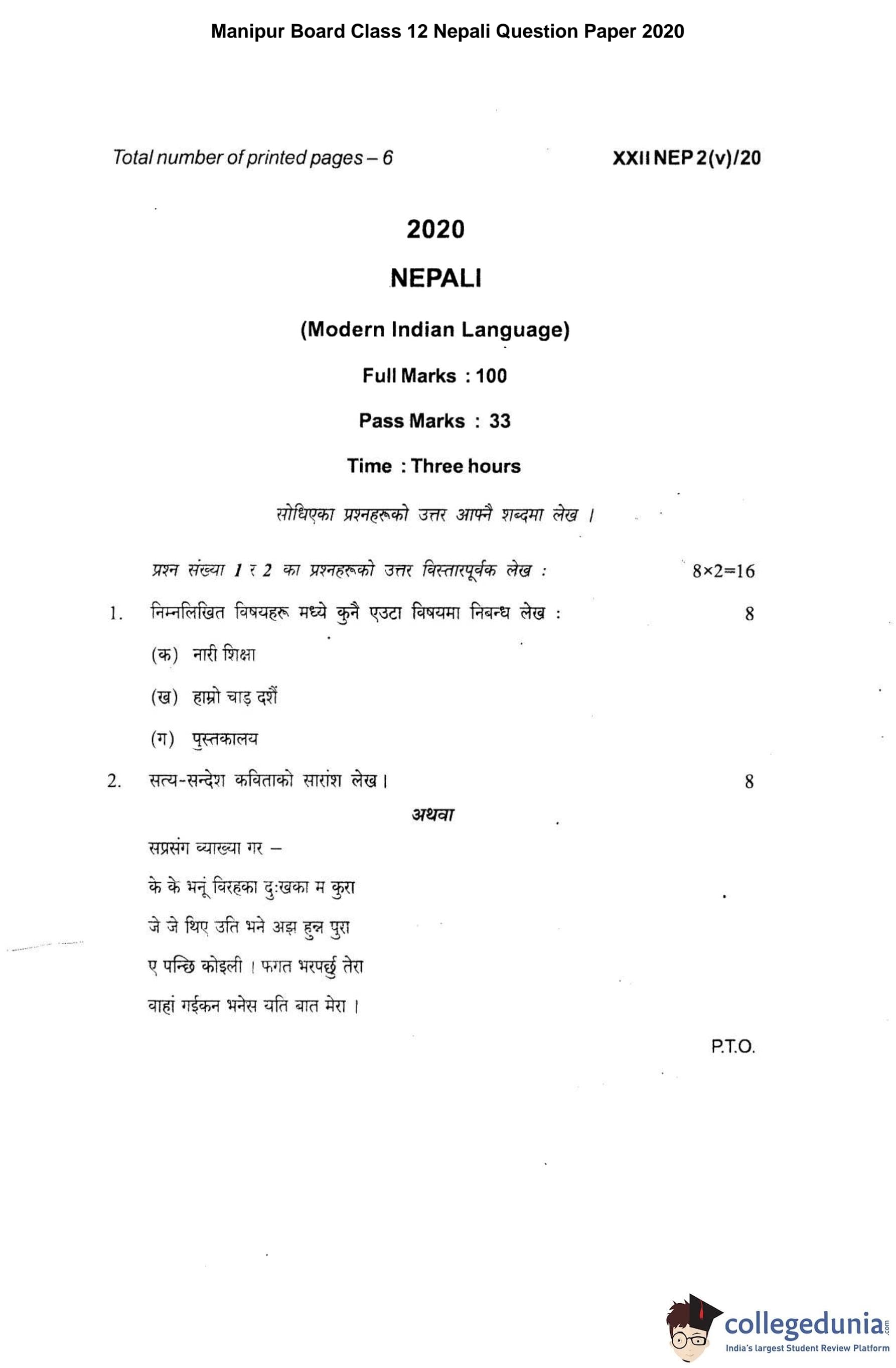| Manipur Board Class 12 Nepali Question Paper 2020 PDF | Manipur Board Class 12 Nepali Answer Key 2020 PDF |