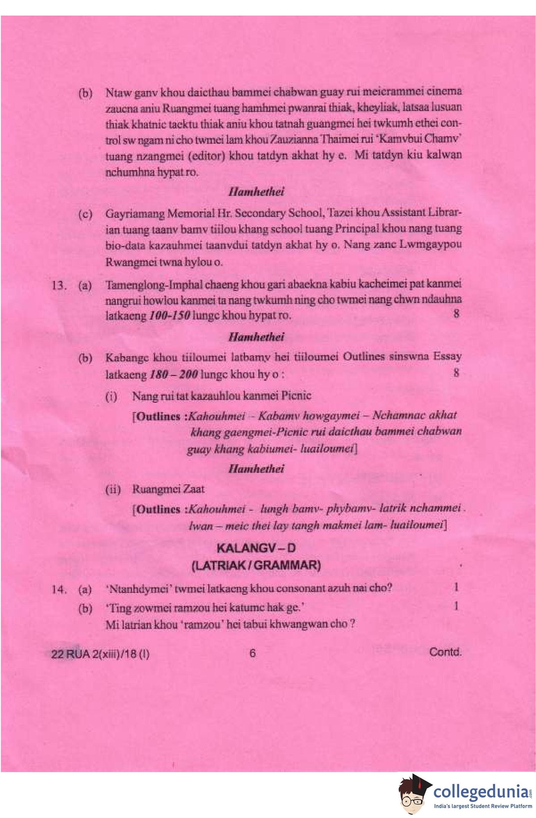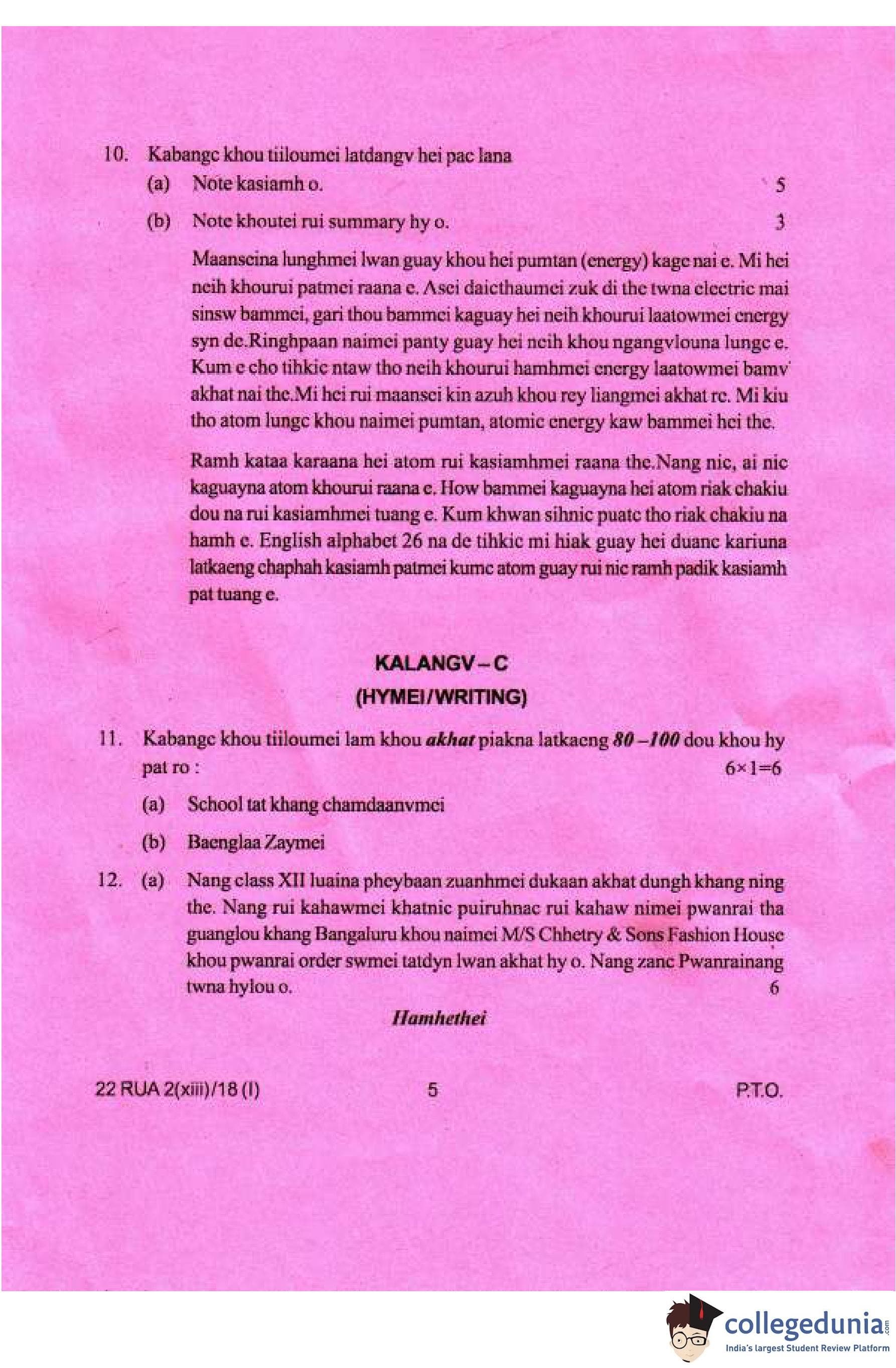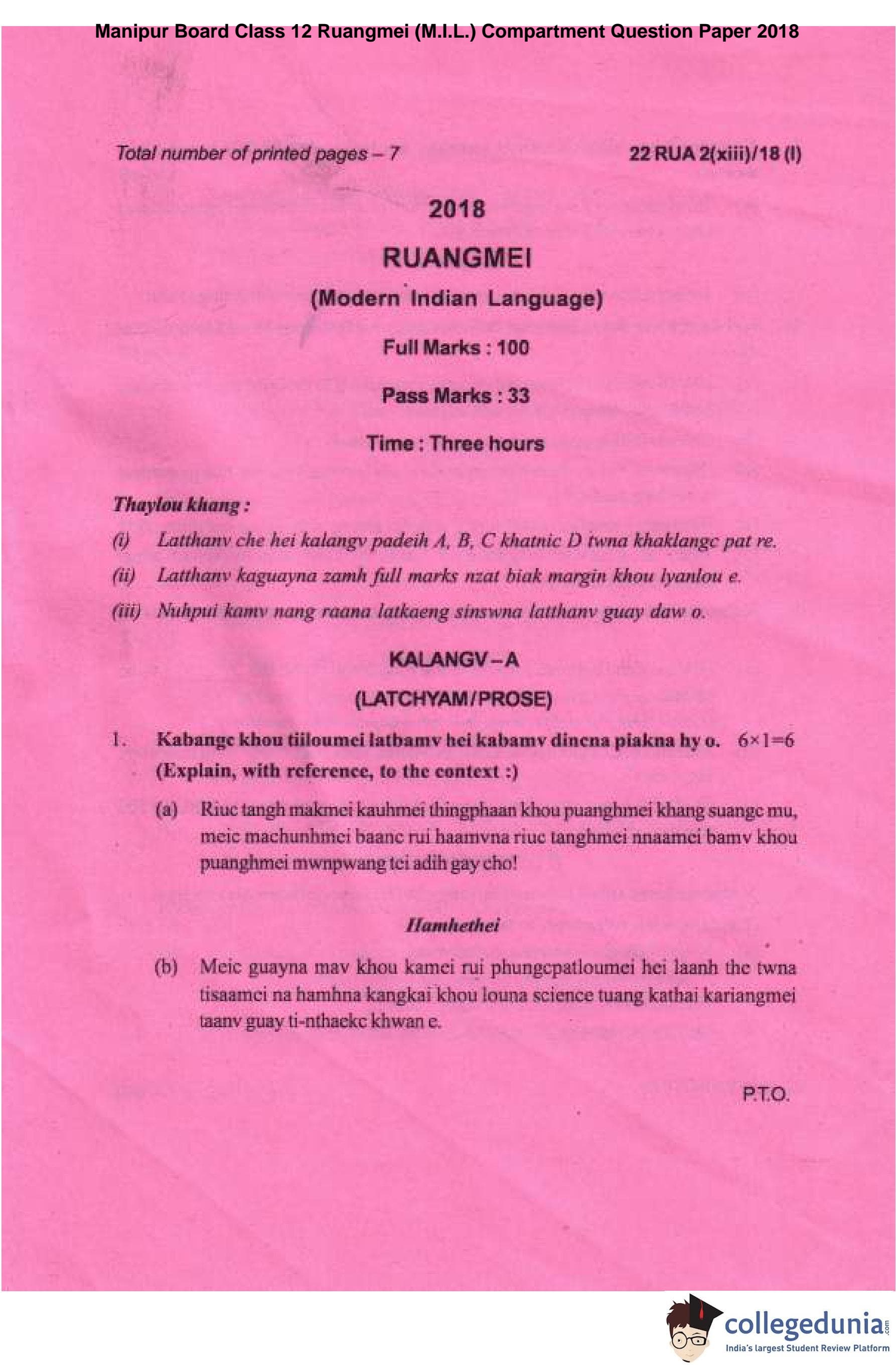 Manipur Board Class 12 Ruangmei (M.I.L.) Compartment Question Paper 2018