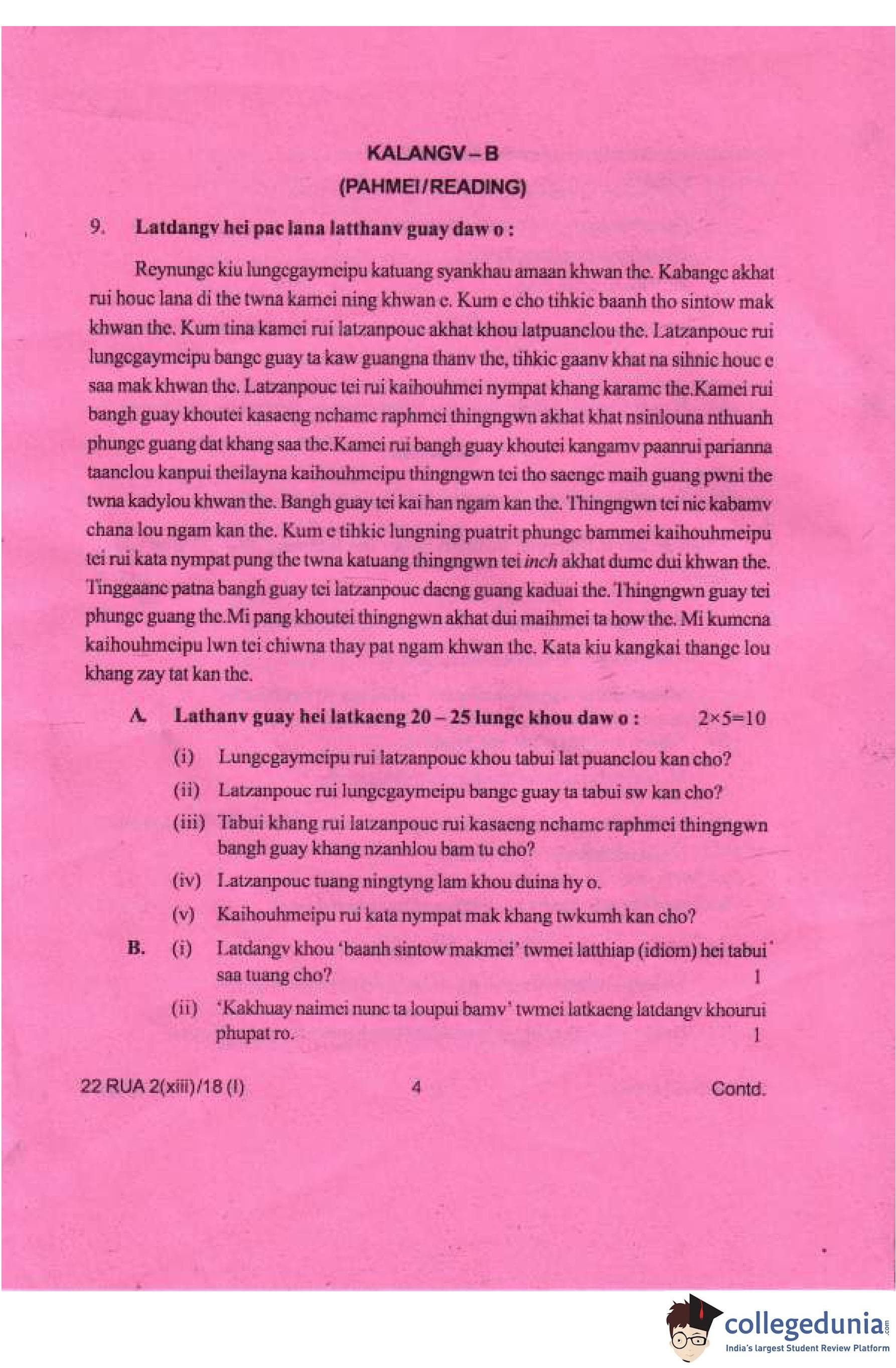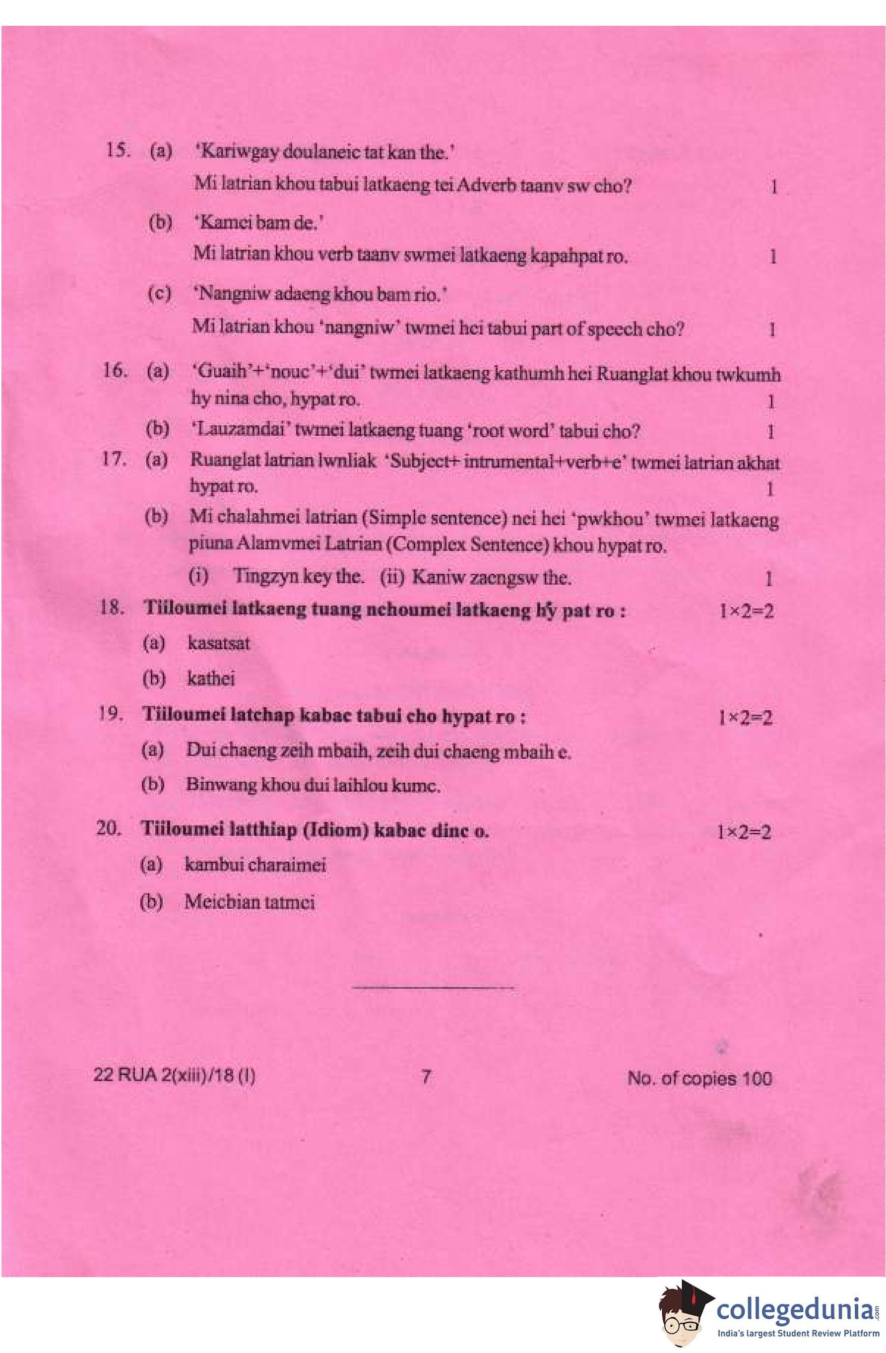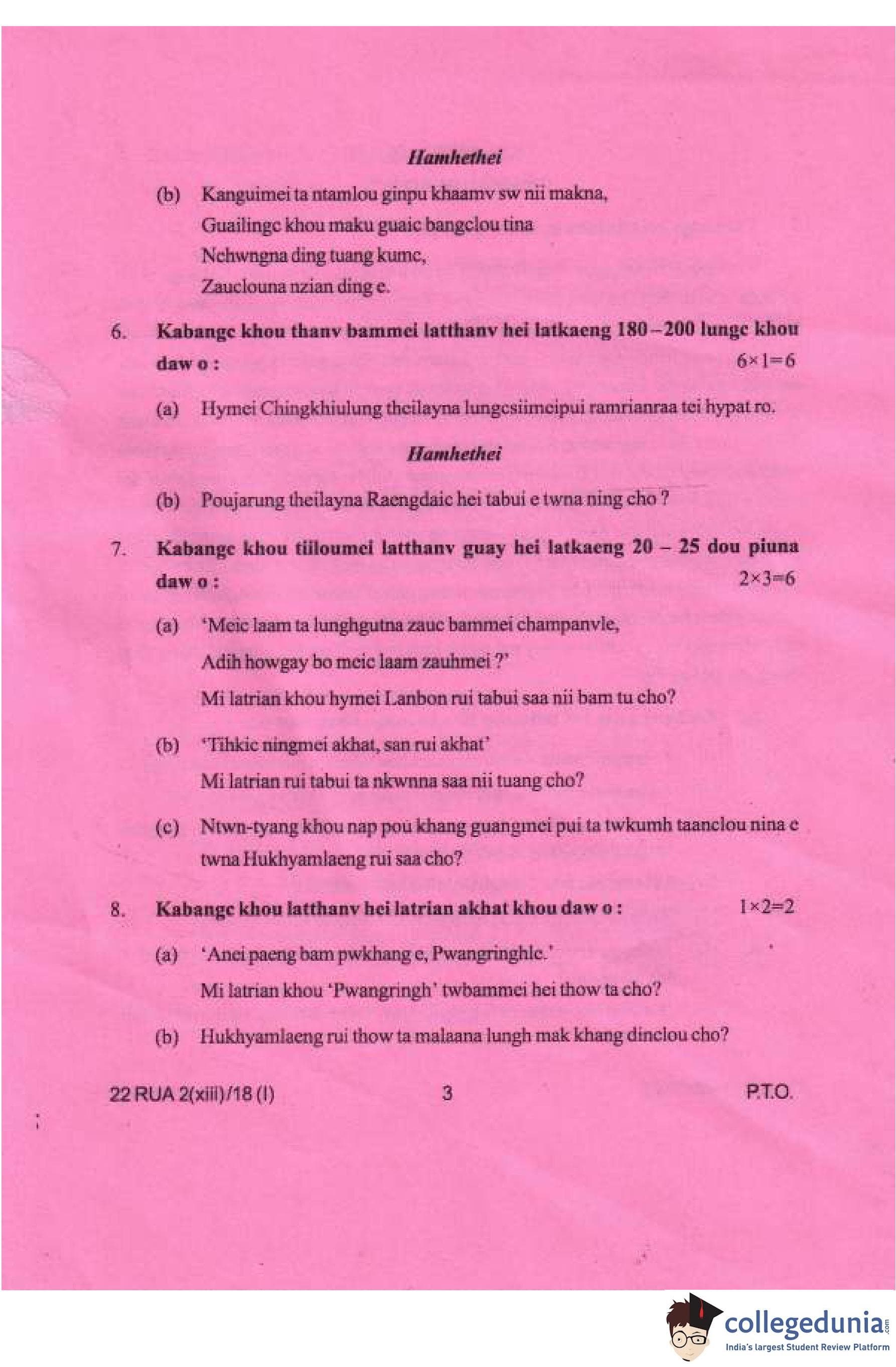 Manipur Board Class 12 Ruangmei (M.I.L.) Compartment Question Paper 2018