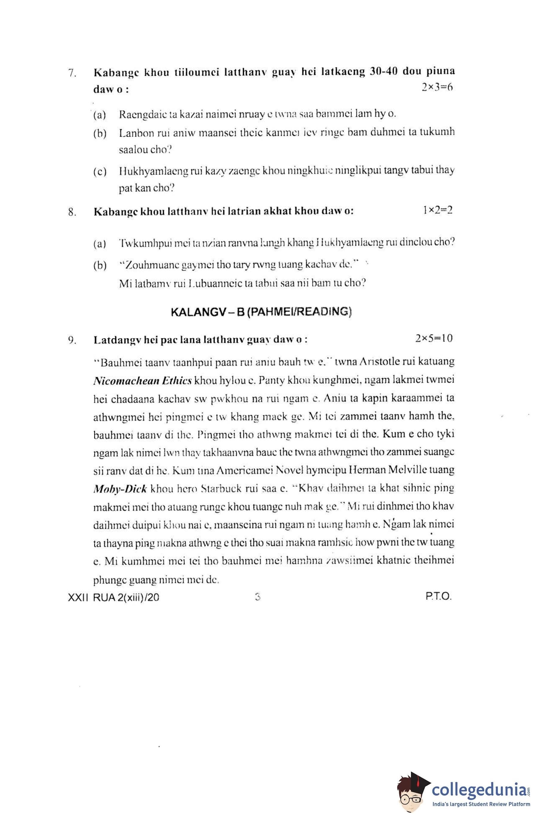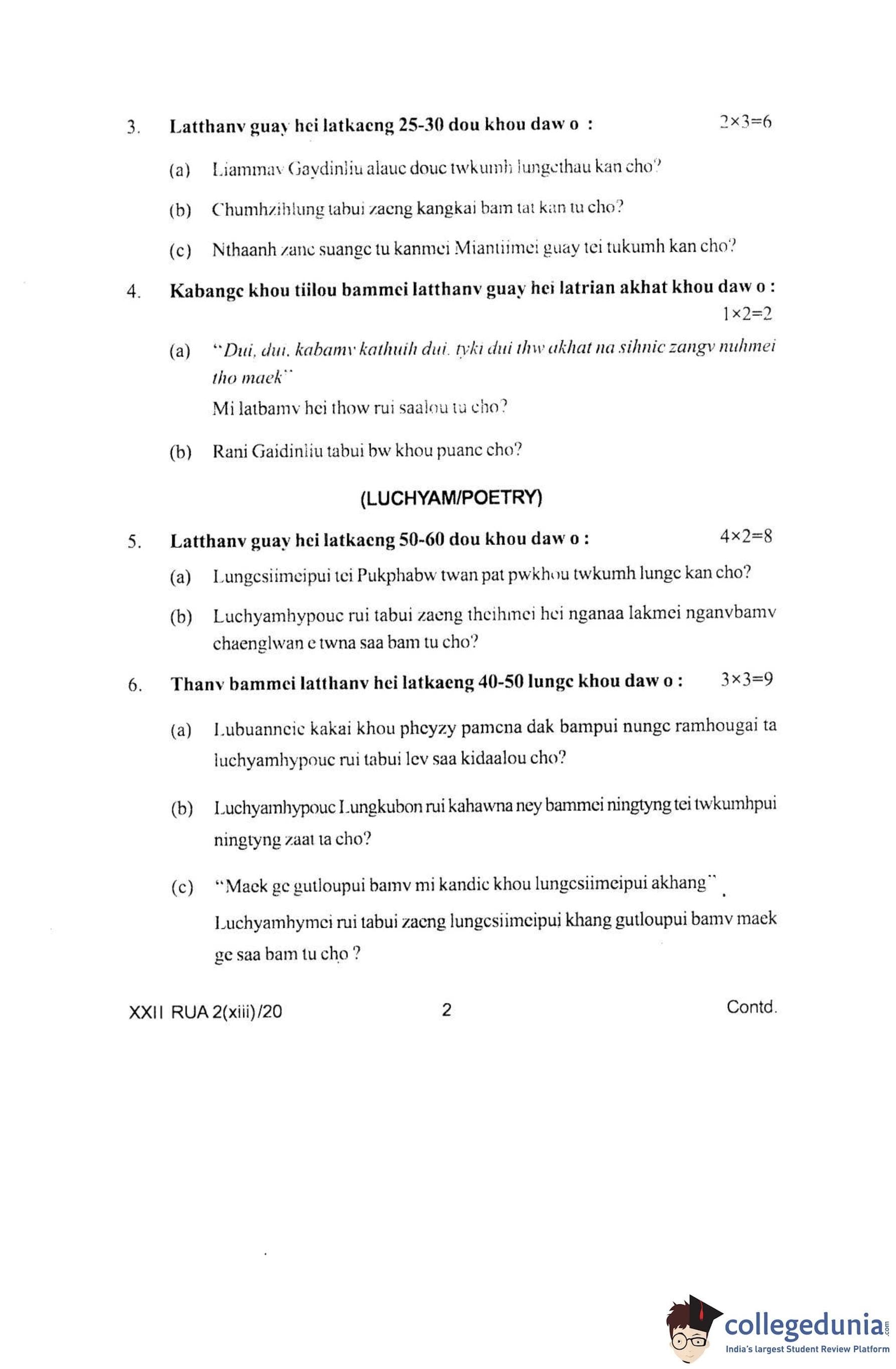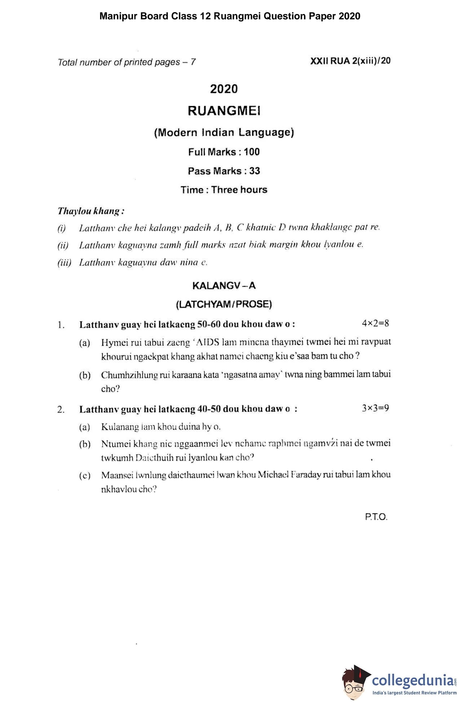 Manipur Board Class 12 Ruangmei Question Paper 2020