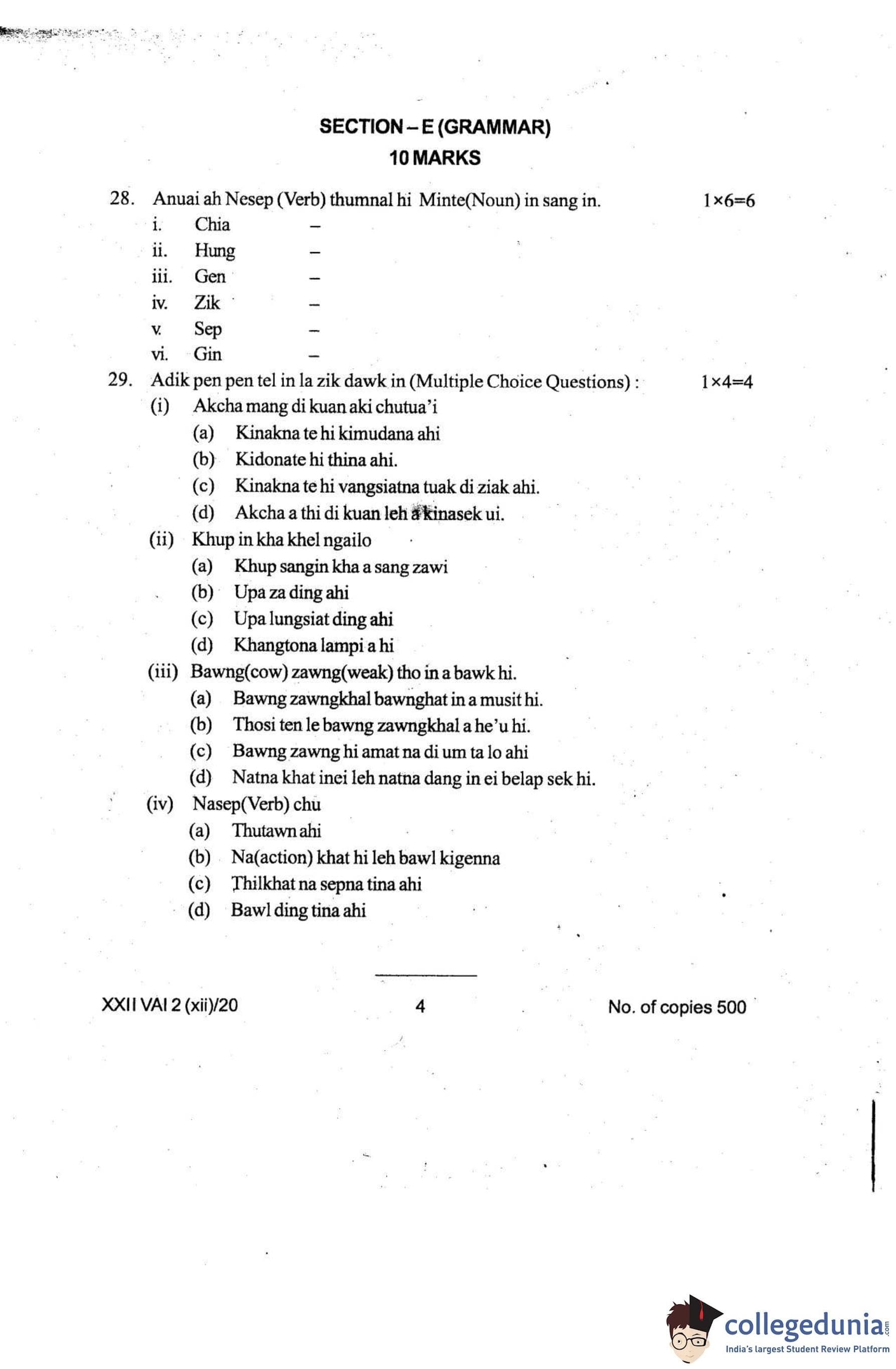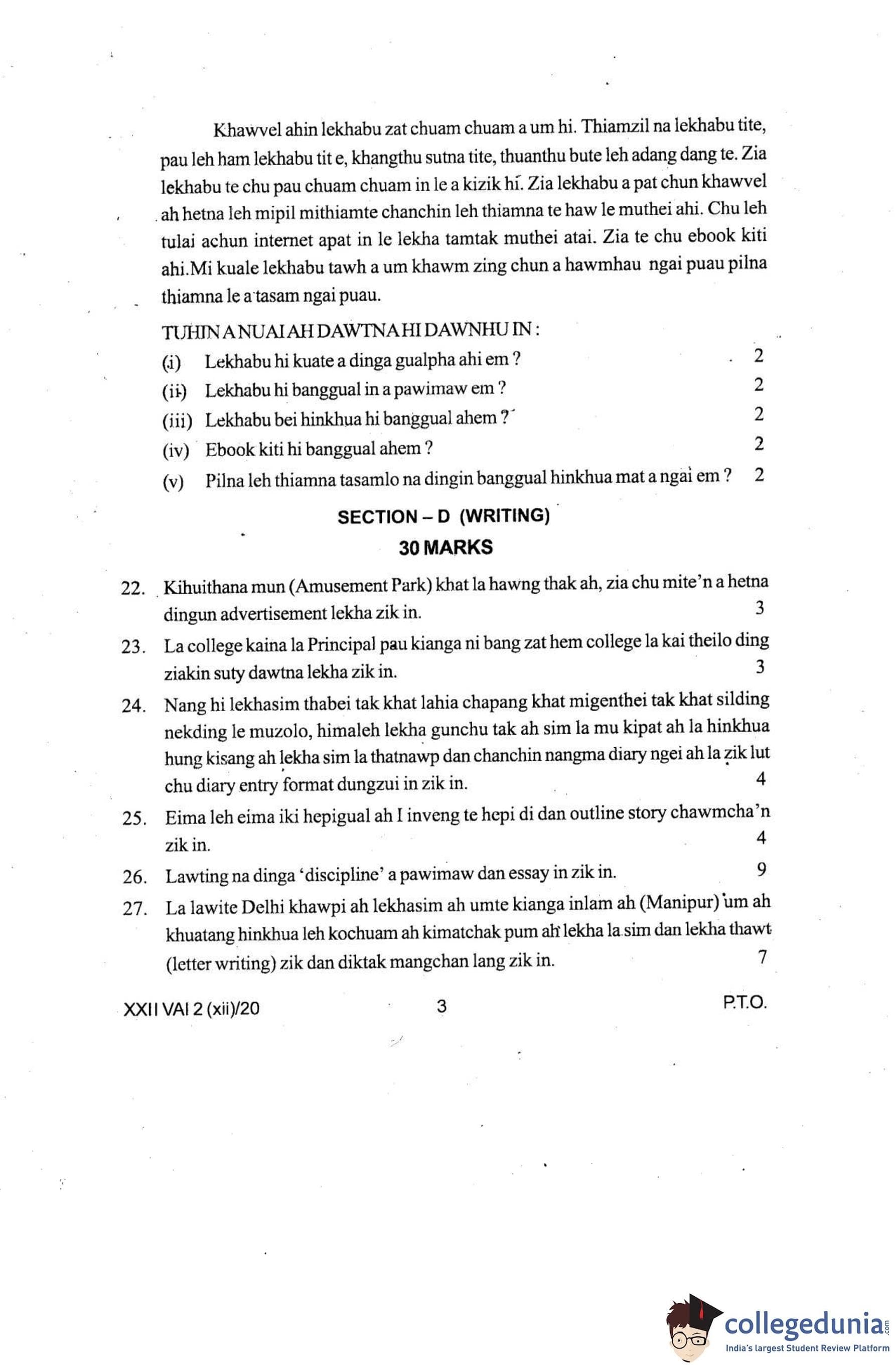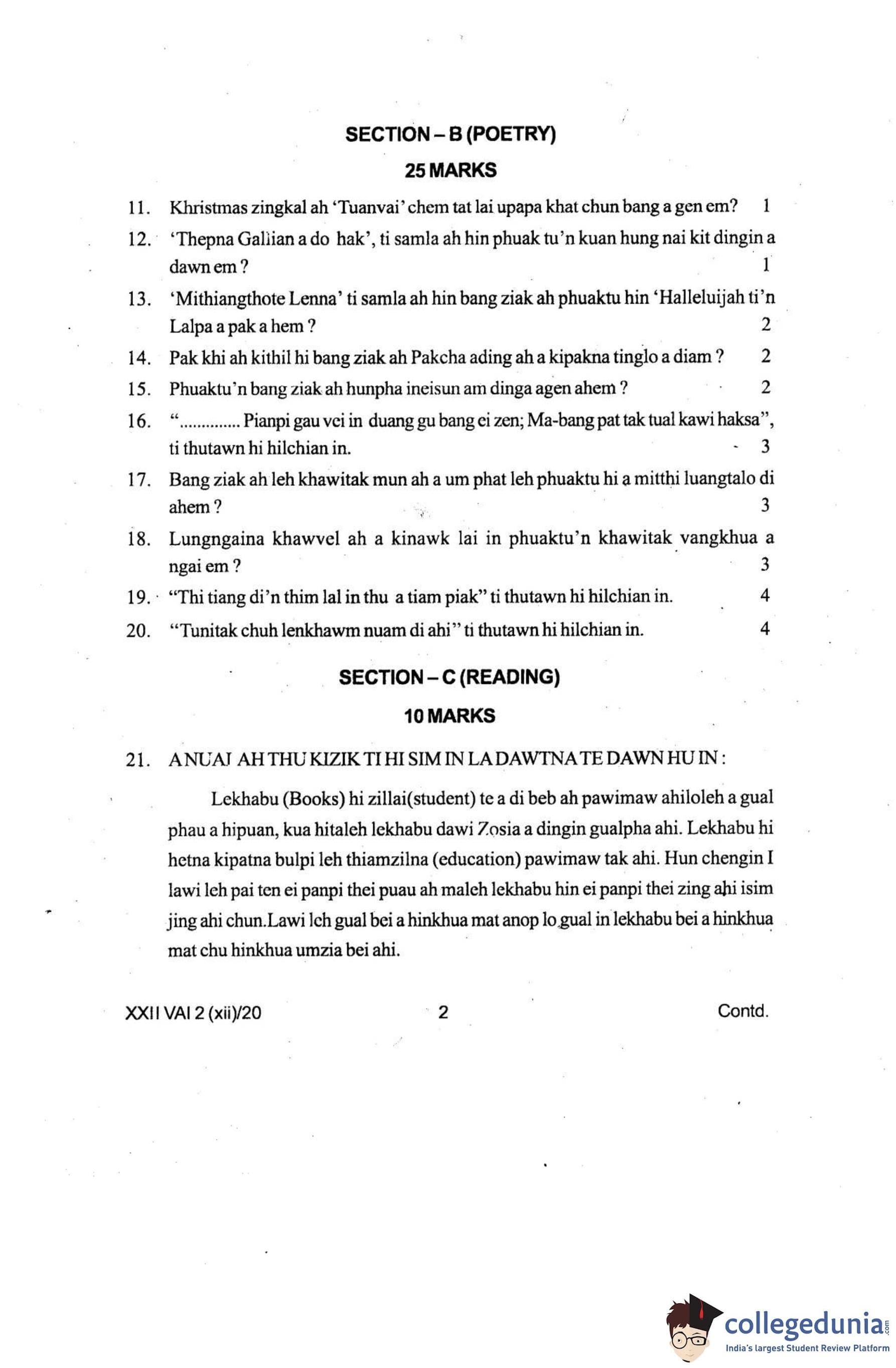 Manipur Board Class 12 Vaiphei Question Paper 2020