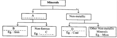 - Other Non-metallic Minerals: These include minerals used in non-metallic applications like mica, which is essential in electrical industries. Quick Tip: Ferrous minerals are those that contain iron, while non-ferrous minerals do not, and are important in industries such as electronics and construction.