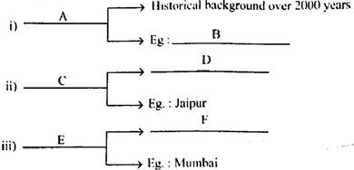 ii) C: Medieval towns \hspace{2cm \text{Eg: Jaipur \hspace{3cm \text{F: Delhi