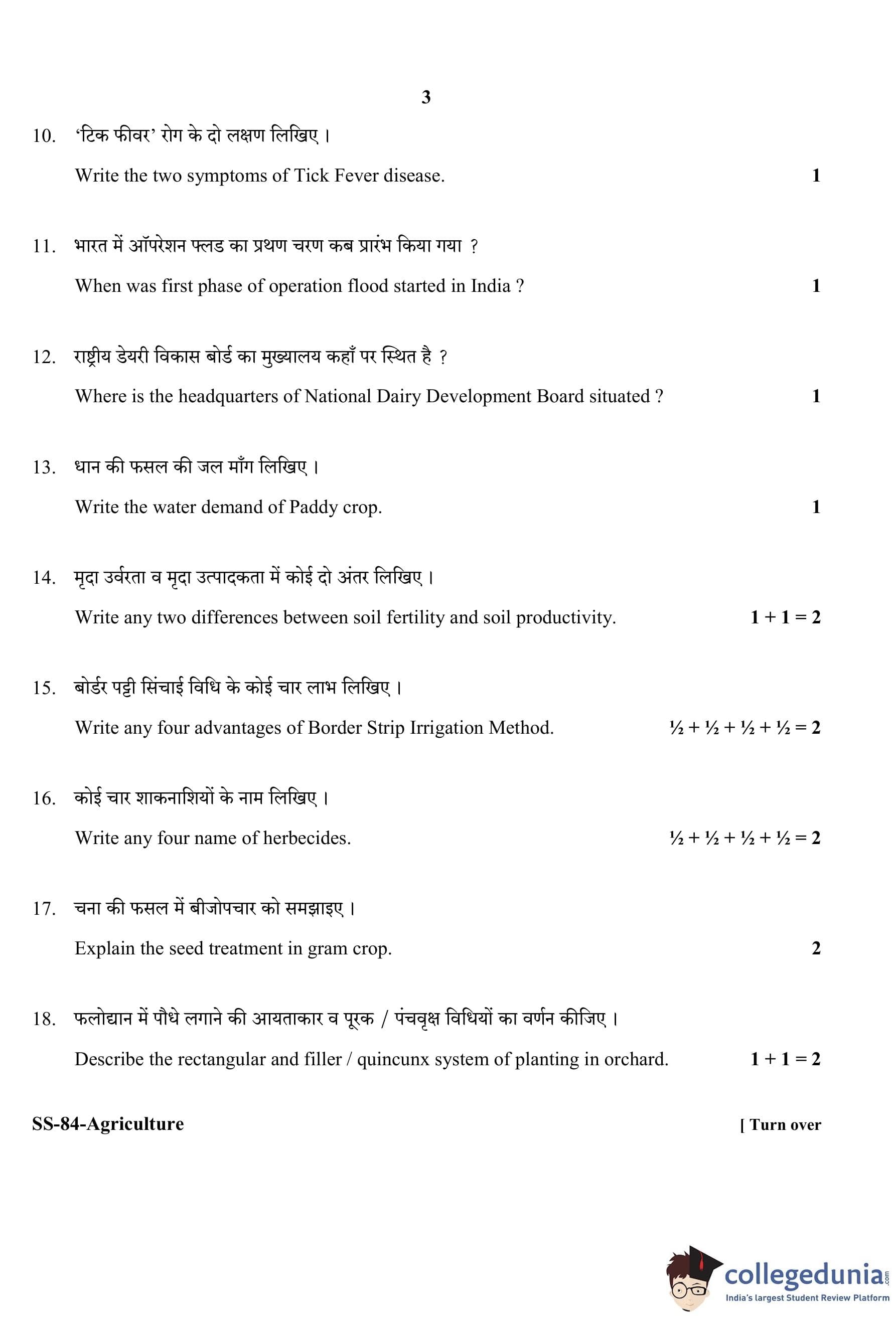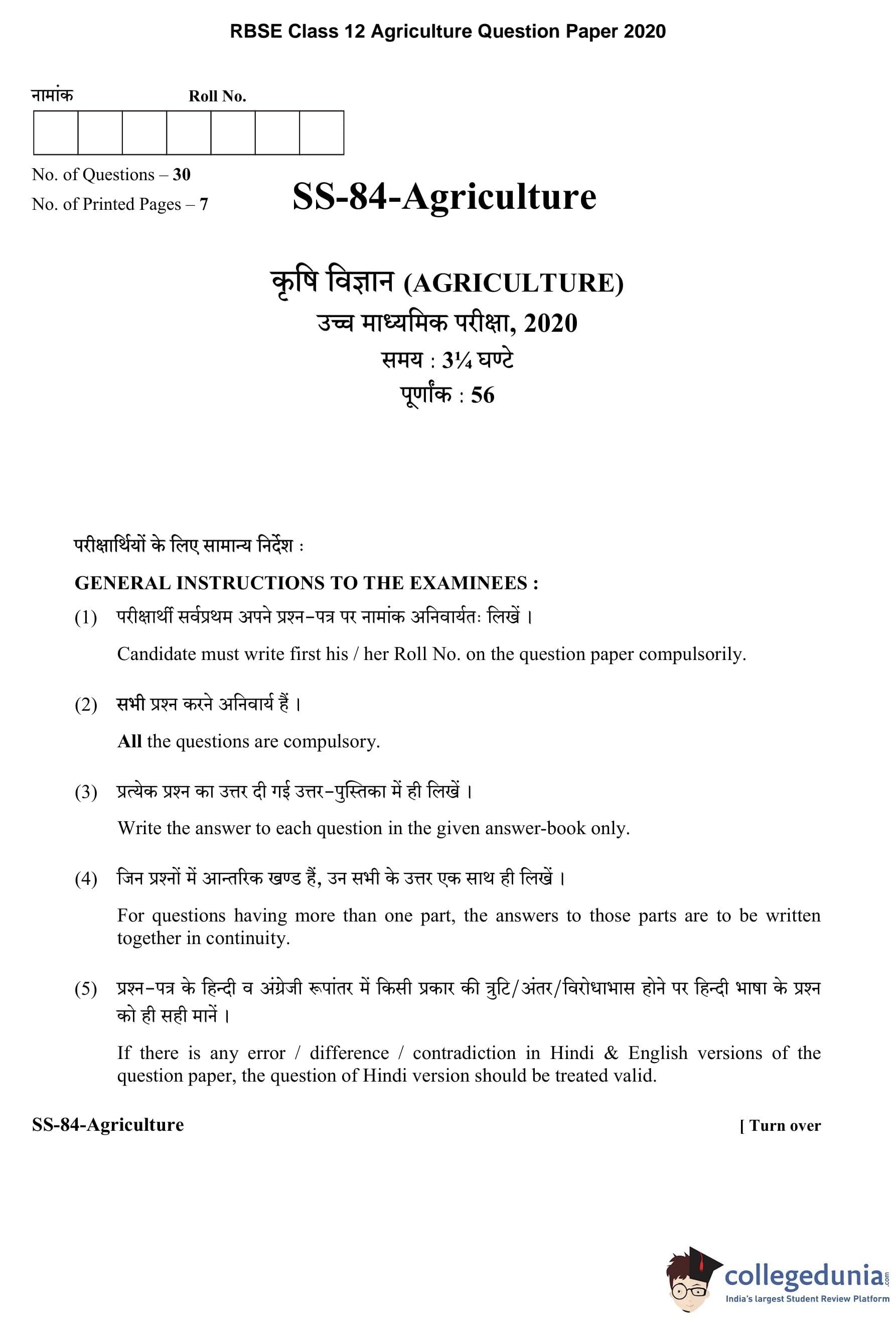 RBSE Class 12 Agriculture Question Paper 2020 with Answer Key pdf is available for download here. The exam was conducted by Board of Secondary Education Rajasthan (BSER) on March 11, 2020 in the Morning Session 8:30 AM to 11:45 AM. The question paper comprised a total of 30 questions.