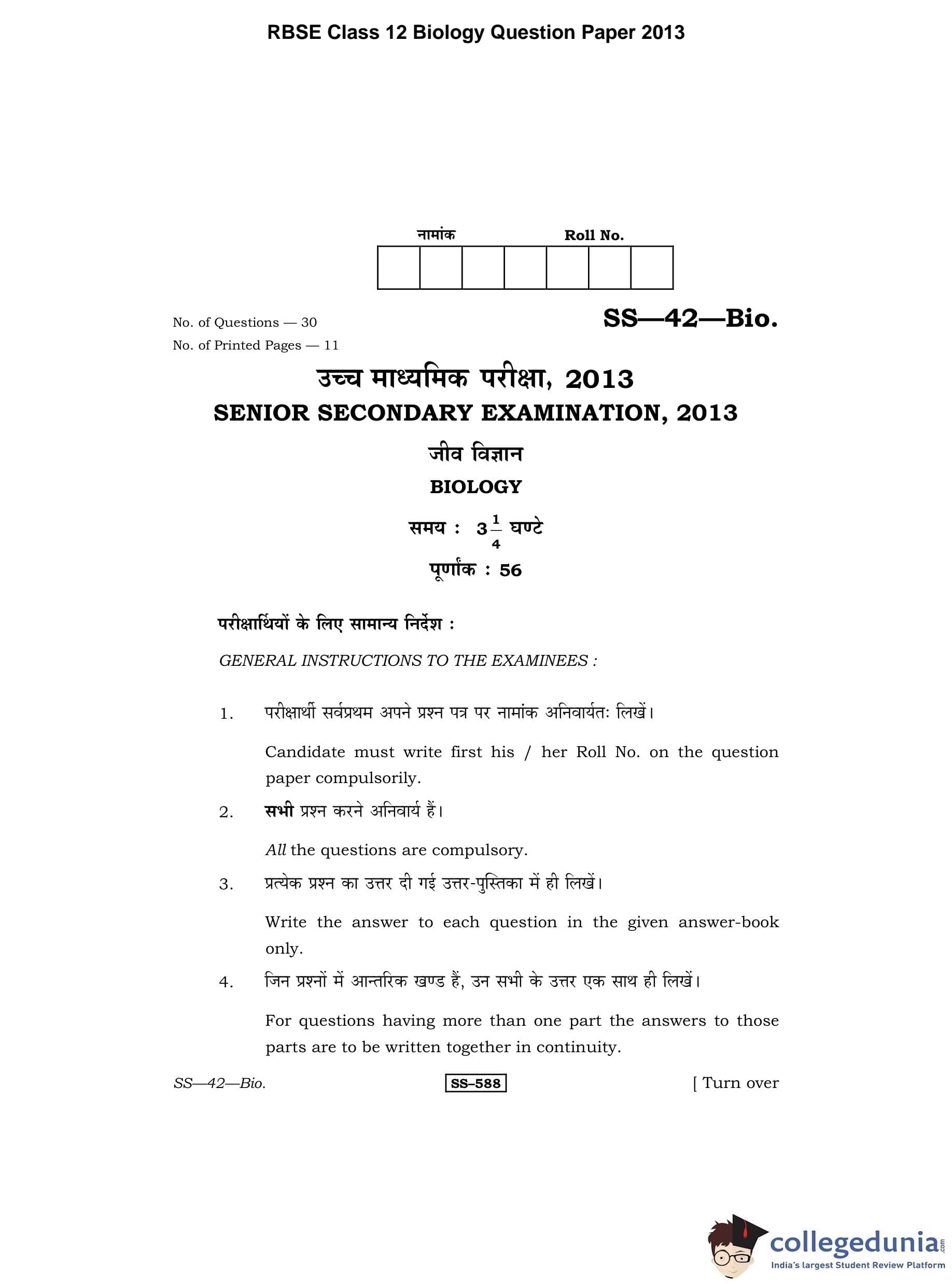 | RBSE Class 12 Biology Question Paper 2013 PDF | RBSE Class 12 Biology Answer Key 2013 PDF |