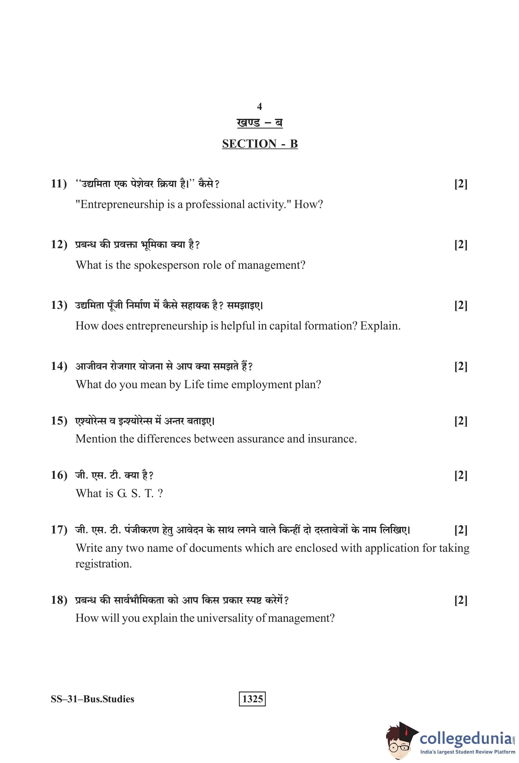 RBSE Class 12 Business Studies Question Paper 2019 with Answer Key pdf is available for download here. The exam was conducted by Board of Secondary Education Rajasthan (BSER) on March 13, 2019 in the Morning Session 8:30 AM to 11:45 AM. The question paper comprised a total of 30 questions divided among 4 sections.