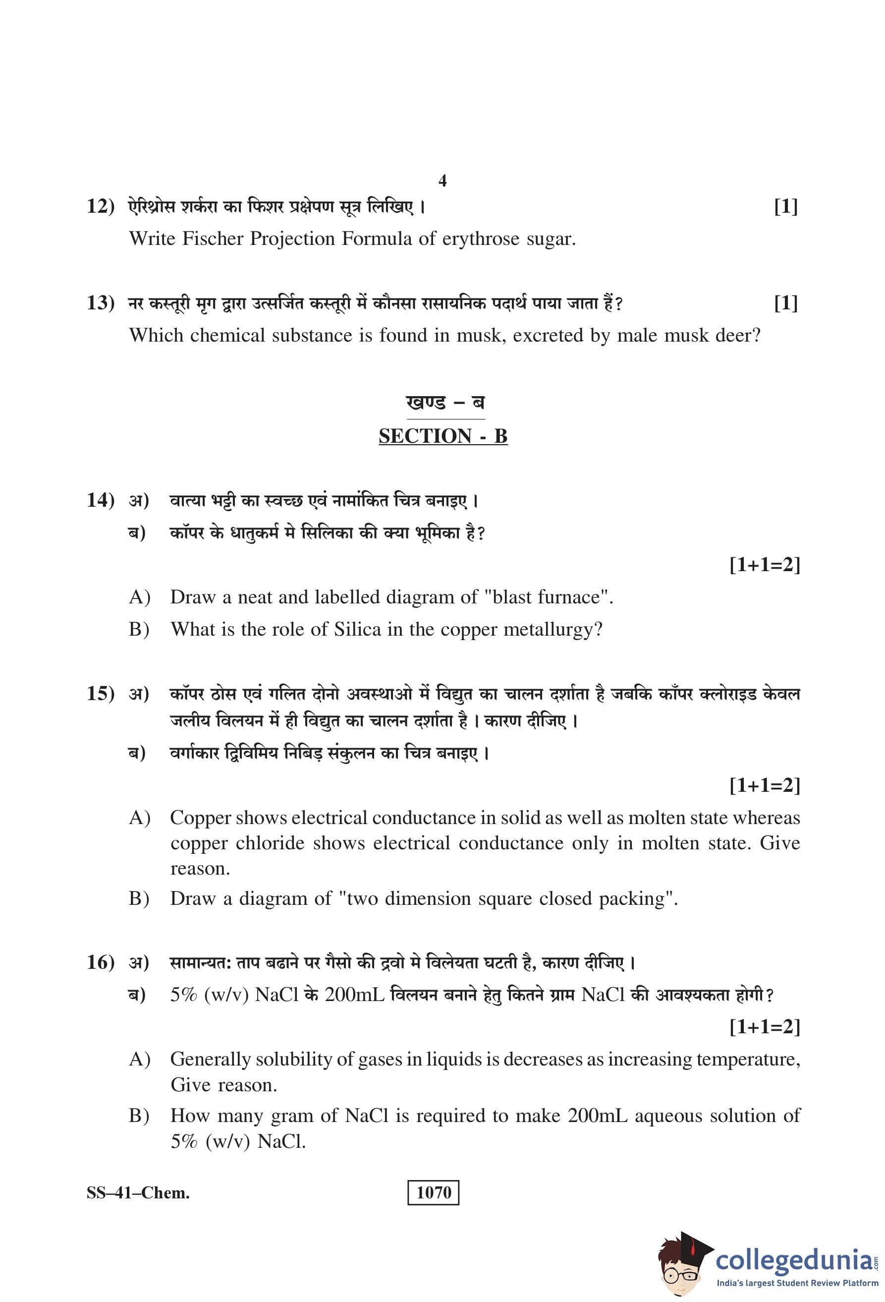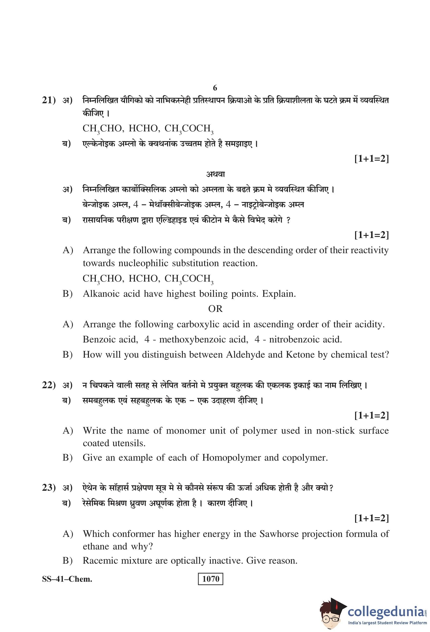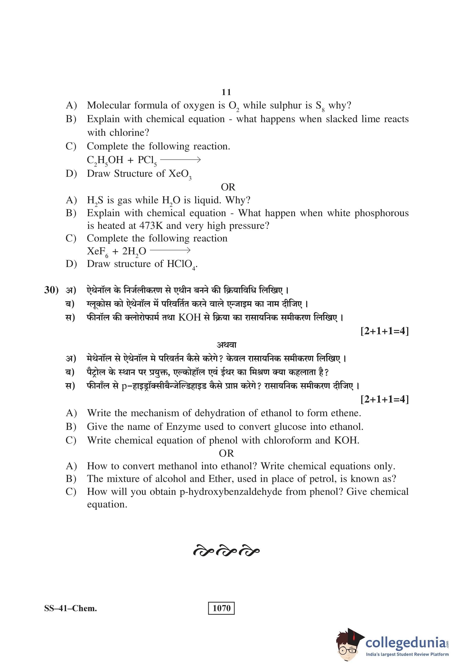 RBSE Class 12 Chemistry Question Paper 2018 with Answer Key pdf is available for download here. The exam was conducted by Board of Secondary Education Rajasthan (BSER) on March 16, 2018 in the Morning Session 8:30 AM to 11:45 AM. The question paper comprised a total of 30 questions divided among 4 sections.
