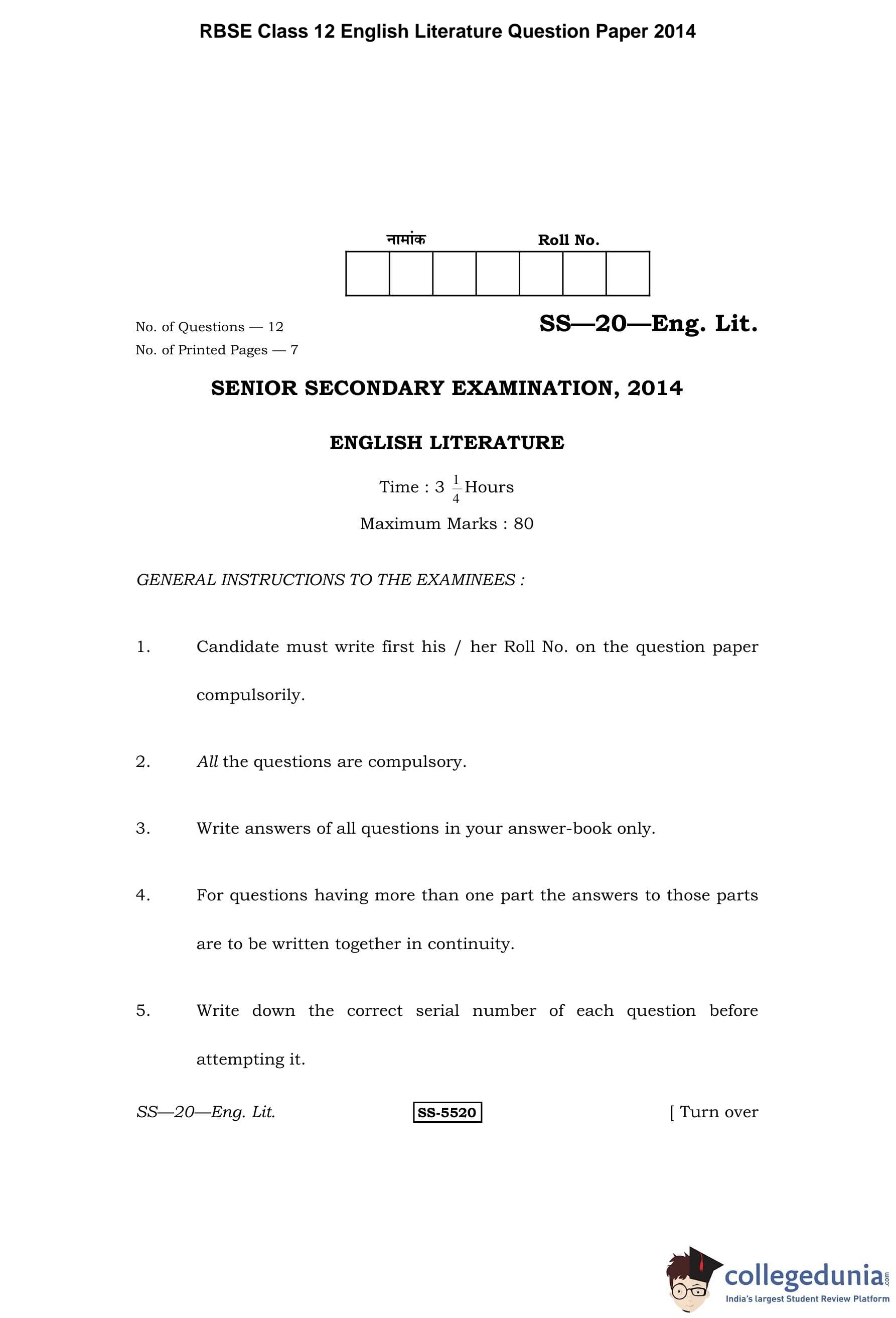 RBSE Class 12 English Literature Question Paper 2014 with Answer Key pdf is available for download here. The exam was conducted by Board of Secondary Education Rajasthan (BSER) on March 19, 2014 in the Morning Session 8:30 AM to 11:45 AM. The question paper comprised a total of 12 questions divided among 5 sections.