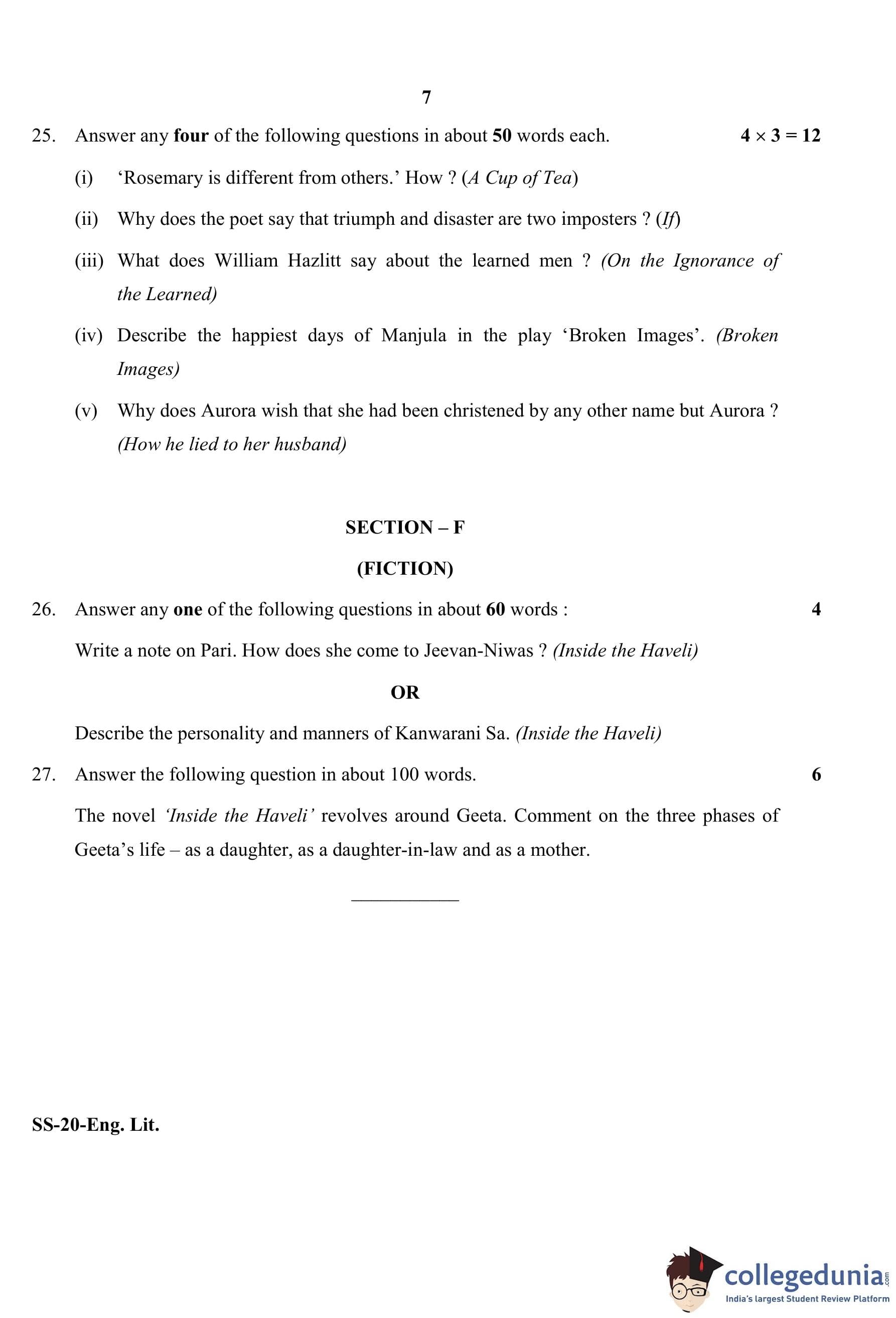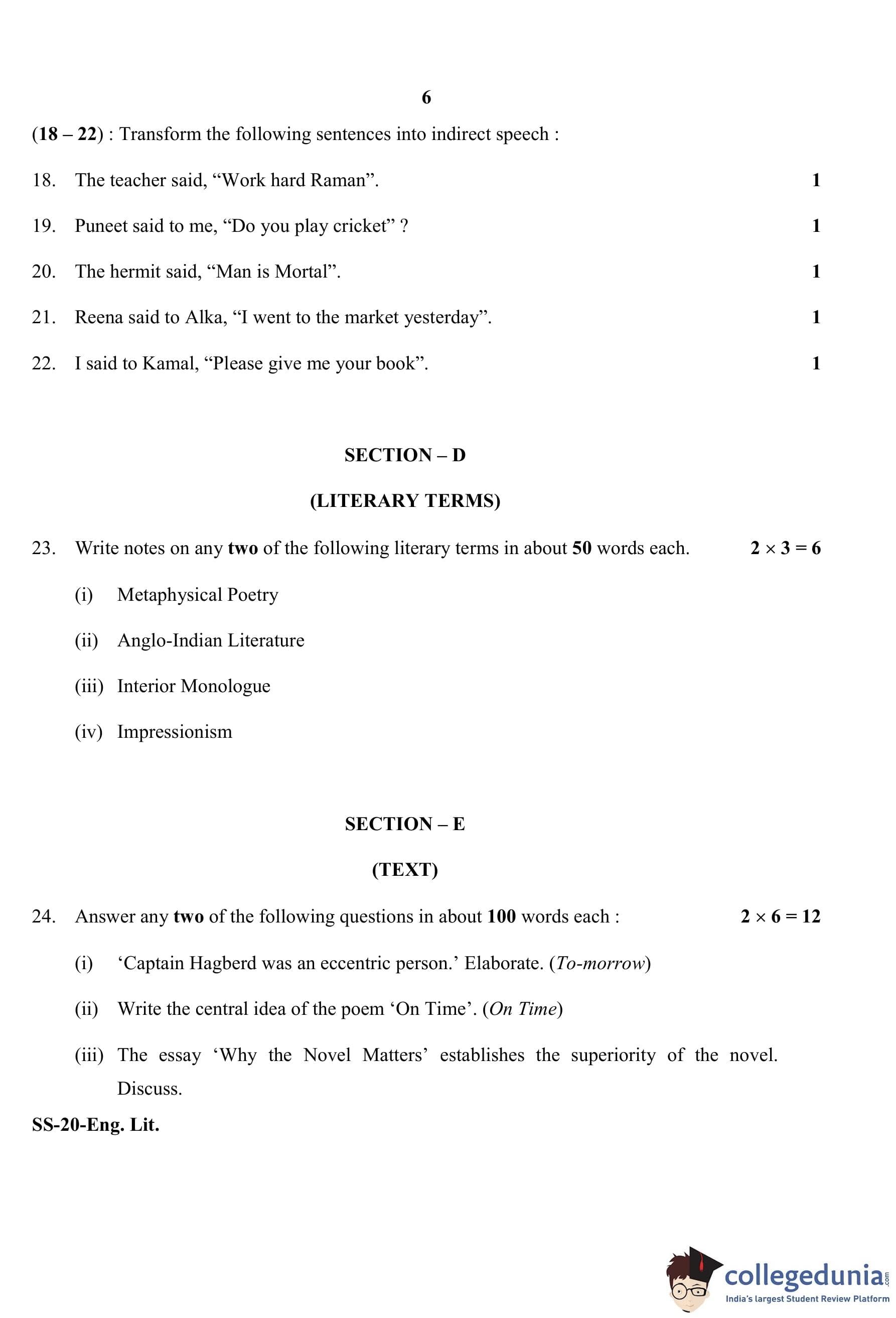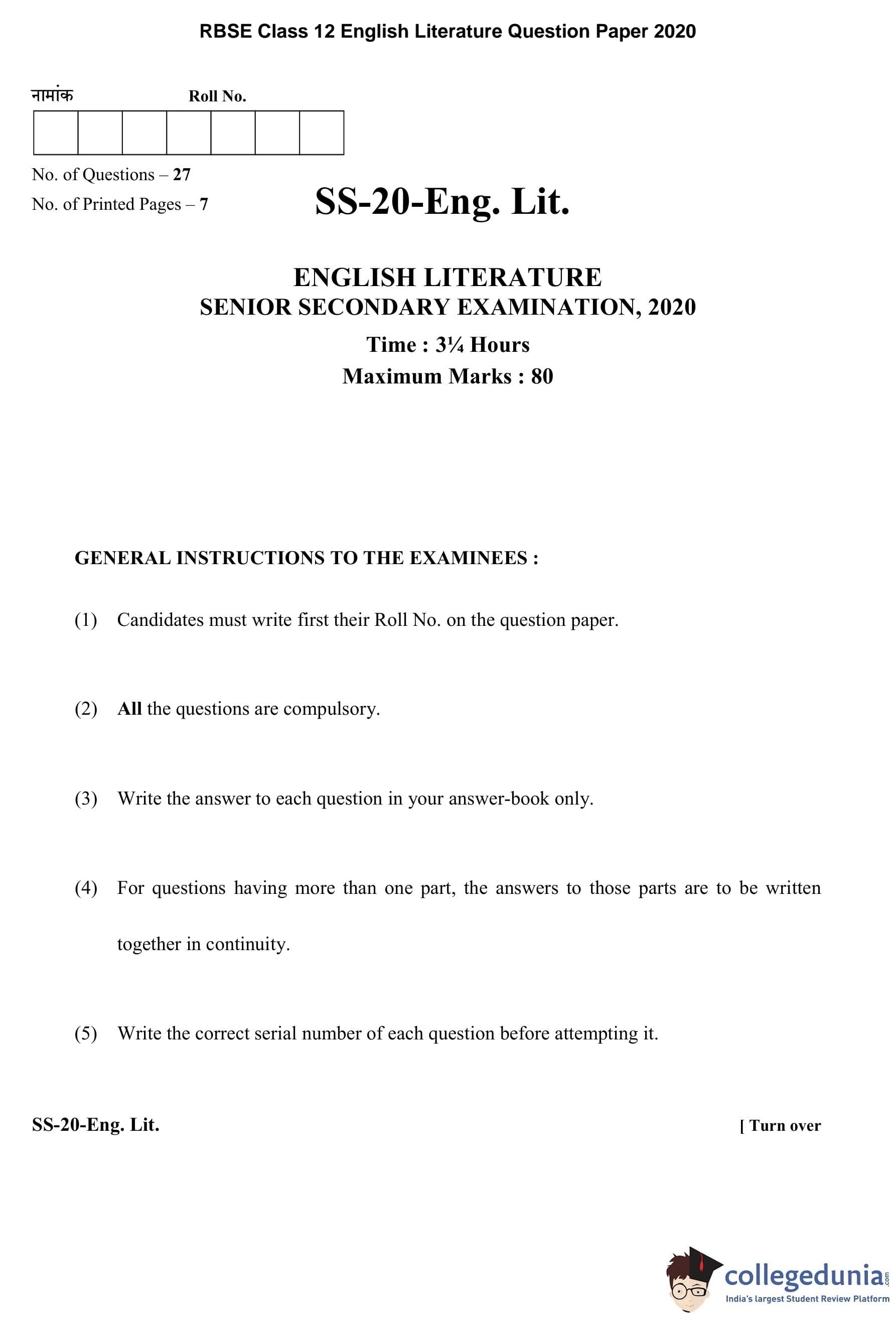 RBSE Class 12 English Literature Question Paper 2020 with Answer Key pdf is available for download here. The exam was conducted by Board of Secondary Education Rajasthan (BSER) on March 27, 2020 in the Morning Session 8:30 AM to 11:45 AM. The question paper comprised a total of 27 questions divided among 6 sections.